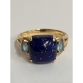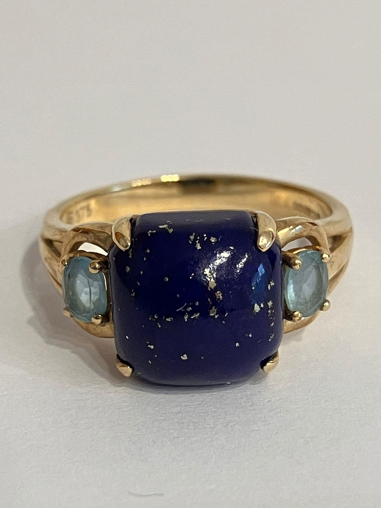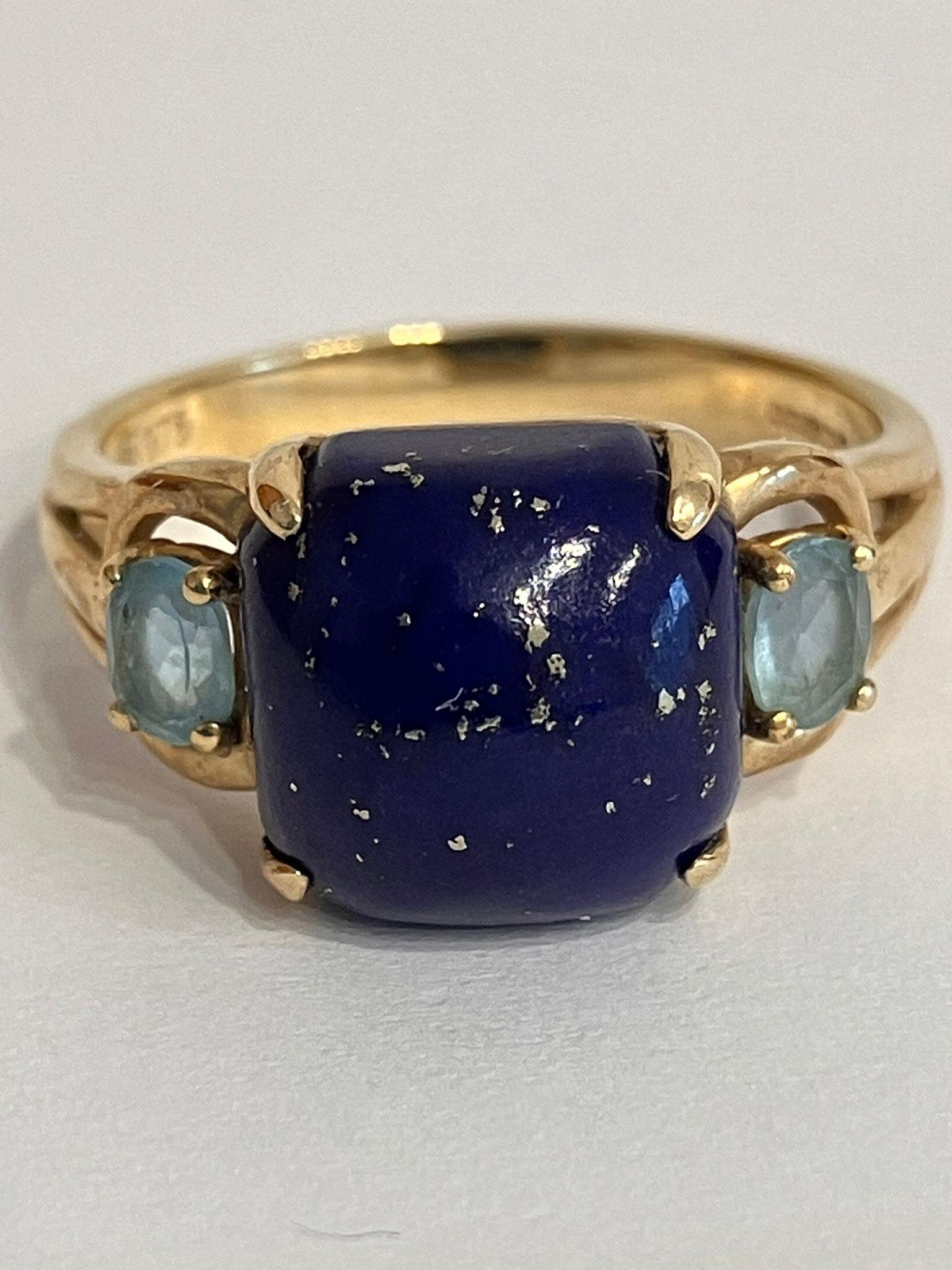 Beautiful 9 carat GOLD and LAPIS LAZULI RING. Having a large polished LAPIS GEMSTONE set to top Flanked with BLUE TOPAZ to both sides. Attractive Gold openwork shoulders. Full UK hallmark and presented in jewellers ring box. 3.39 grams.Size N.
