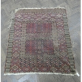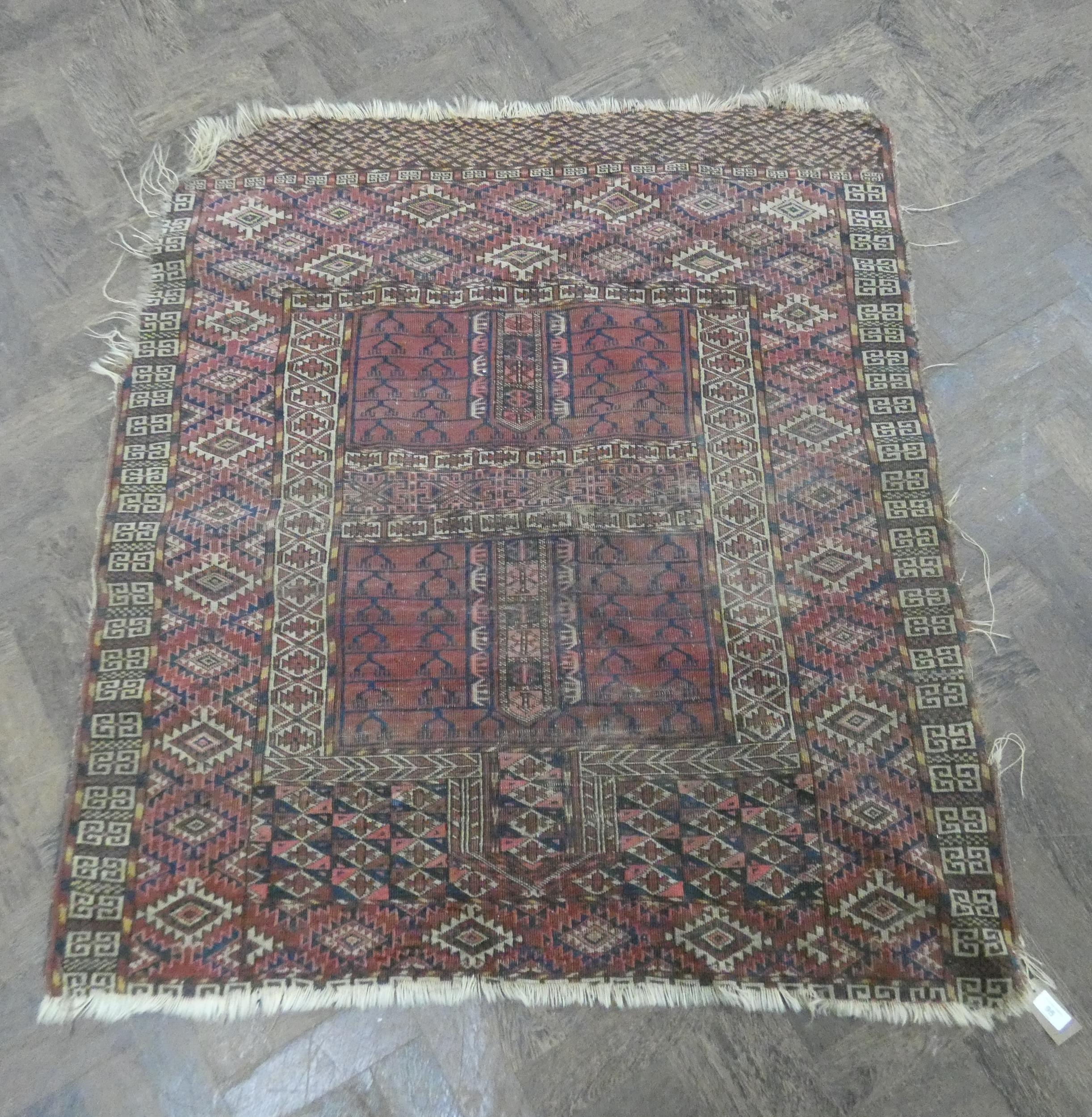 A square red and patterned Persian rug