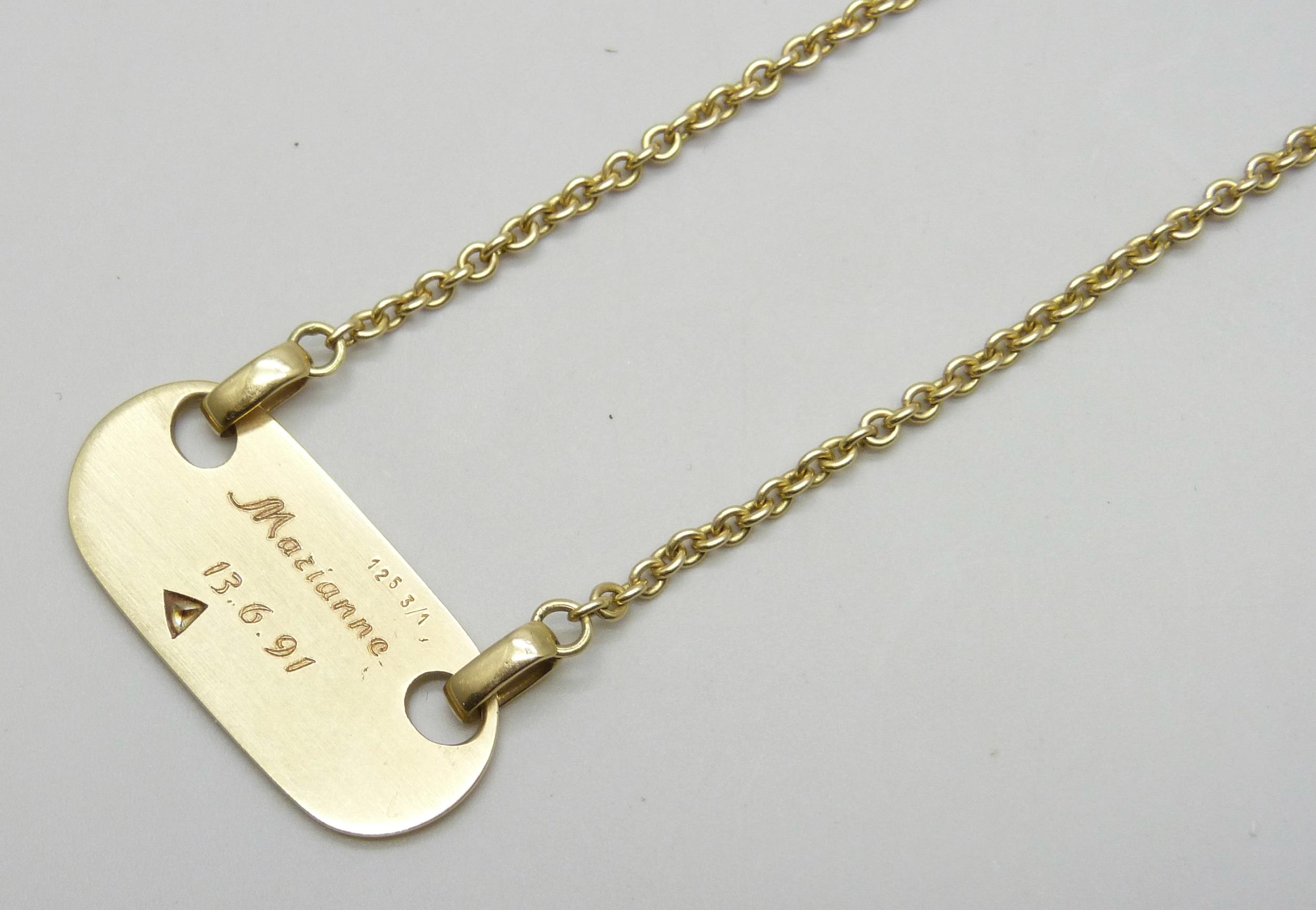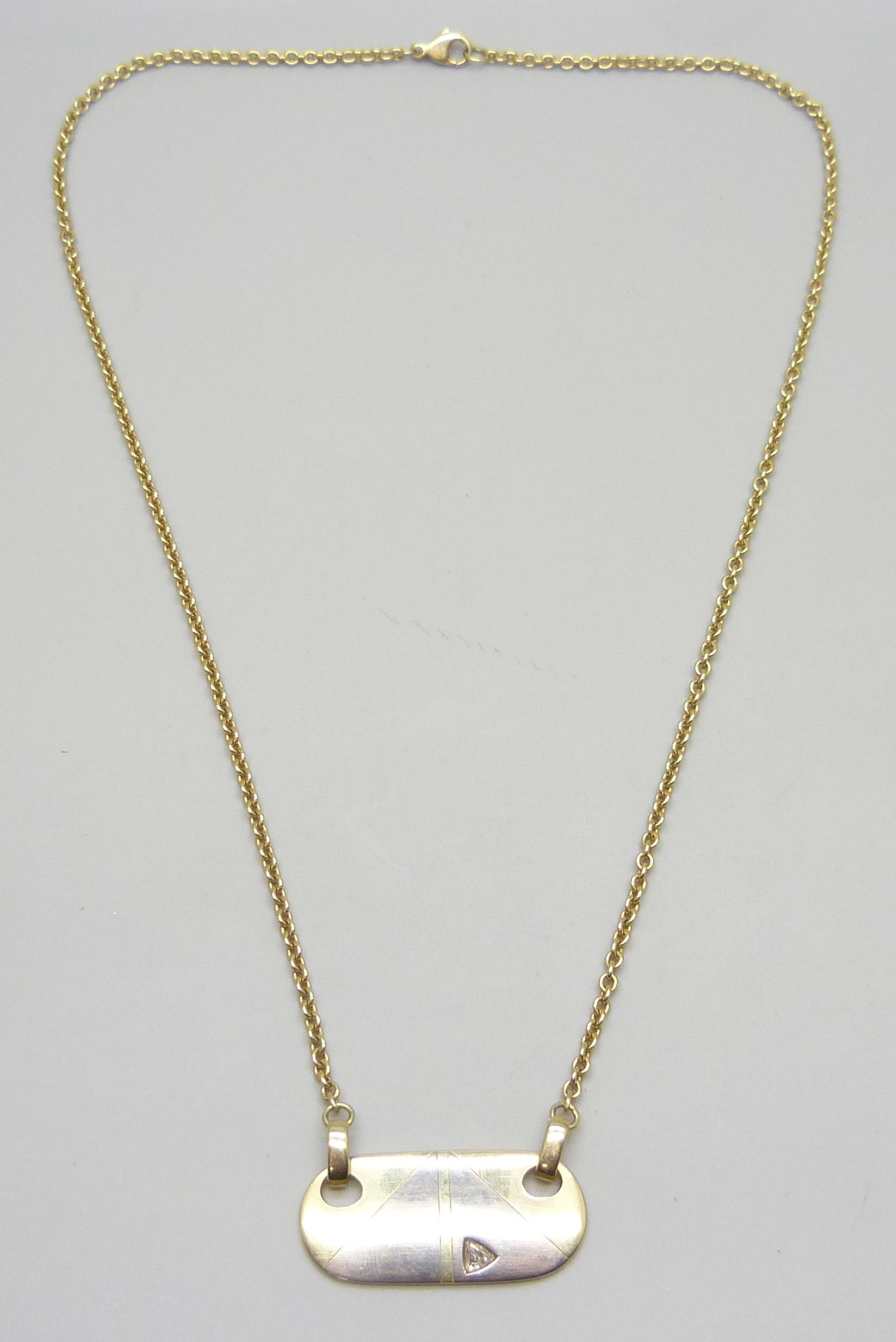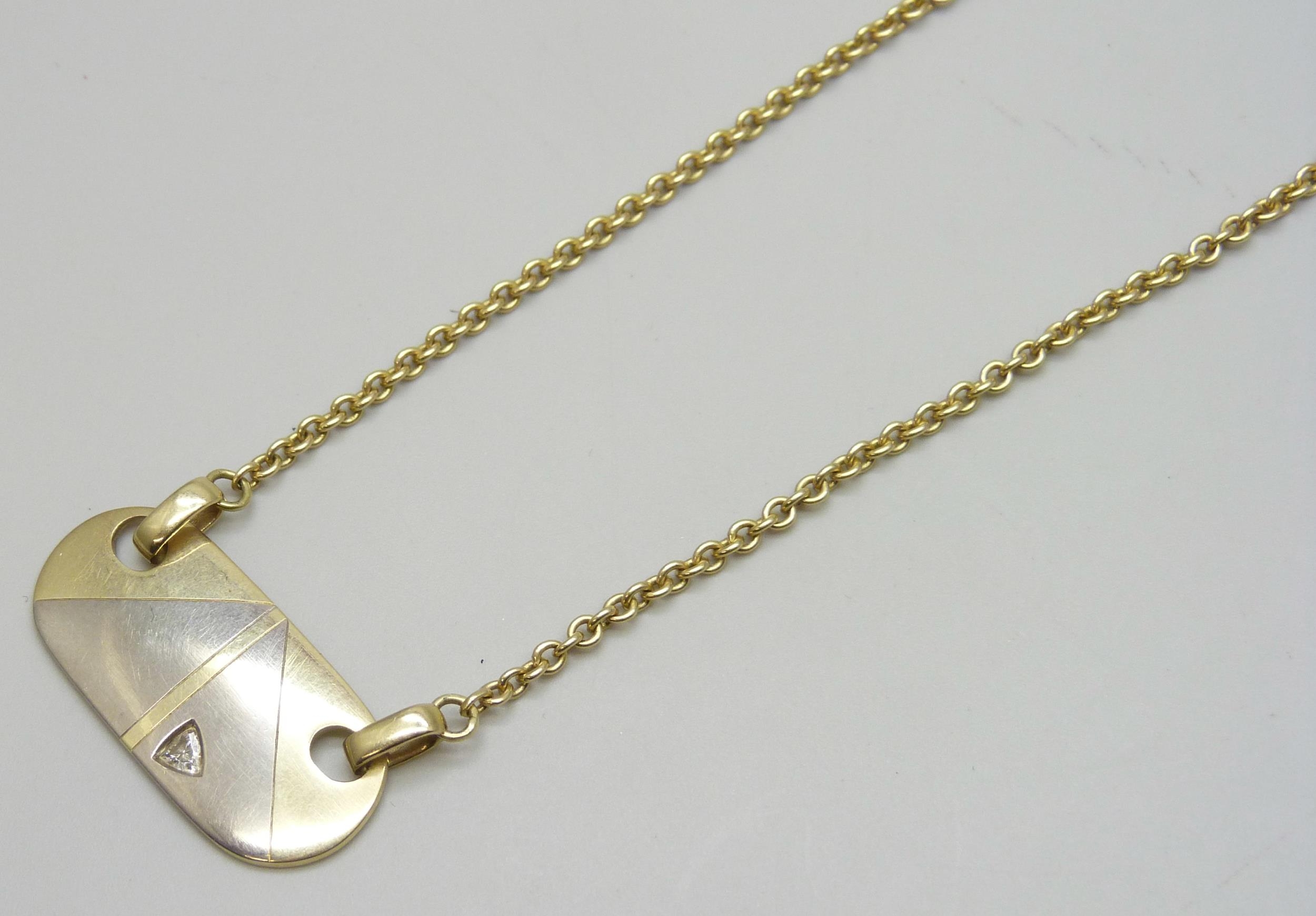 A 14ct gold geometric necklace, the two tone pendant set with a diamond, inscription verso, 21.4g, 54.5cm