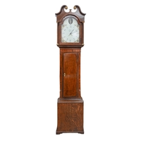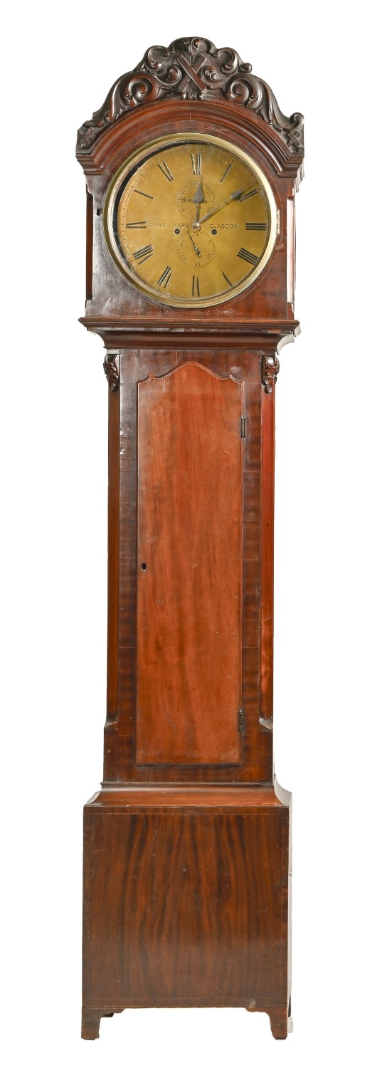 A Scottish Victorian mahogany eight-day longcase clock, Samuel Ward, Glasgow, the round dial with twin subsidiary dials, the movement striking on coiled wire gong, in figured case with saltaire centred carved pediment, 226cm h, pendulum and weights