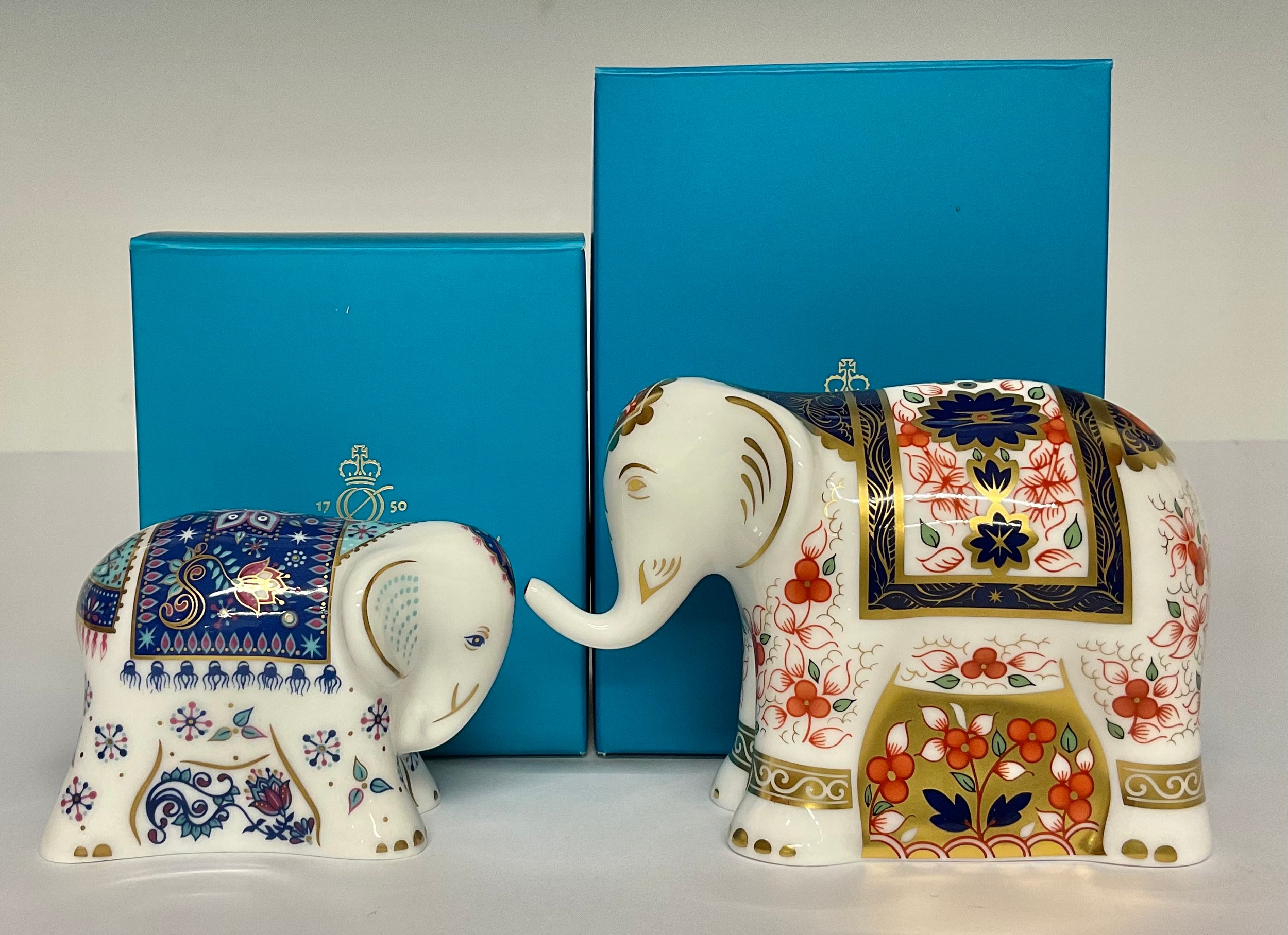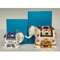 A Royal Crown Derby paperweight, Imari Elephant Infant, decorated in the 1128 pattern, gold stopper, 8cm high, printed mark in red, boxed; another, Sitara Baby Elephant, gold stopper, 5.5cm high, printed mark in grey, boxed (2)