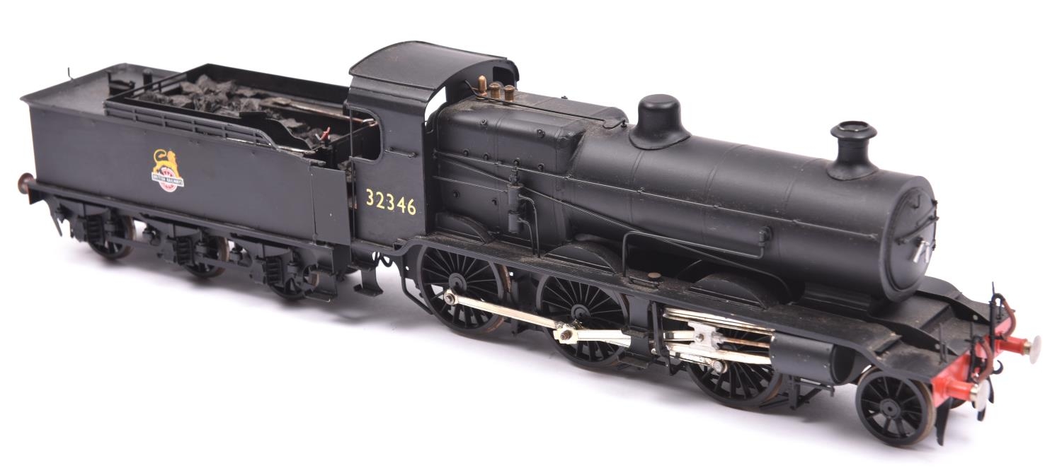An O gauge brass kitbuilt BR K Class 2-6-0 tender locomotive in unlined black livery, 32346 for 2-rail running. With sprung buffers, good cab detailing, etc. VGC. £100-150