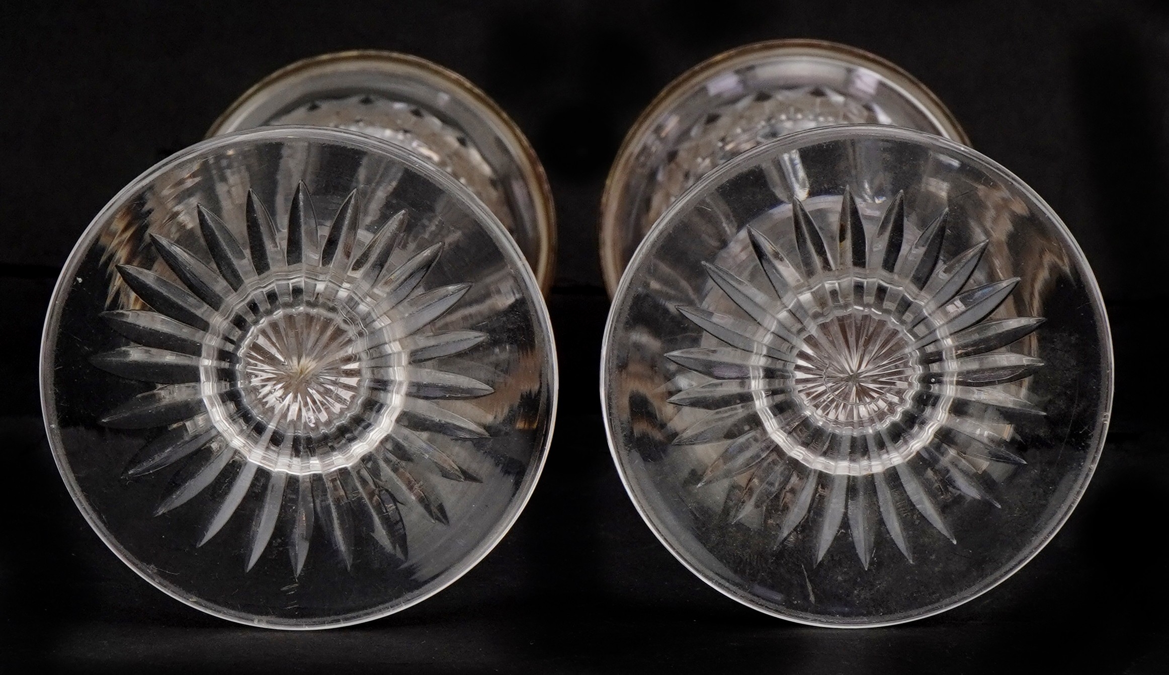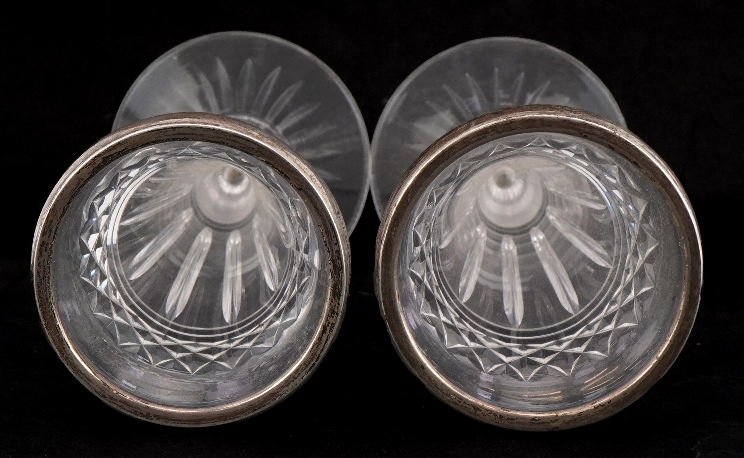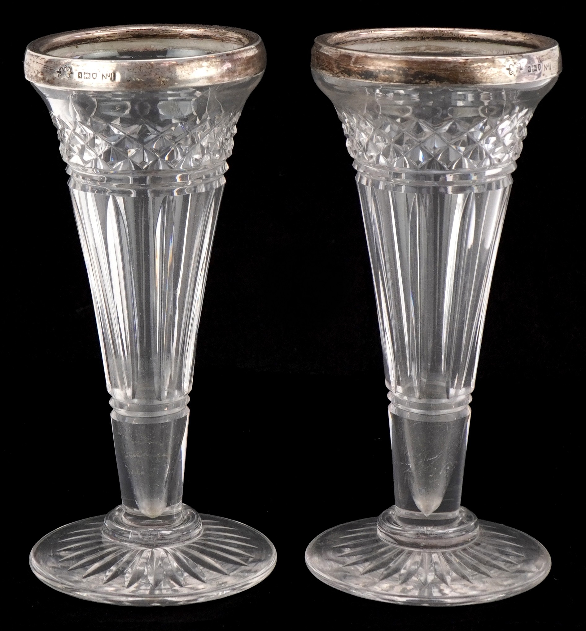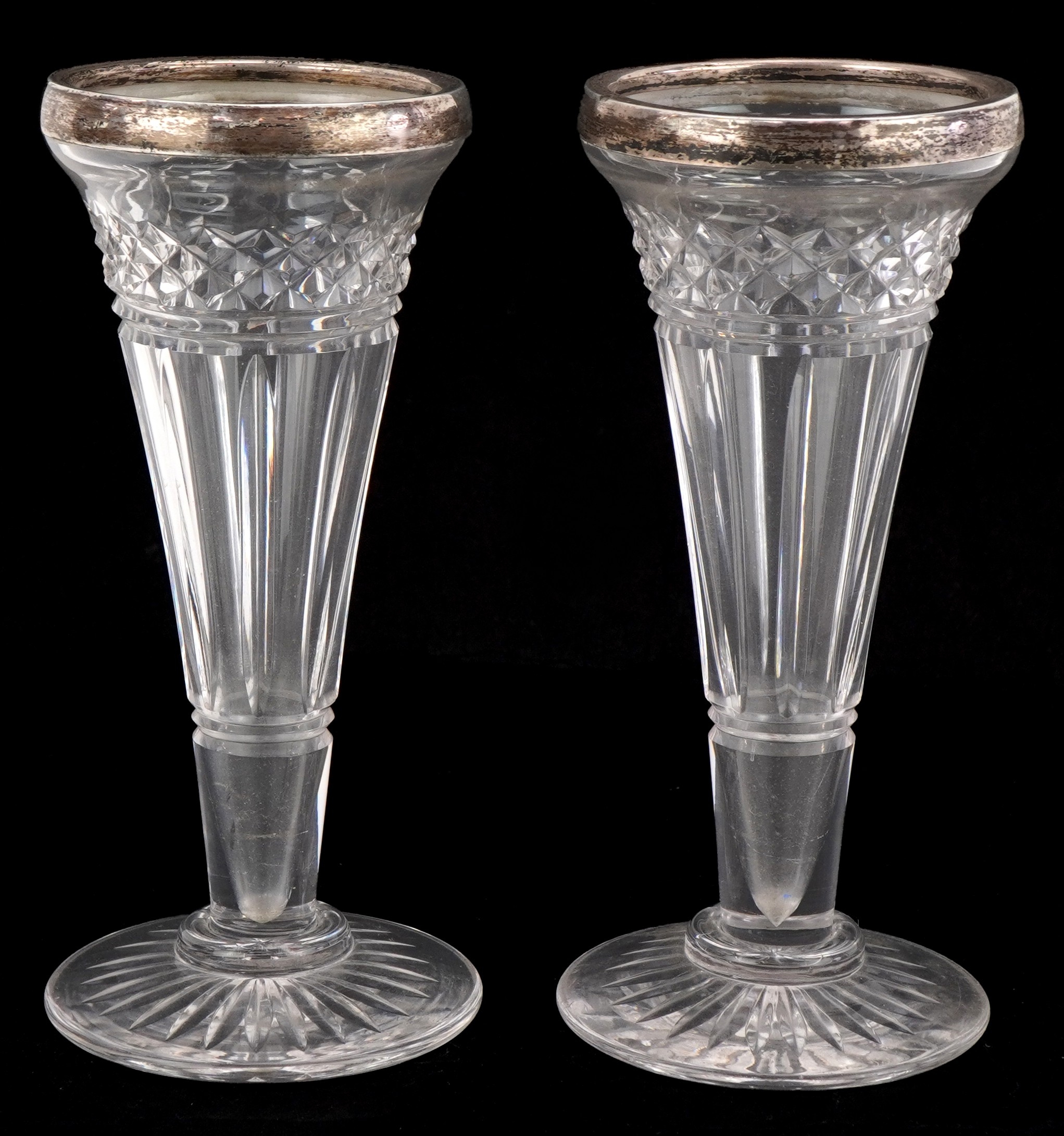 Army & Navy, a pair of Edwardian cut glass spill vases with silver mounts, London 1911, 15cm high.