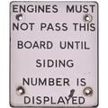 A warning sign, ENGINES MUST NOT PASS THIS BOARD UNTIL SIDING NUMBER IS DISPLAYED, enamel, 12"x14½", chips at fixing holes, etc. (Postage Band: N/A)