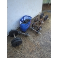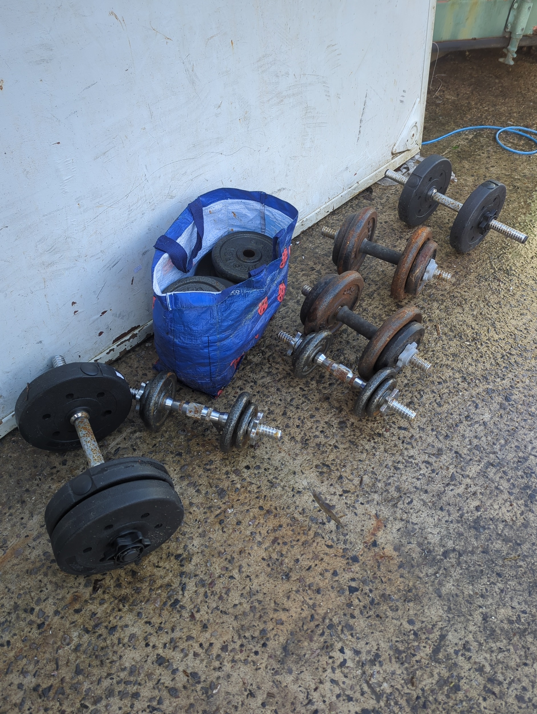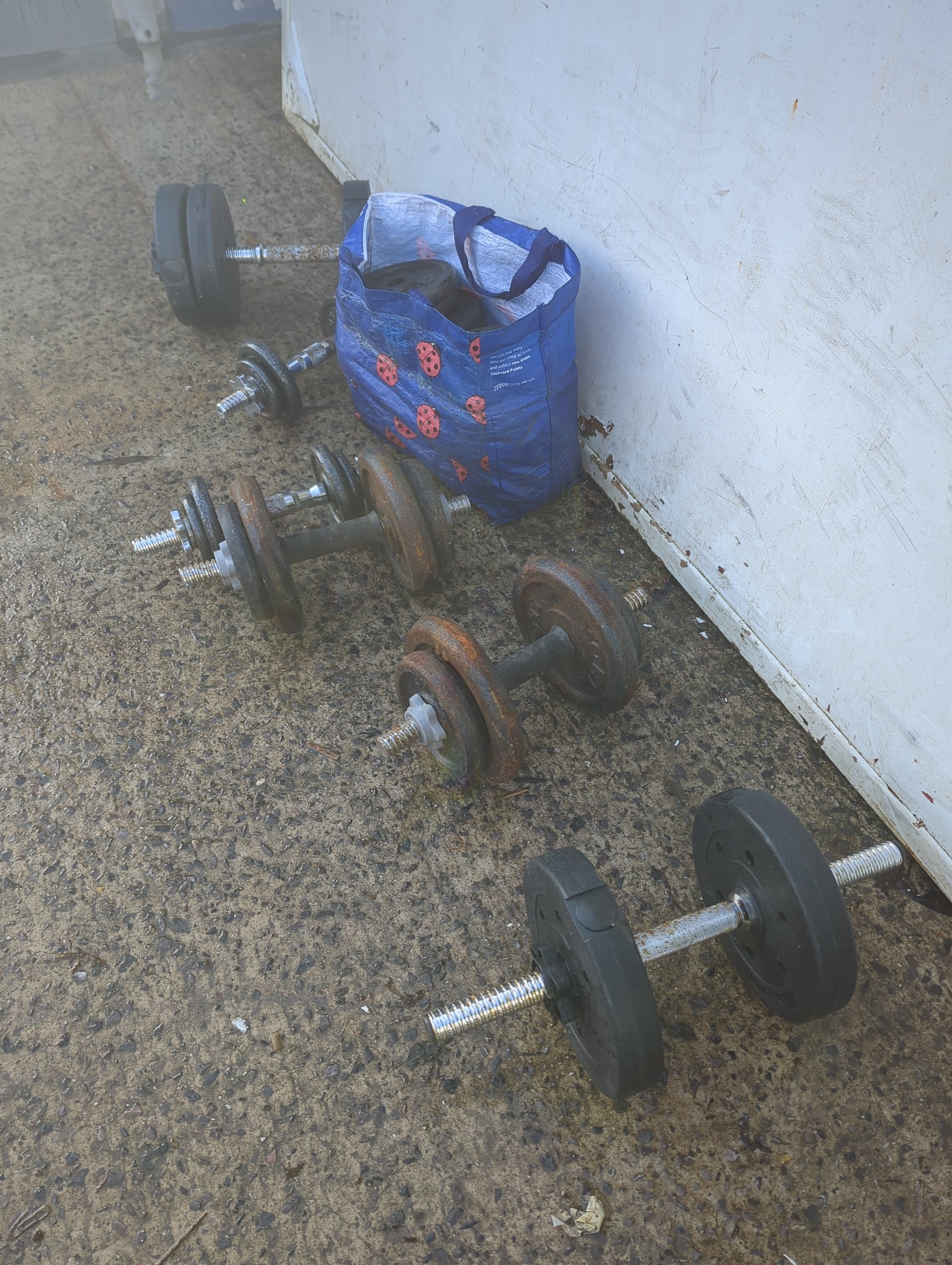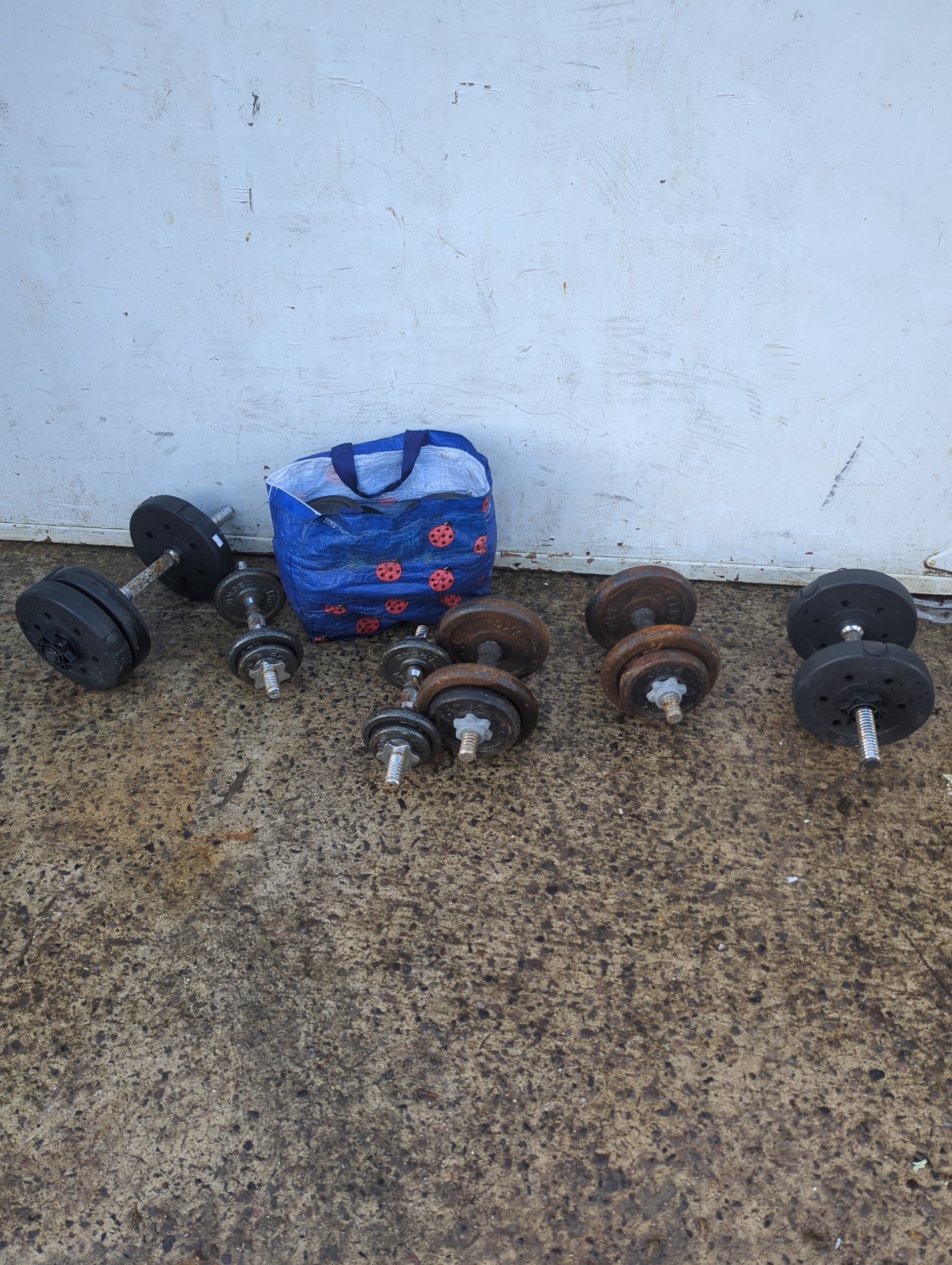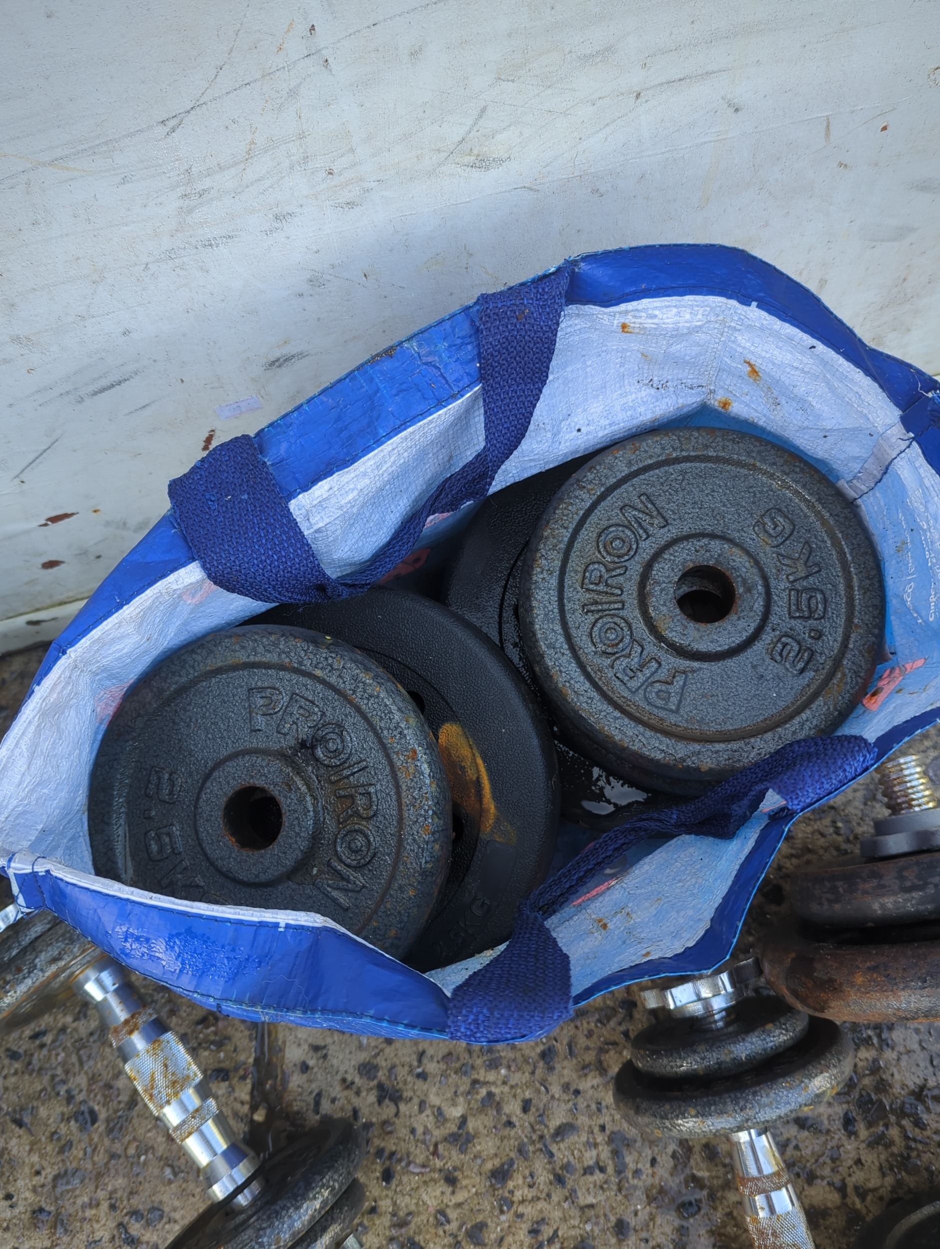 This lot consists of six dumbbells, featuring assorted weights including Proiron 2.5 kg plates. The dumbbells vary in size and appear to have metal bars with some exhibiting noticeable rust and wear. A blue carry bag is included for convenient storage and transportation of the weights. Ideal for home fitness enthusiasts looking for a versatile selection.