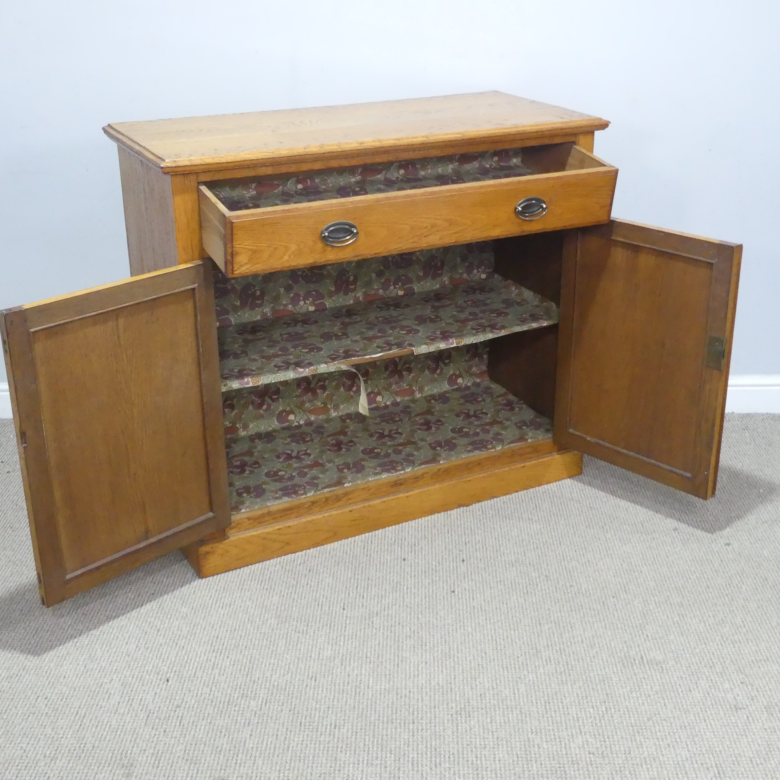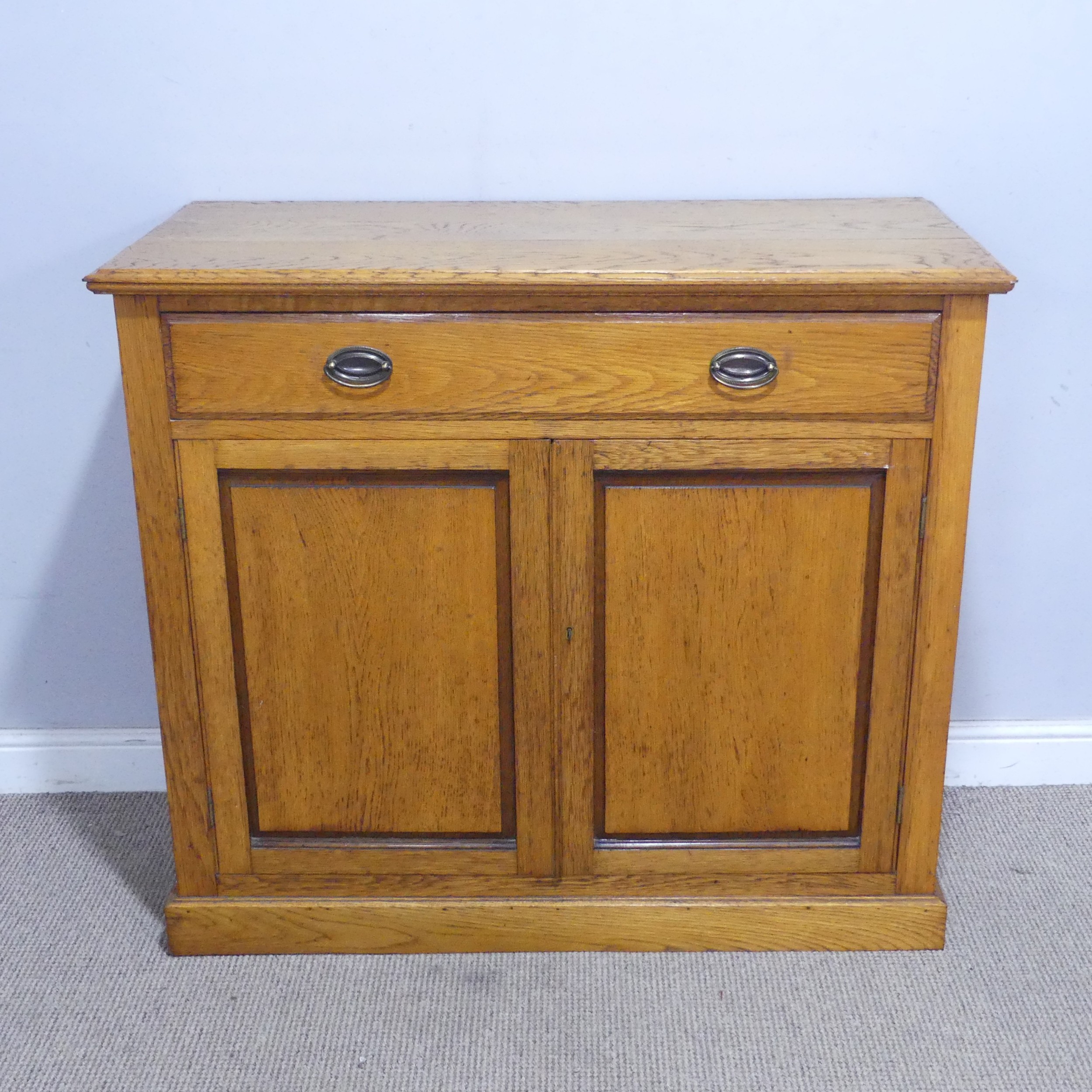 A 20th century oak Cabinet, the moulded top above a singular frieze drawer, raised upon a plinth base, W 106 cm x H 95 cm x D 48 cm. Note, there is a large split to the top on this cabinet, please see images.
