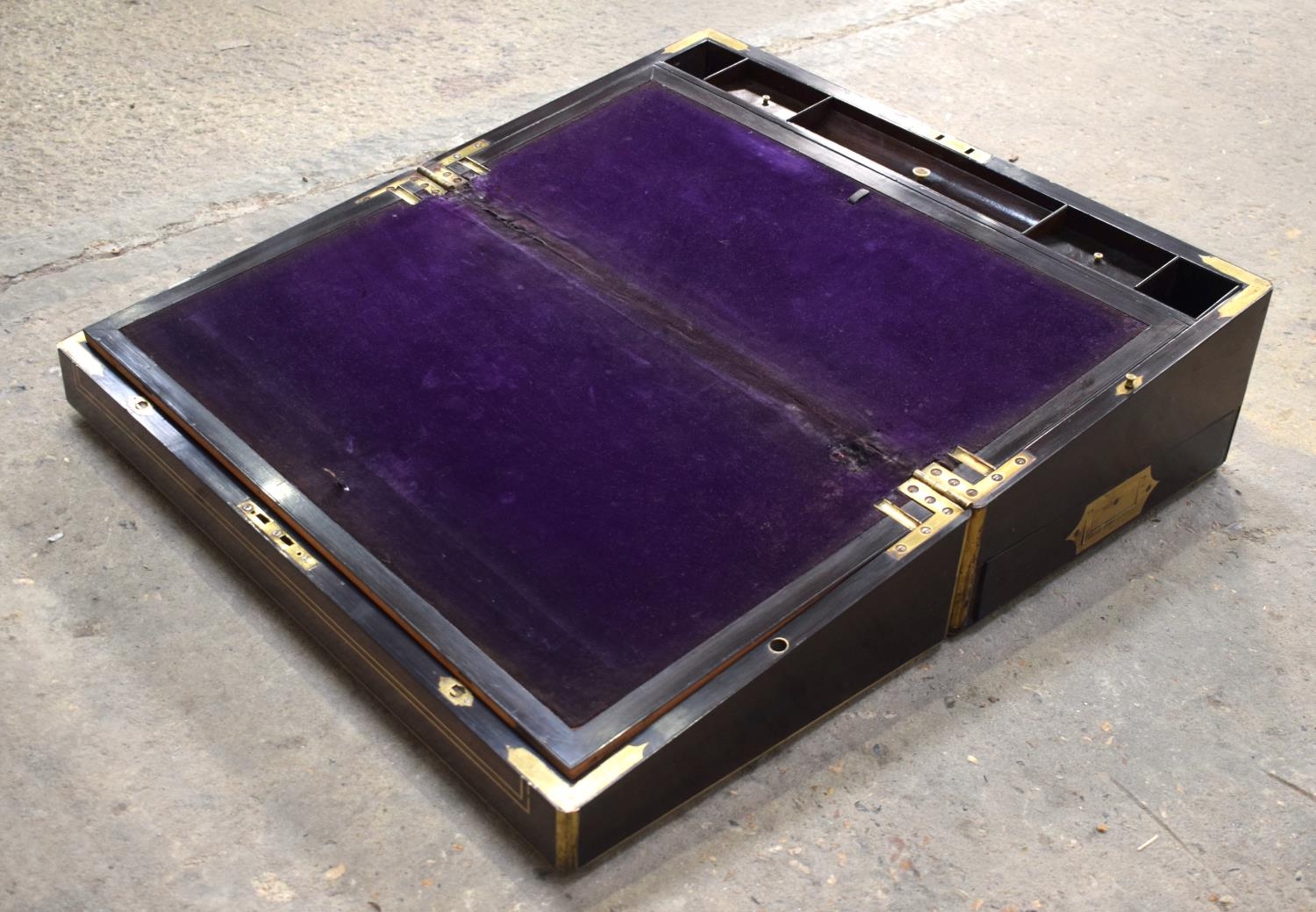 A FINE AND LARGE ANTIQUE CAMPAIGN TRAVELLING WRITING BOX with material slope and fitted interior. 61 cm x 33 cm x 22 cm.