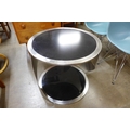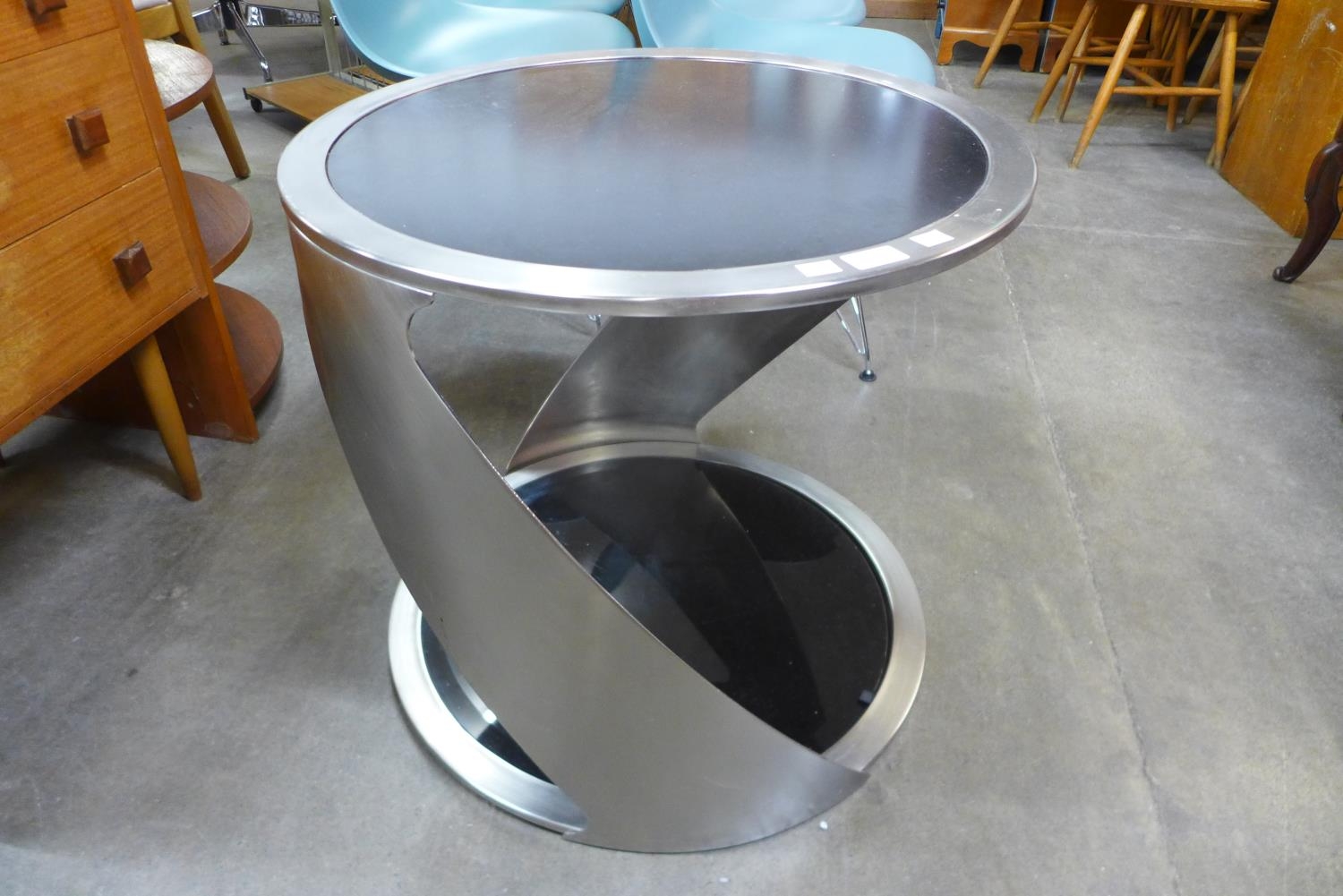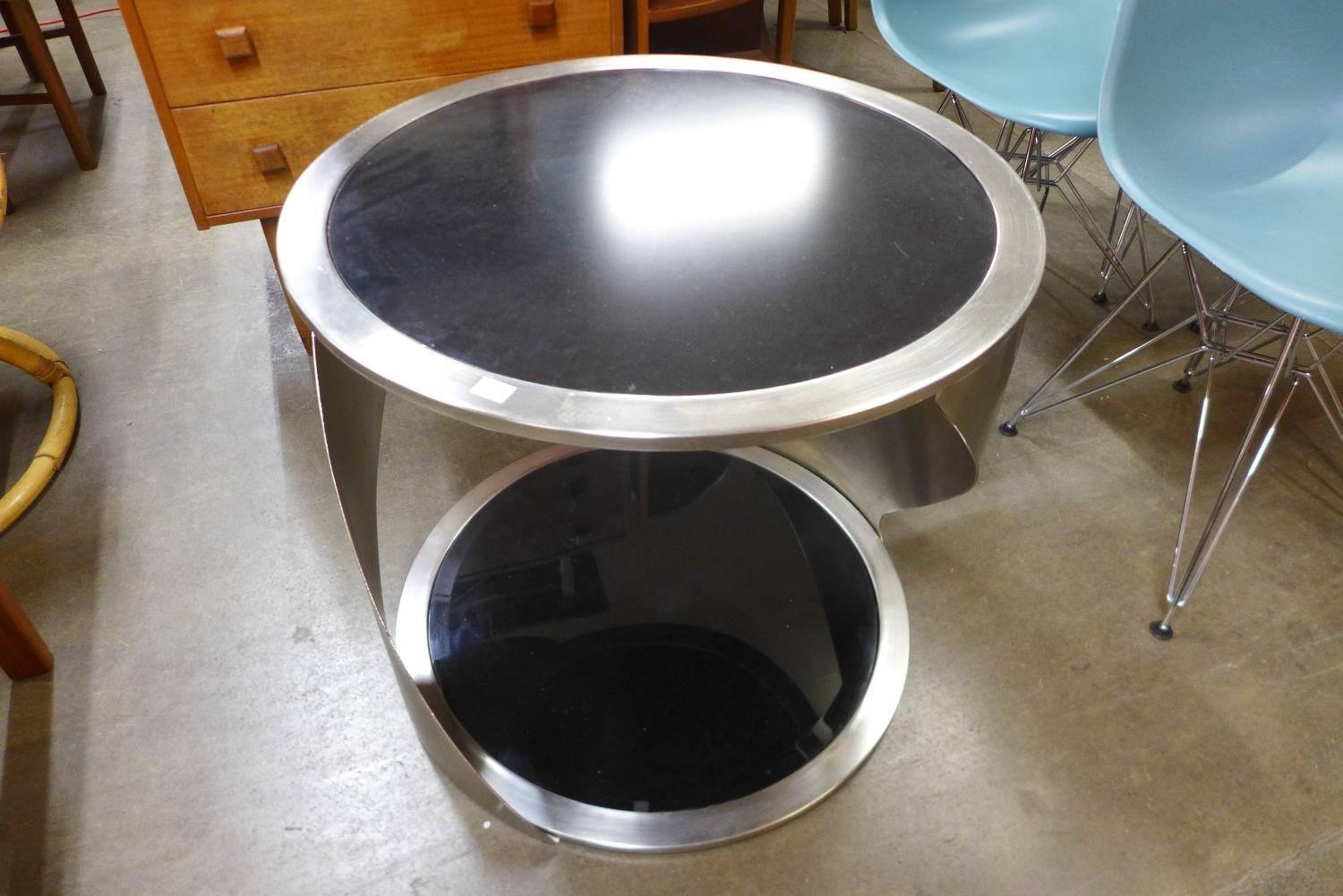 A chrome and black glass circular two tier coffee table