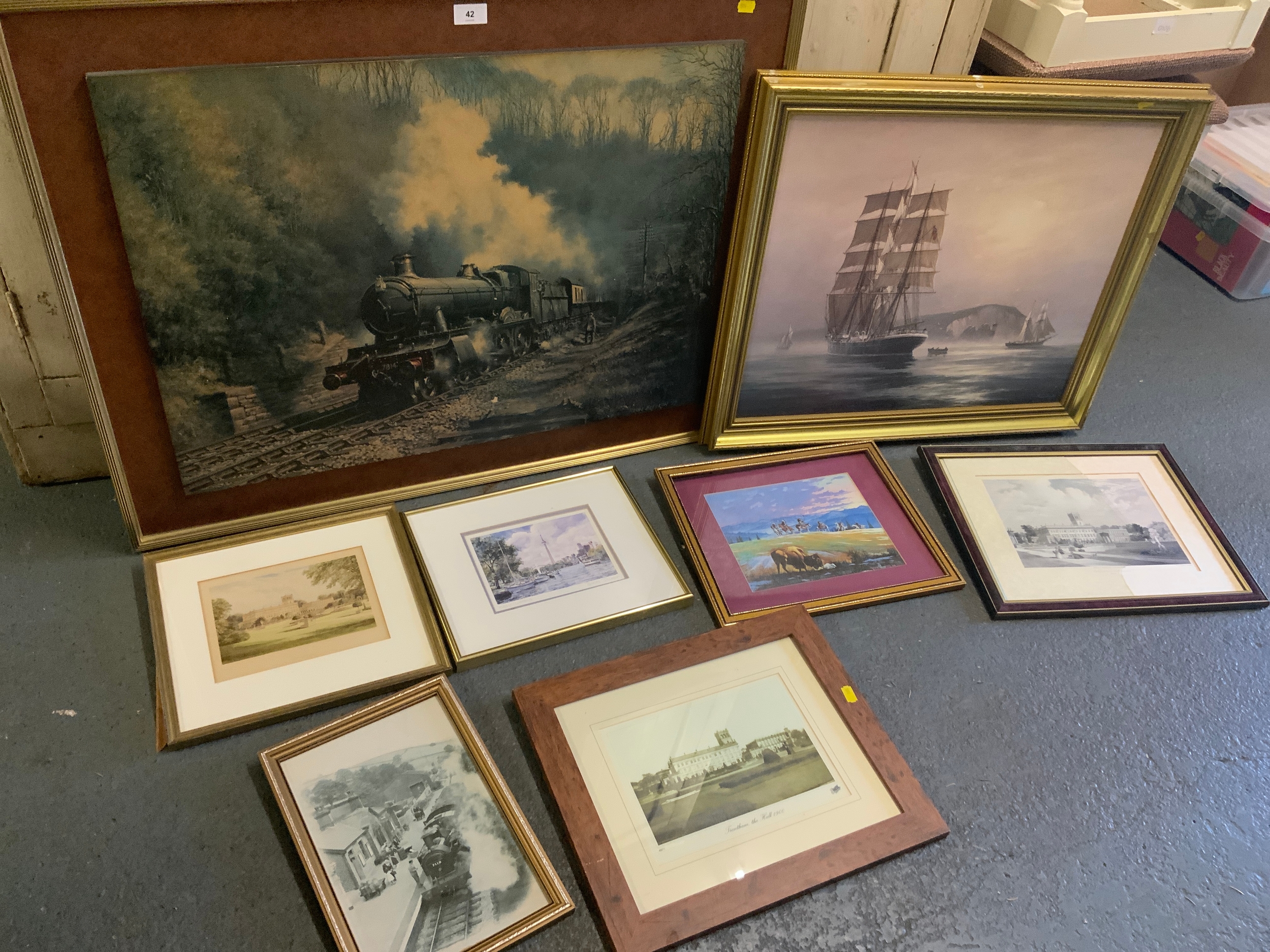 A collection of eight assorted pictures and prints to include a large steam locomotive print, Trentham Hall local interest prints, etc.