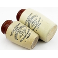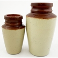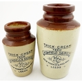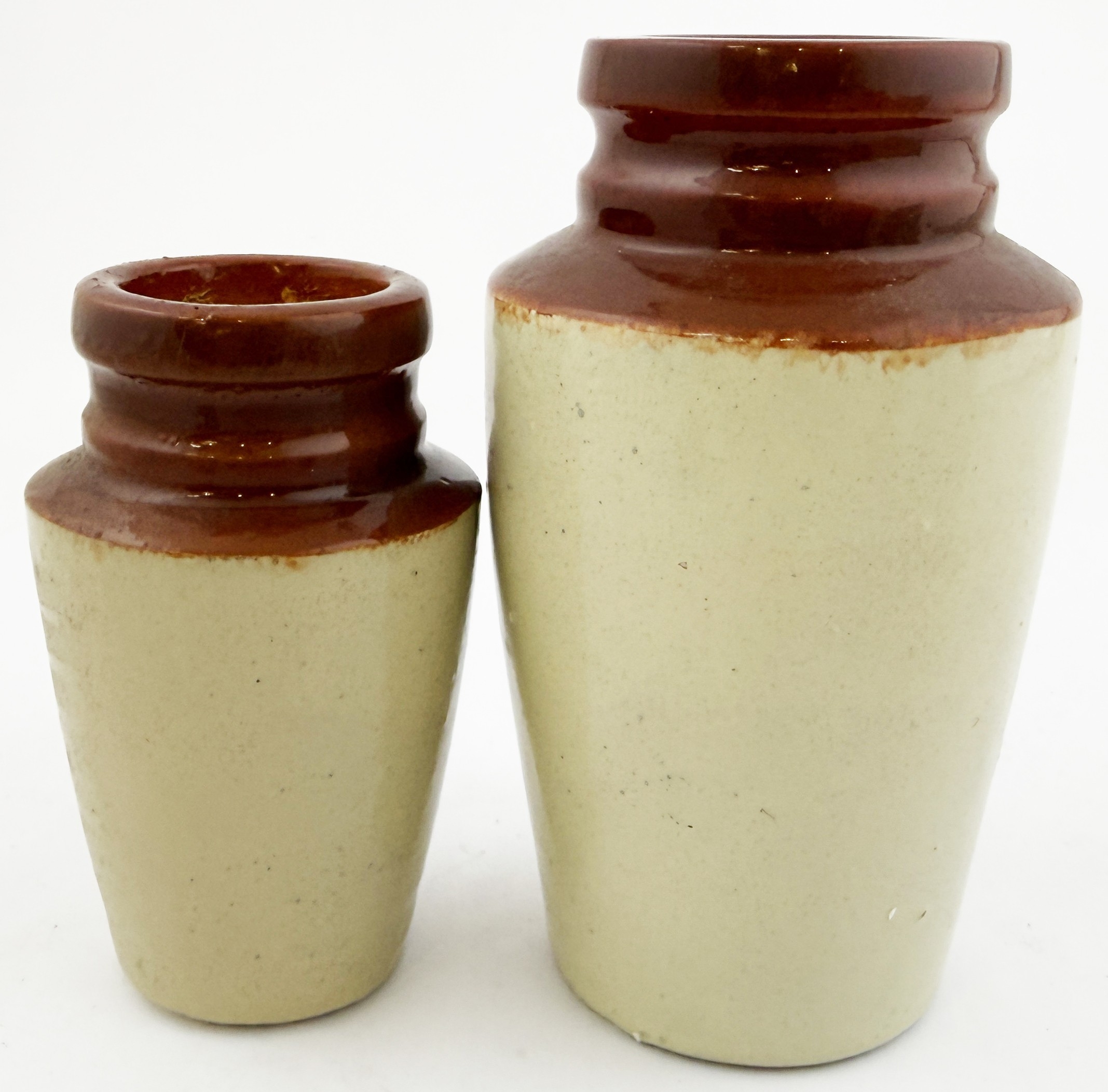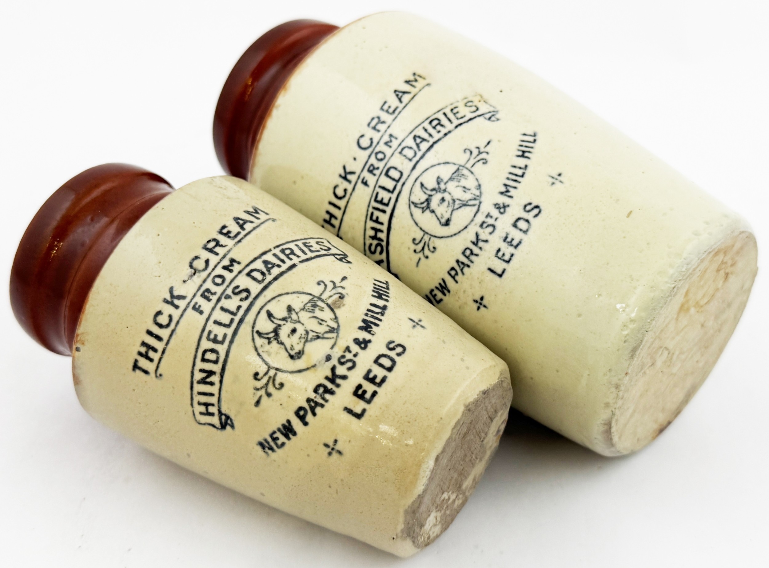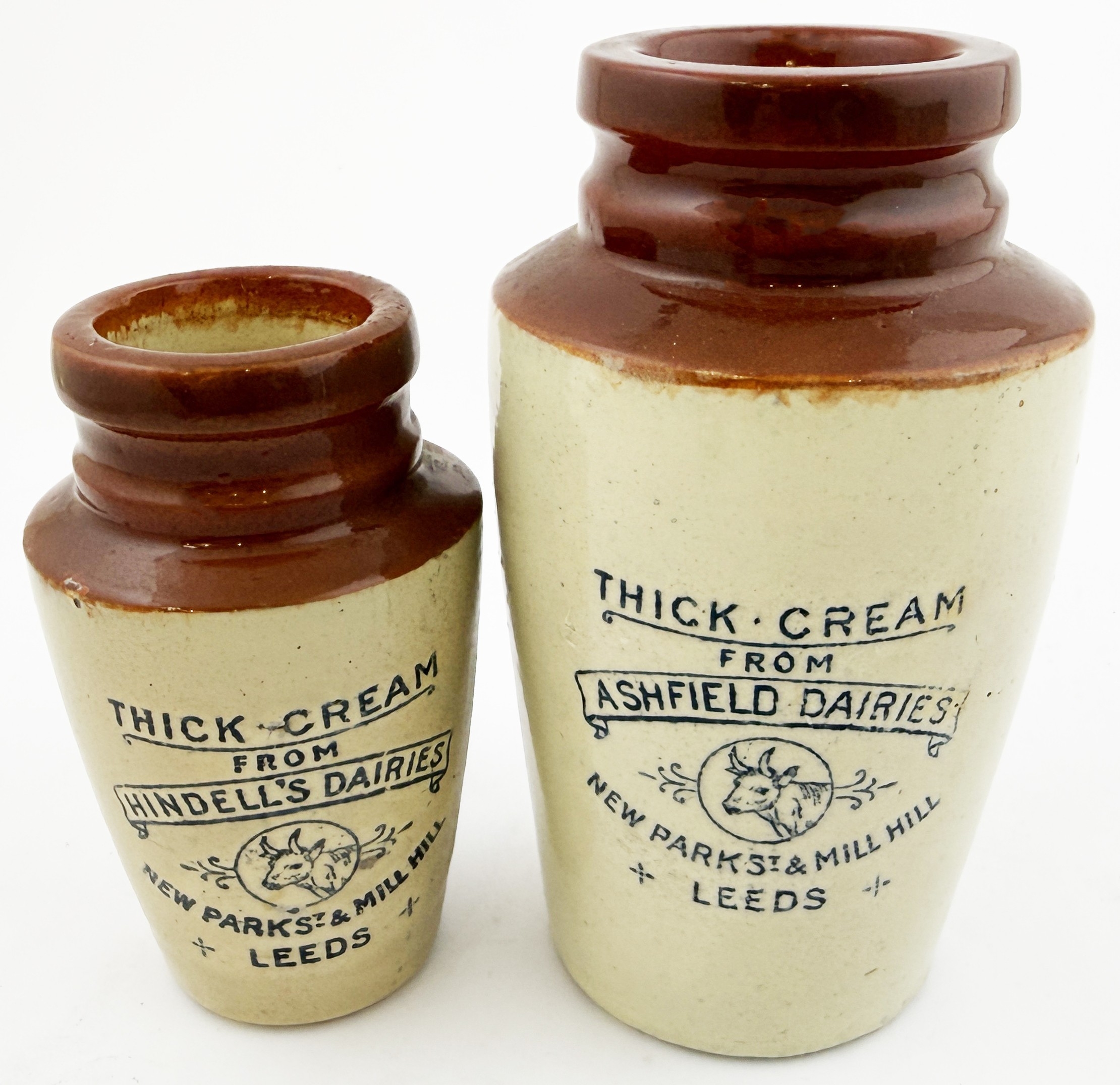 LEEDS CREAM POT DUO. Tallest 5.25ins. Two brown top cream pots - larger from Ashfield Dairies the smaller from Hindells. Both with same graphic layout & cows head pict. Hugh Davidson collection. Repairs.