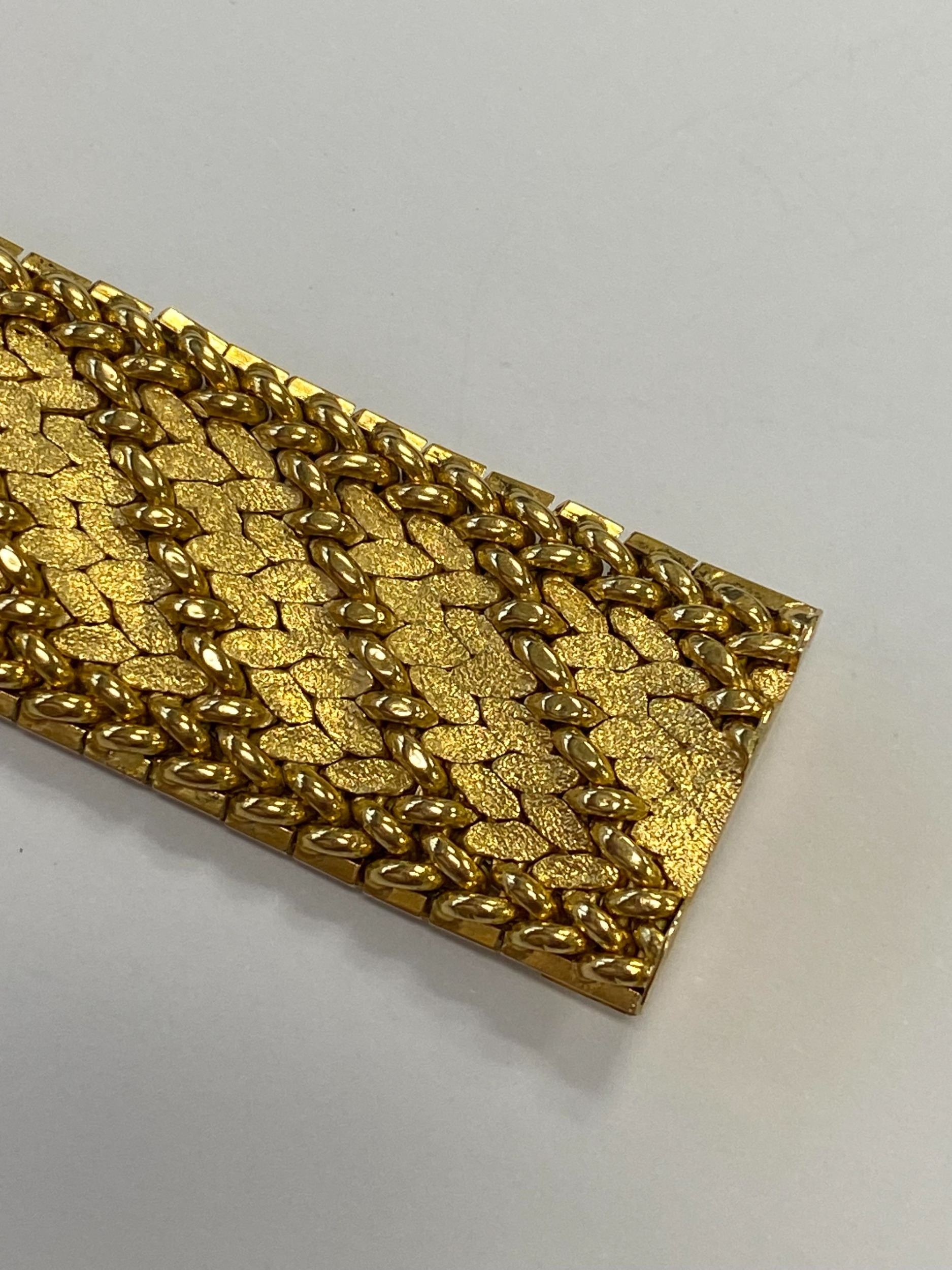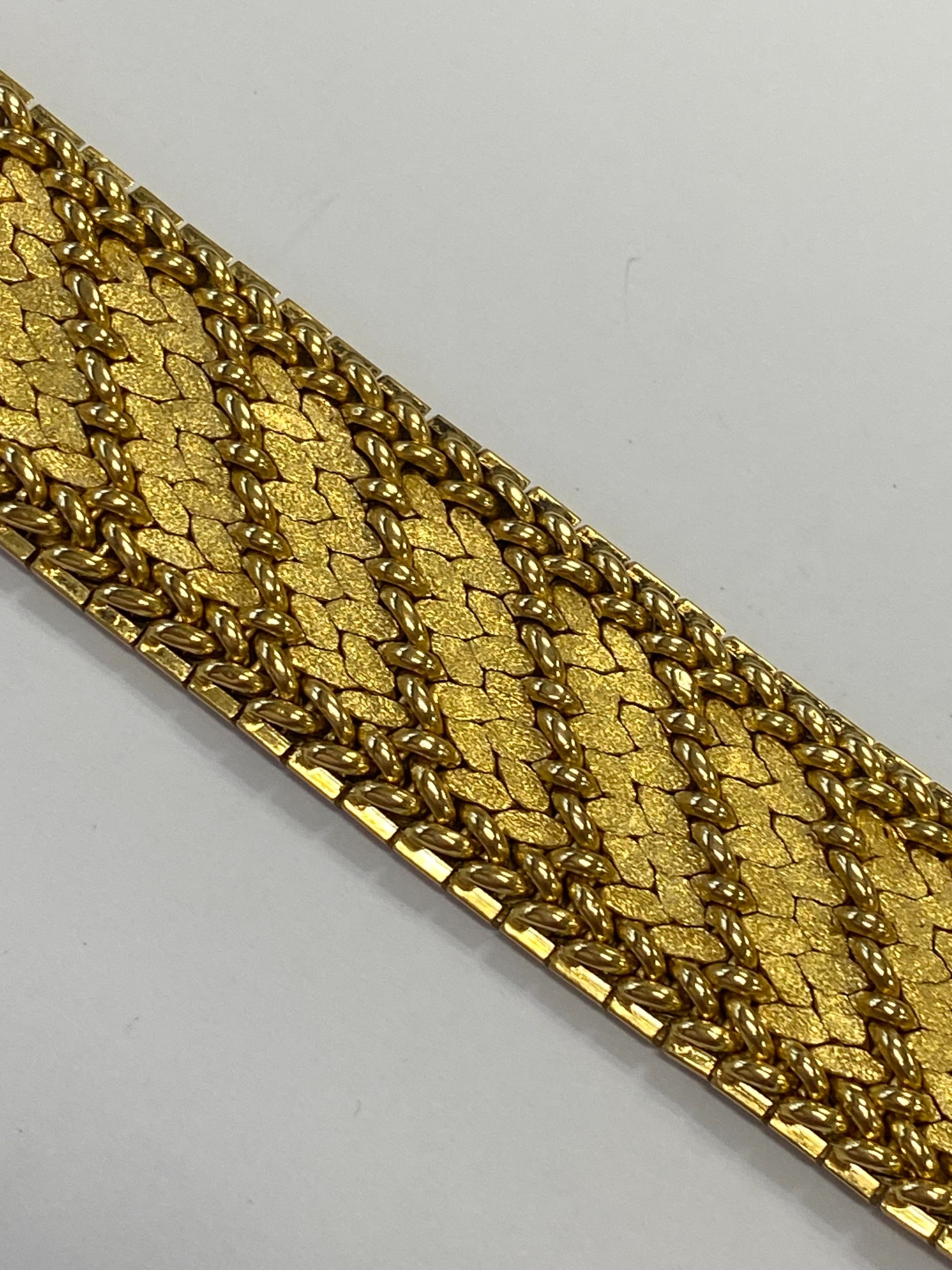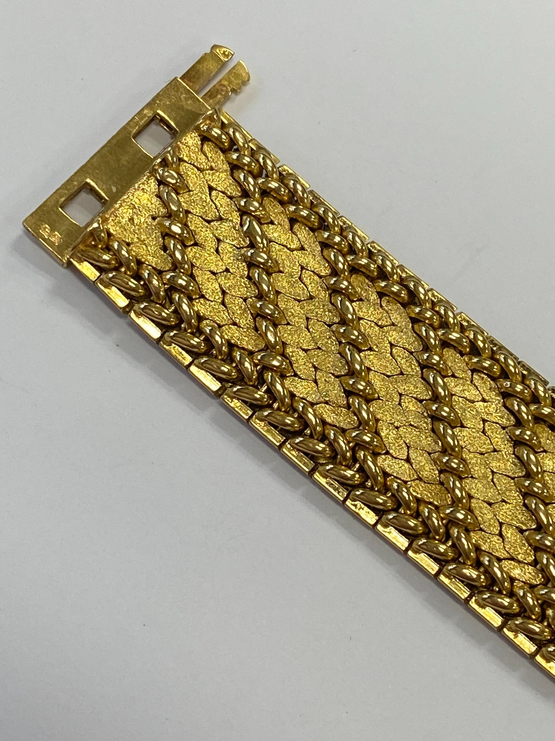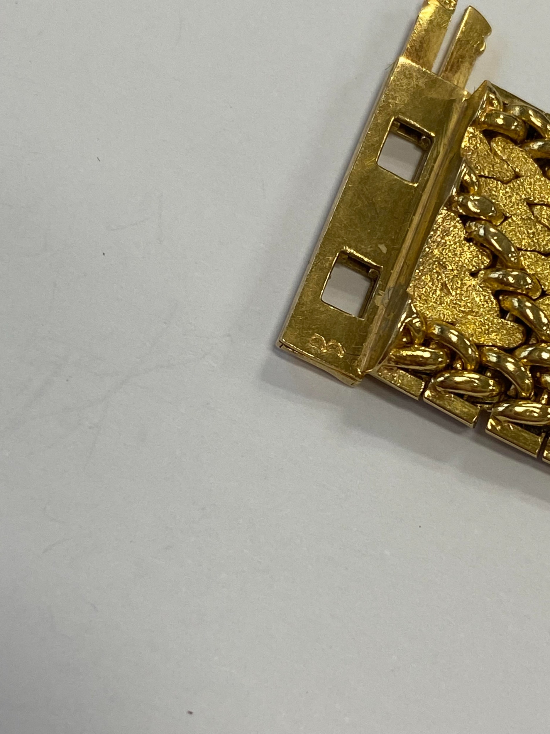 A French yellow metal bracelet, the polished and textured integral links of stylised leaf design, with integral pin and slide clasp, 18.5cm long, weight approx 55.4g Condition:Eagle marks to clasp, clasp in good working order, general wear but no significant visible damage, refer to images