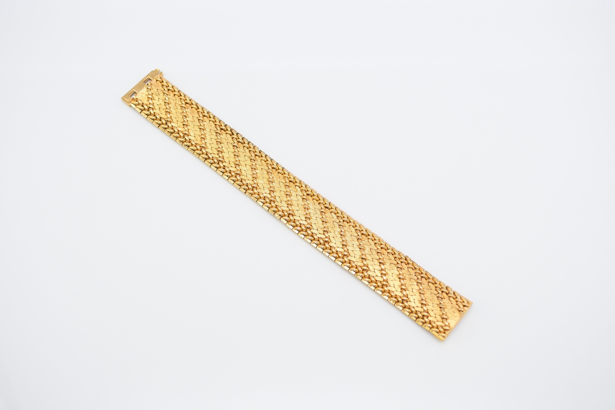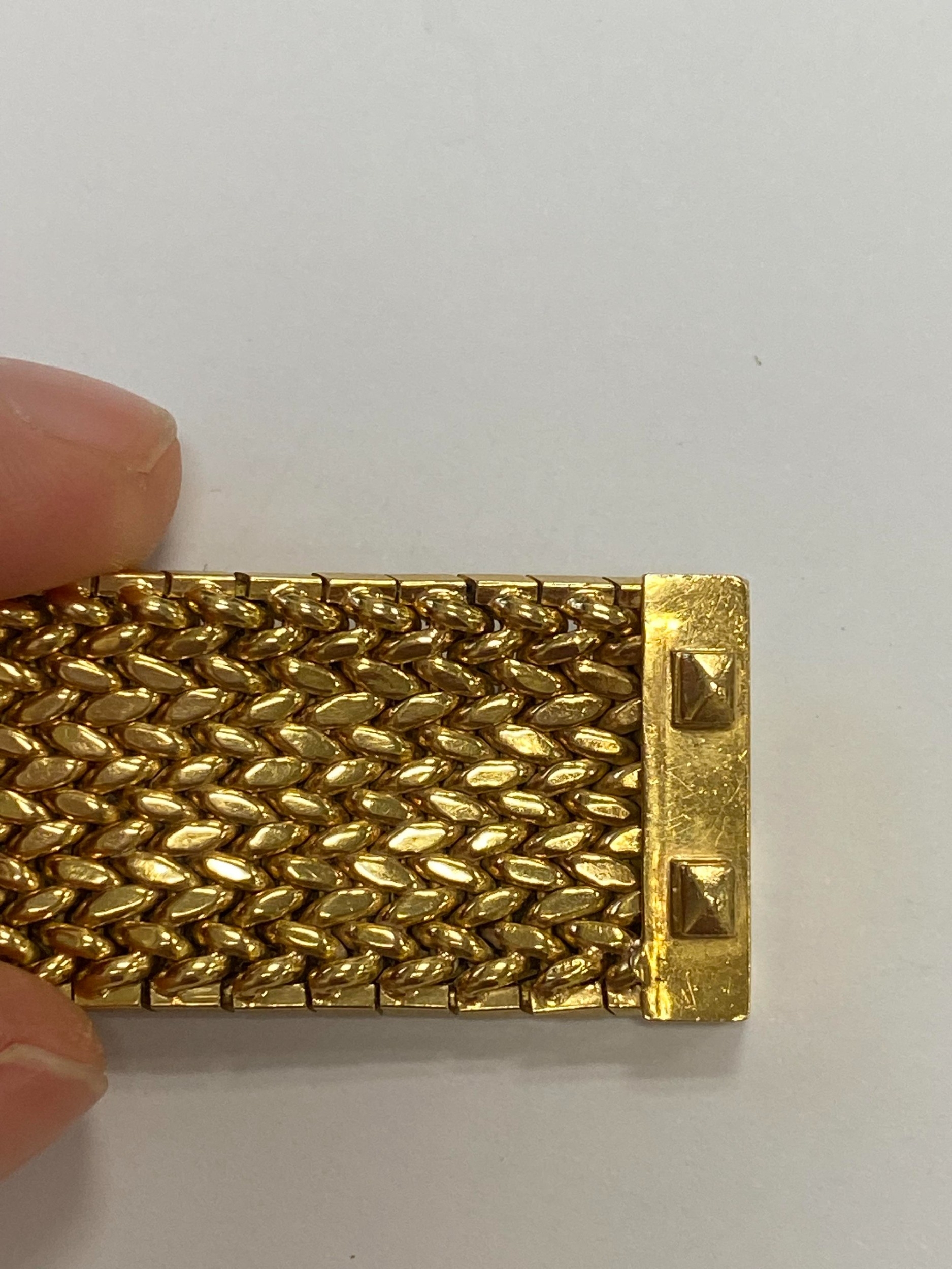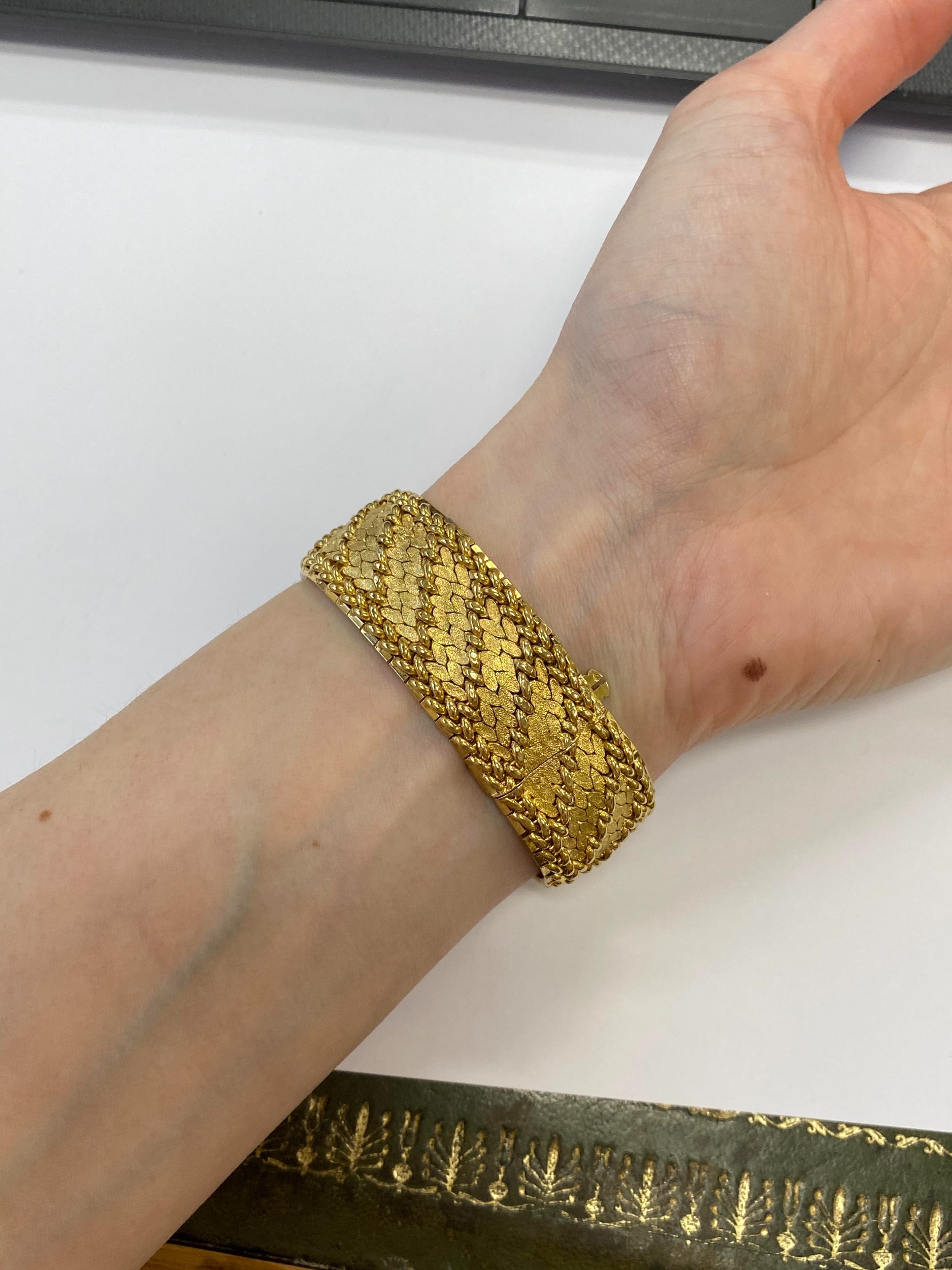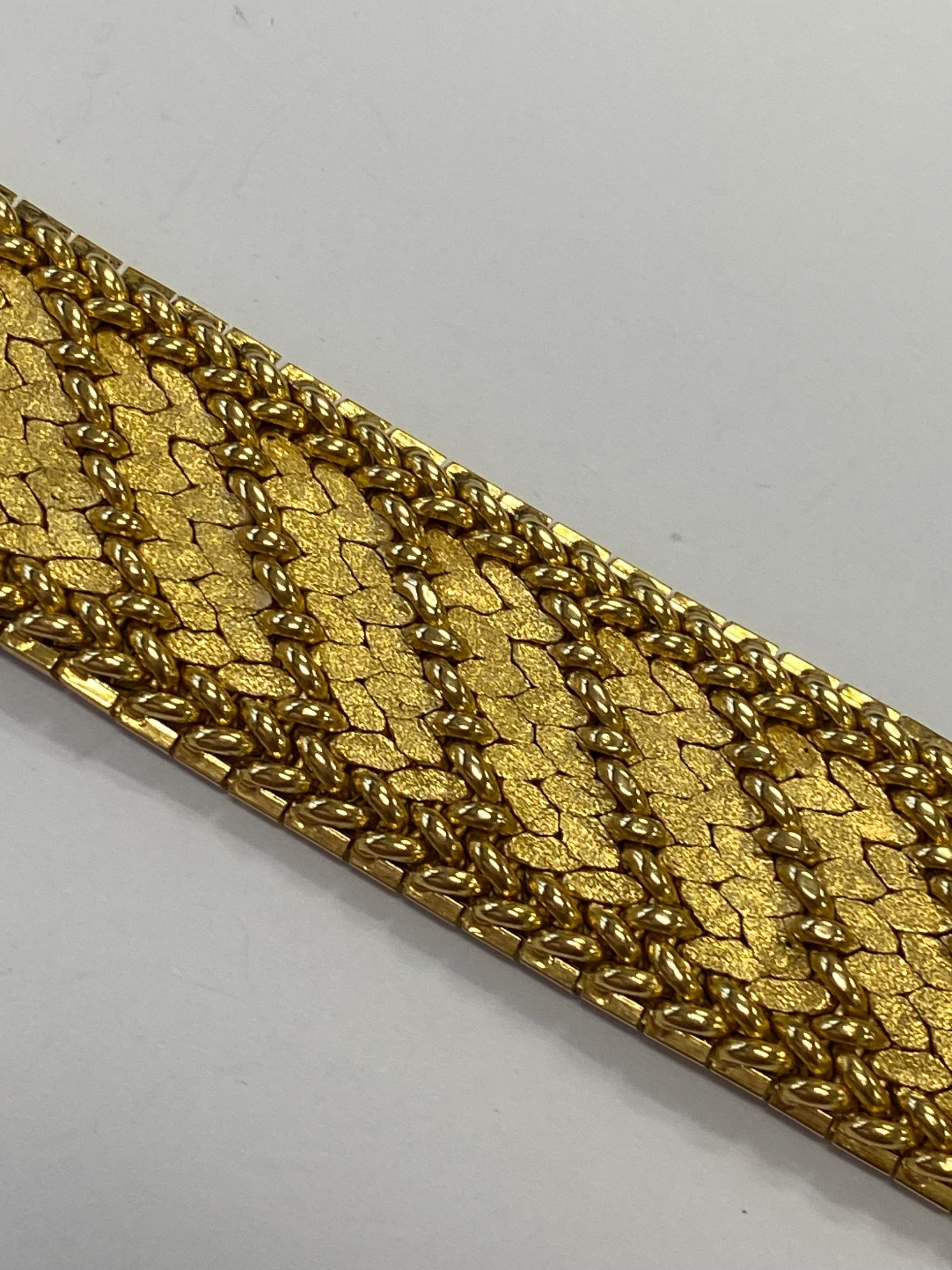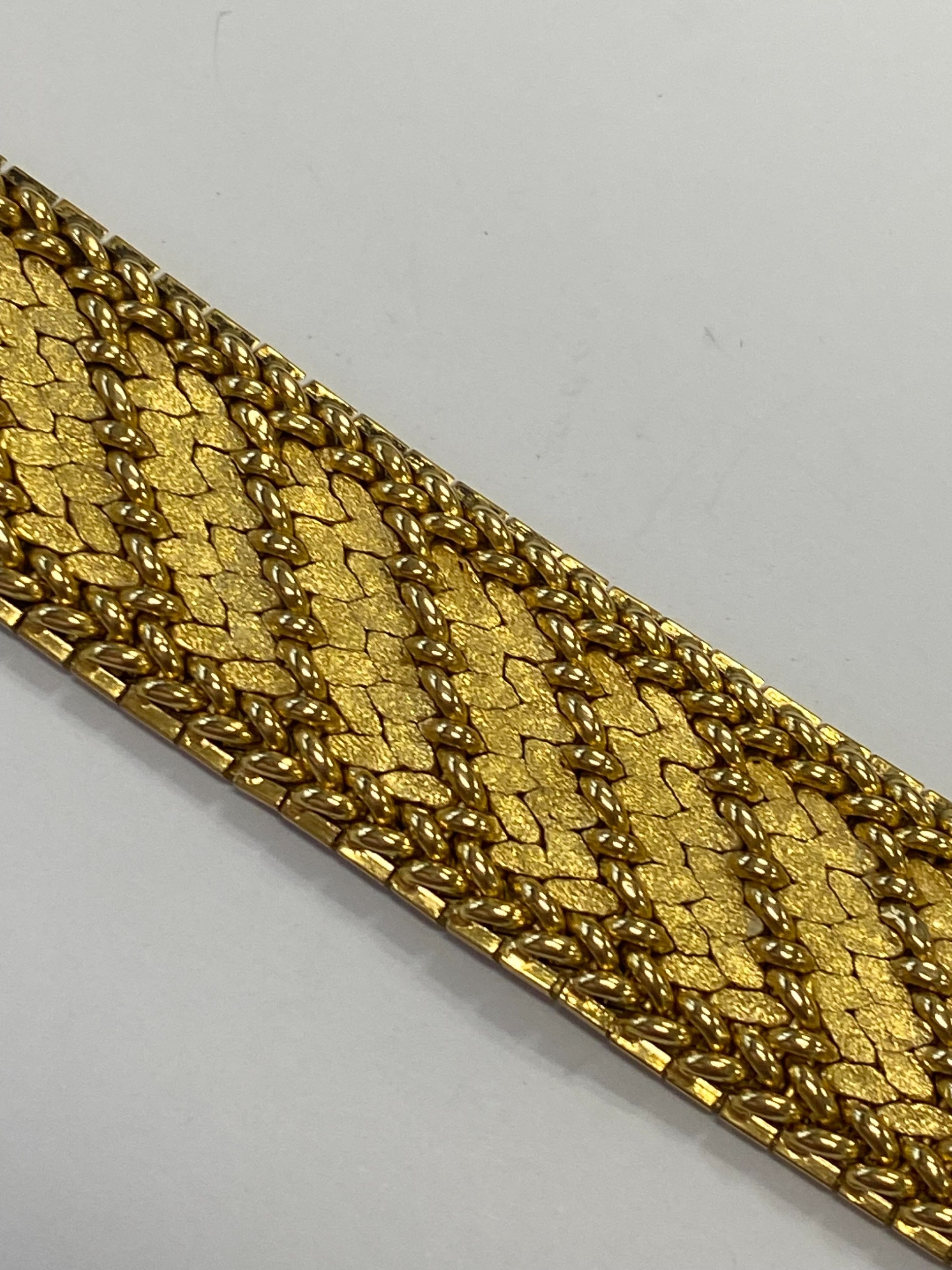 A French yellow metal bracelet, the polished and textured integral links of stylised leaf design, with integral pin and slide clasp, 18.5cm long, weight approx 55.4g Condition:Eagle marks to clasp, clasp in good working order, general wear but no significant visible damage, refer to images