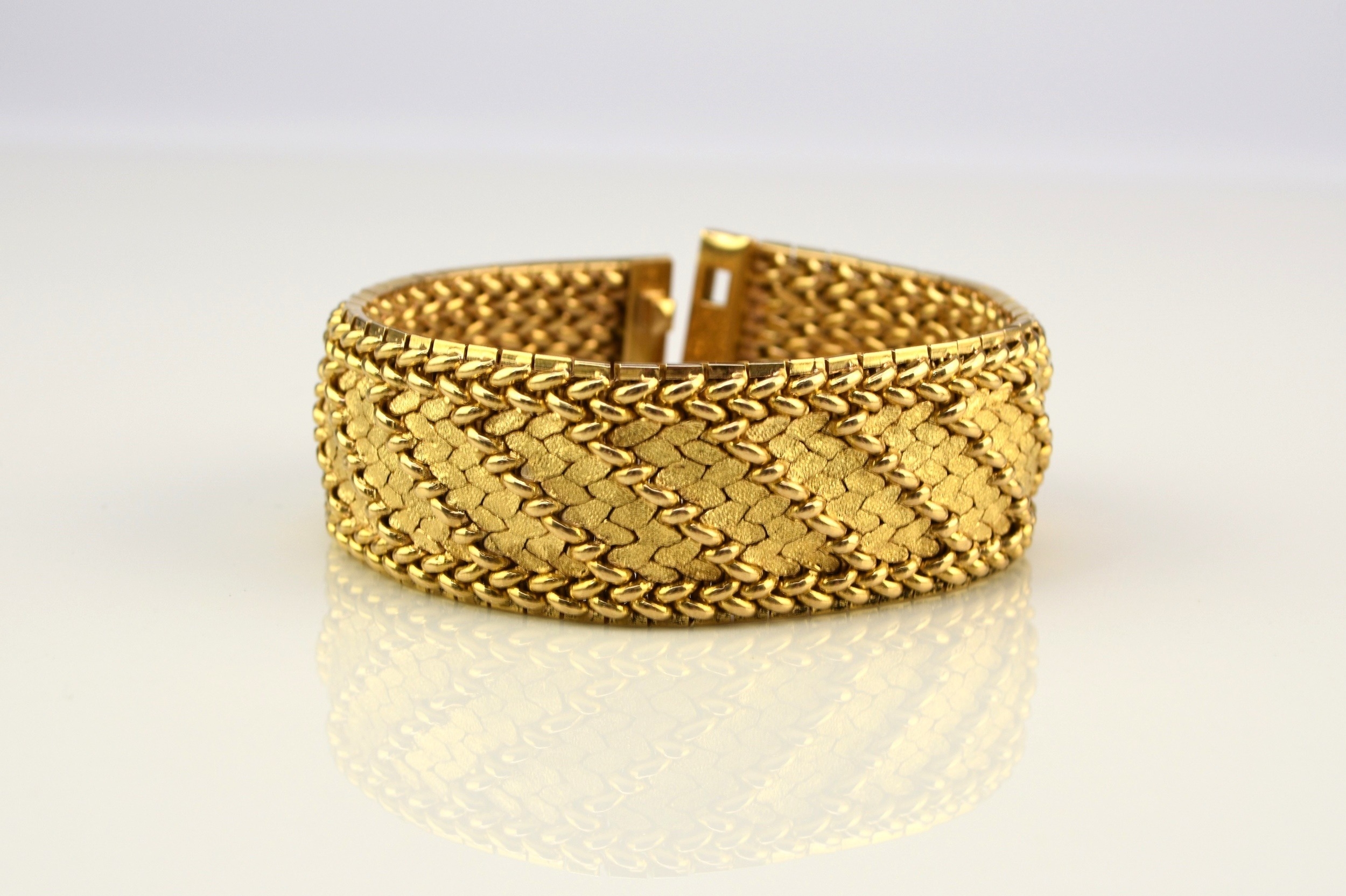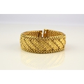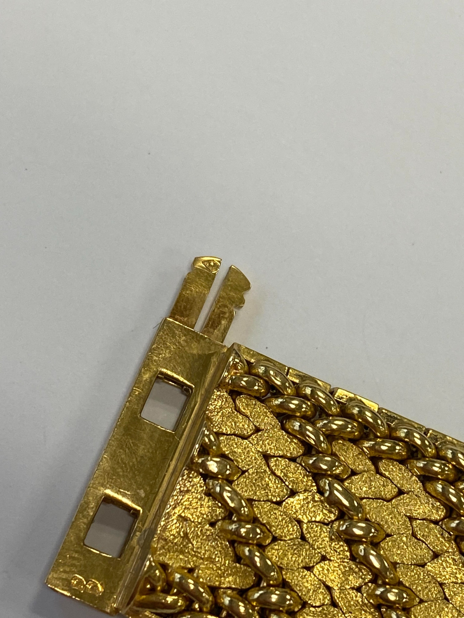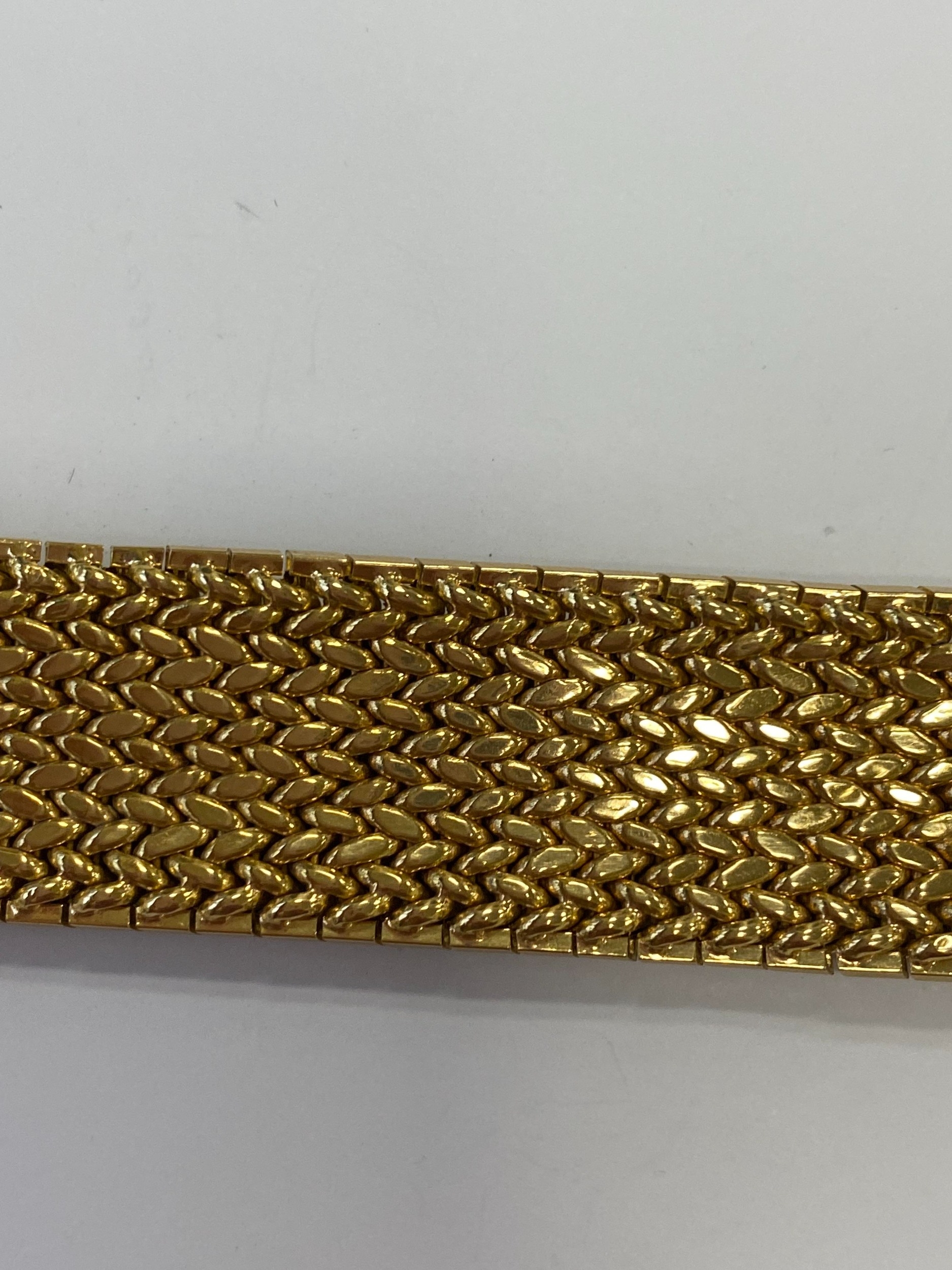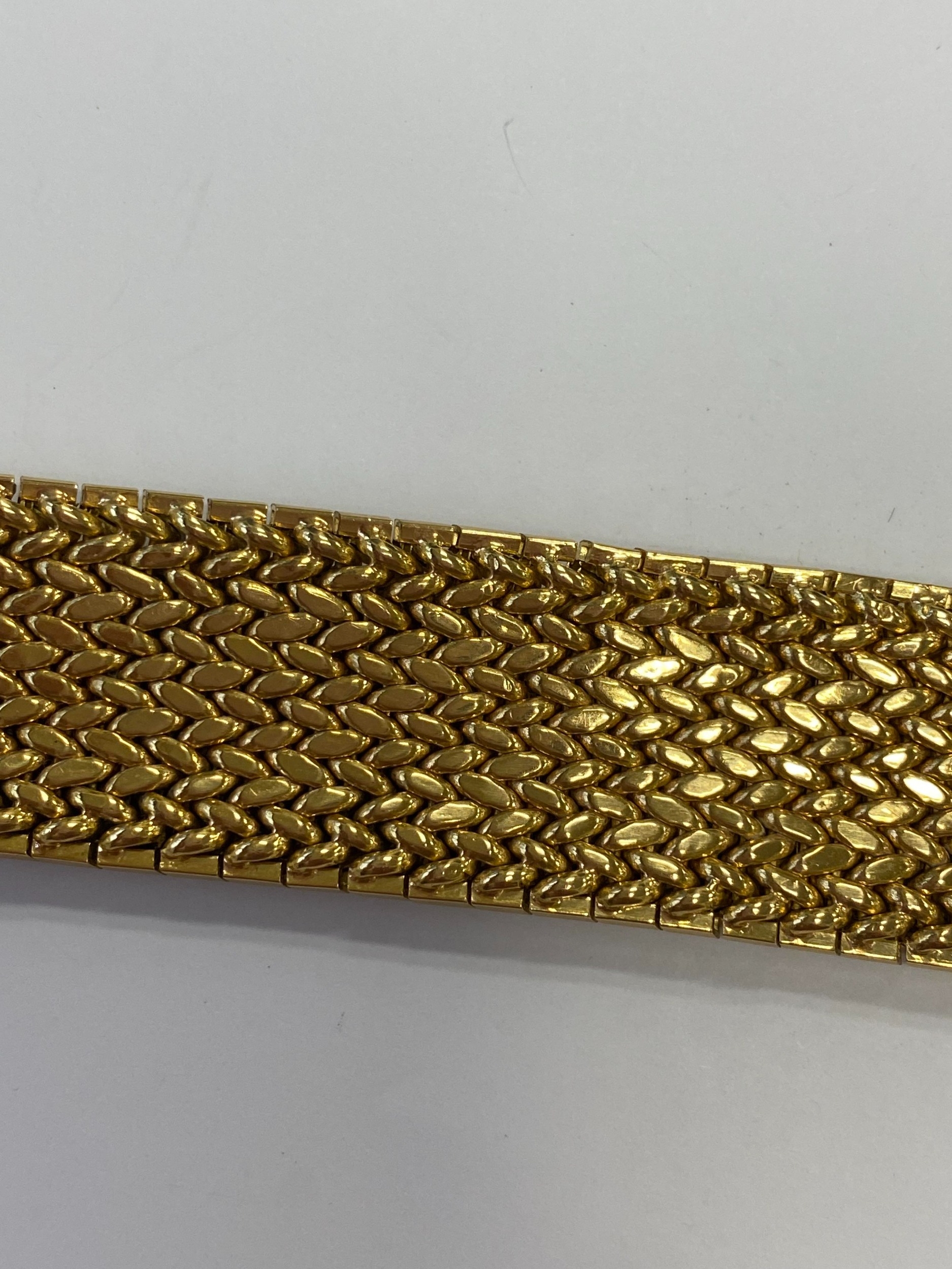 A French yellow metal bracelet, the polished and textured integral links of stylised leaf design, with integral pin and slide clasp, 18.5cm long, weight approx 55.4g Condition:Eagle marks to clasp, clasp in good working order, general wear but no significant visible damage, refer to images