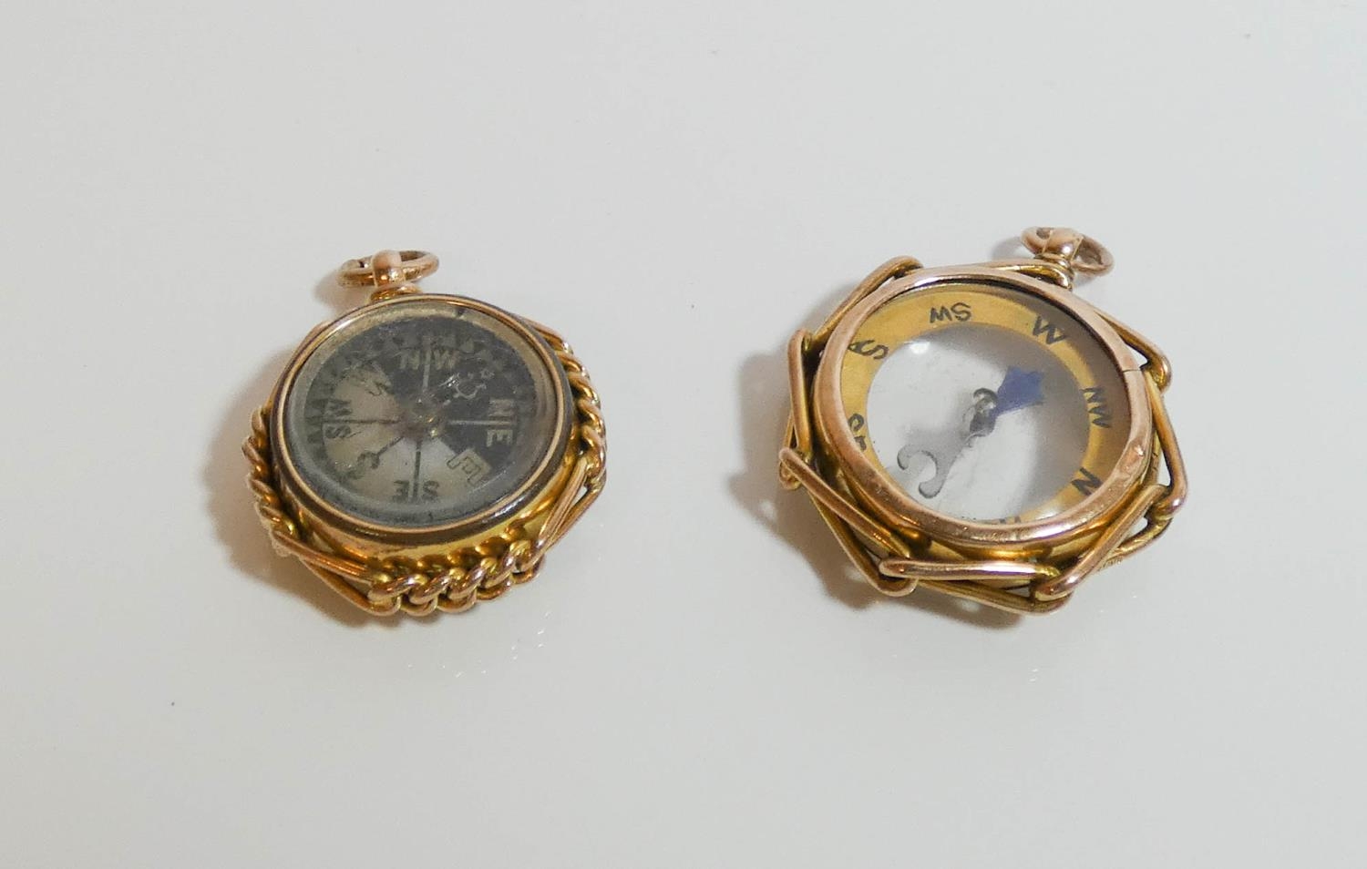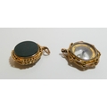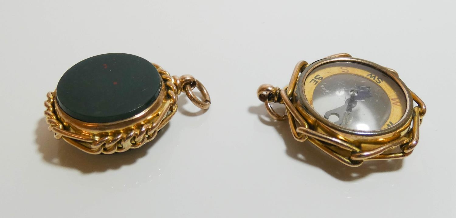 9ct gold fob set blood stone to one side and compass to other and another hallmarked 9ct gold compass fob