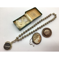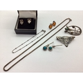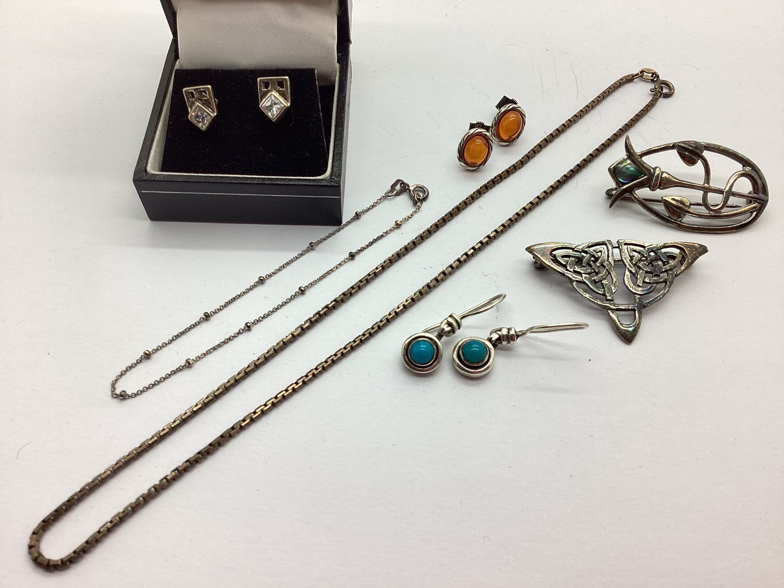 A Collection of Jewellery, Stamped "925", to include a Celtic knot style brooch, with another brooch of Mackintosh style, amber coloured stone set earrings, box link necklace, dainty beaded bracelet etc. (7)