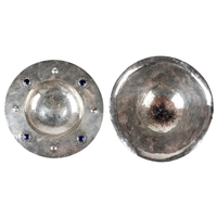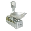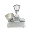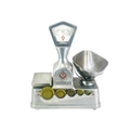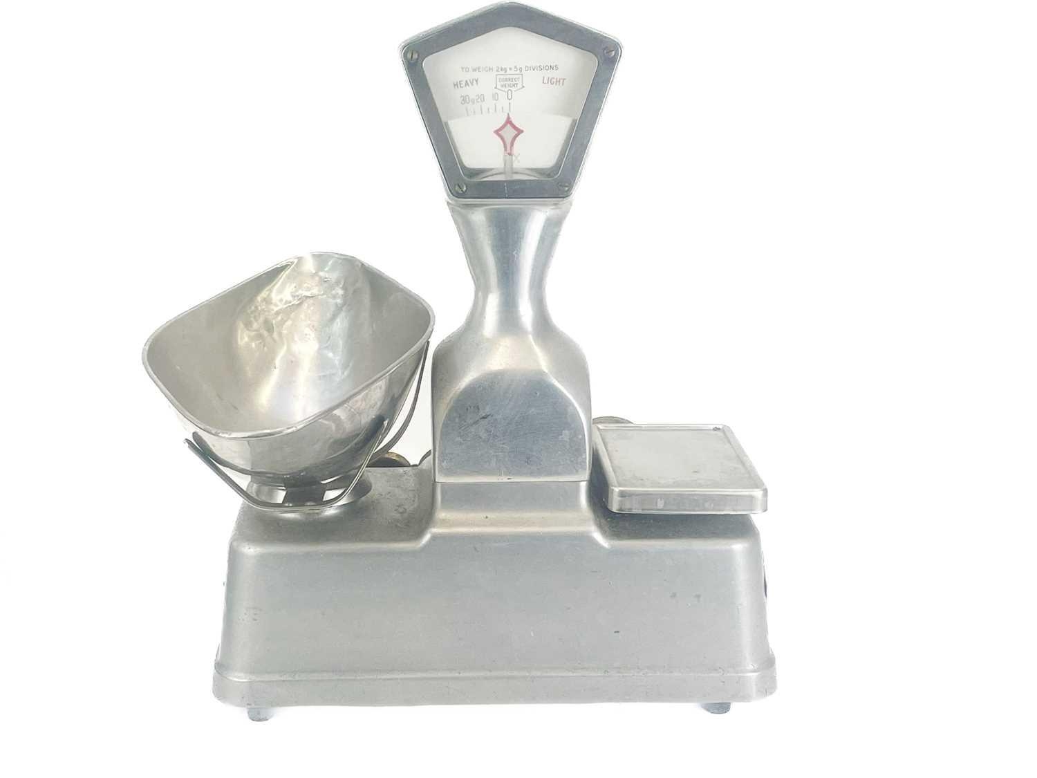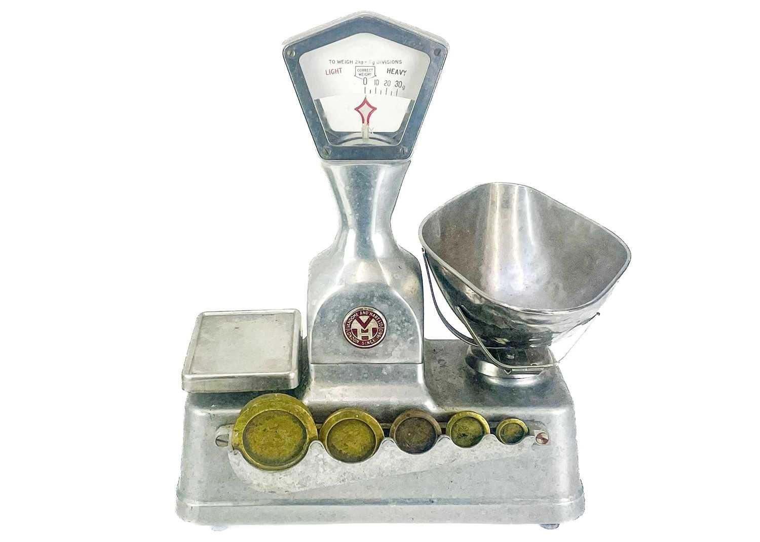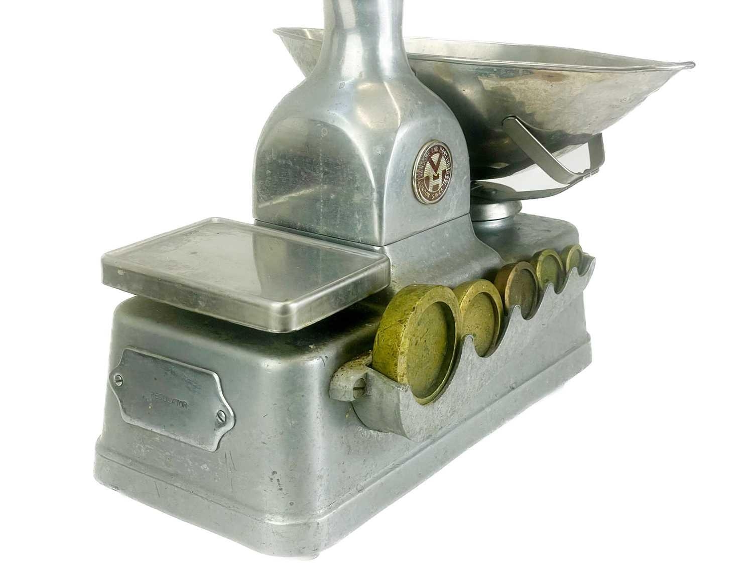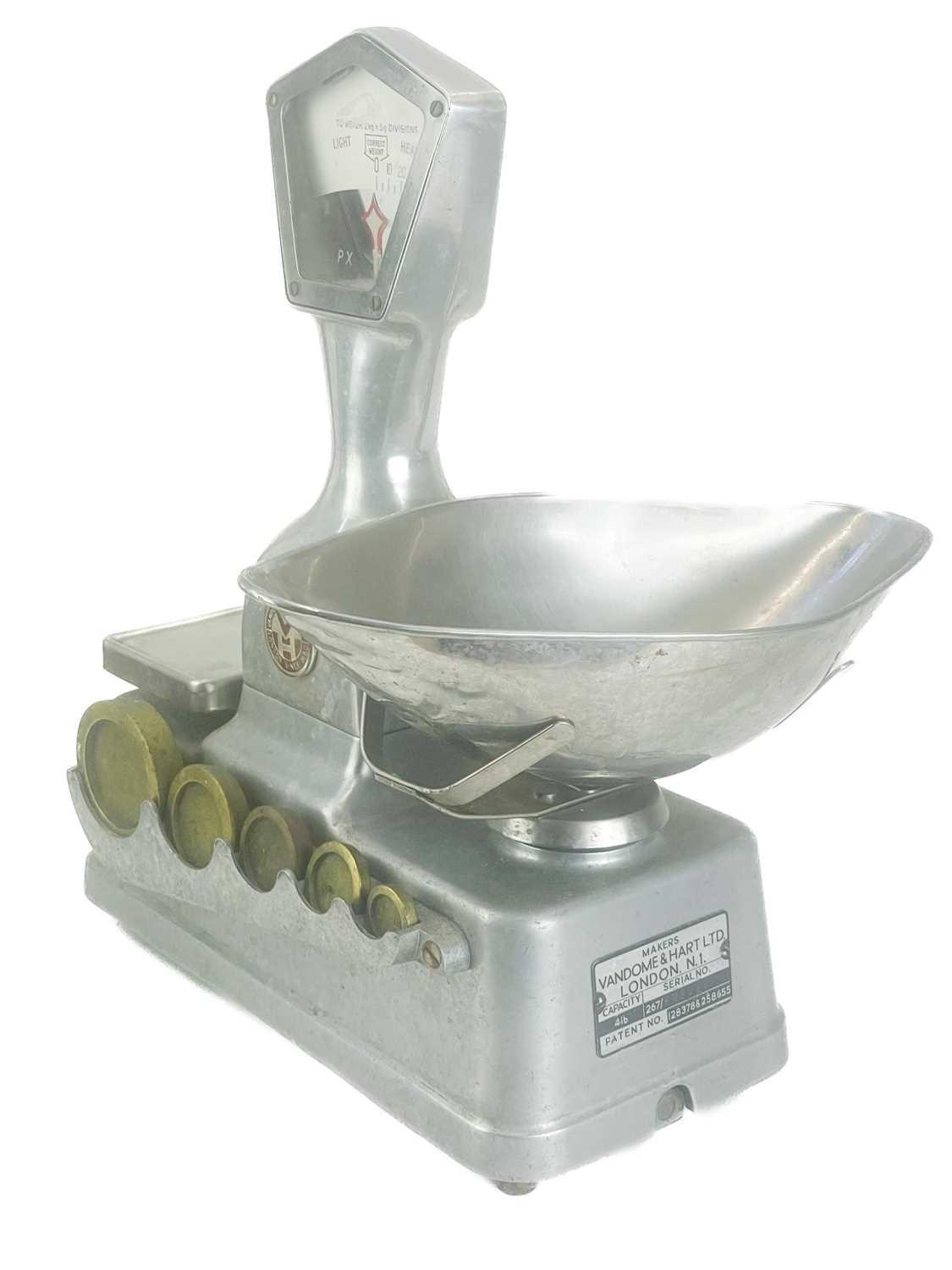 A set of Vandome and Hart Ltd of London aluminium shop scales. With five weights. Height 46cm.