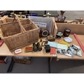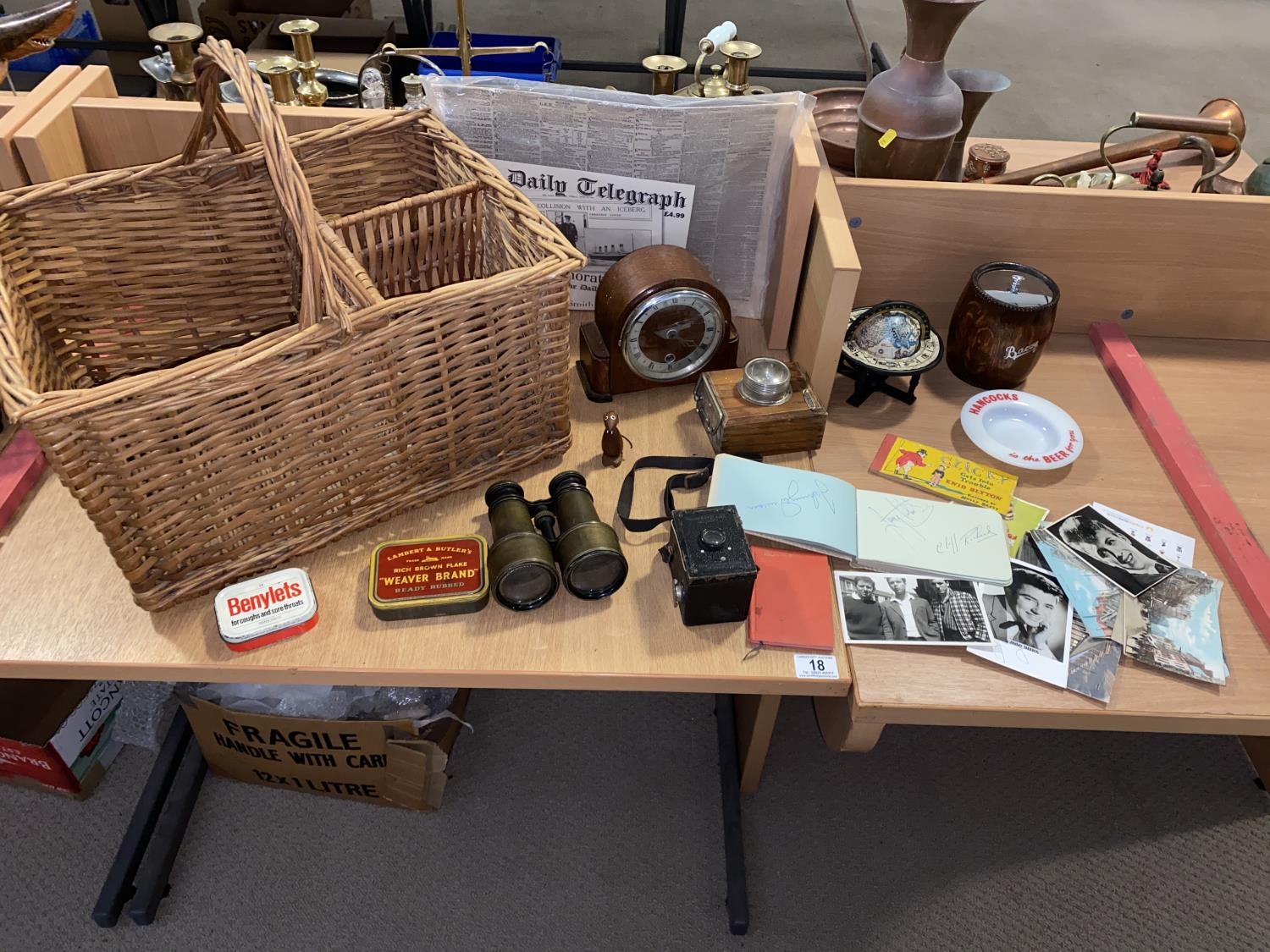 Vintage basket, binoculars, cameras, autograph book with signatures from Cliff Richards, Jimmy Tarbuck etc.