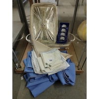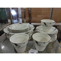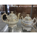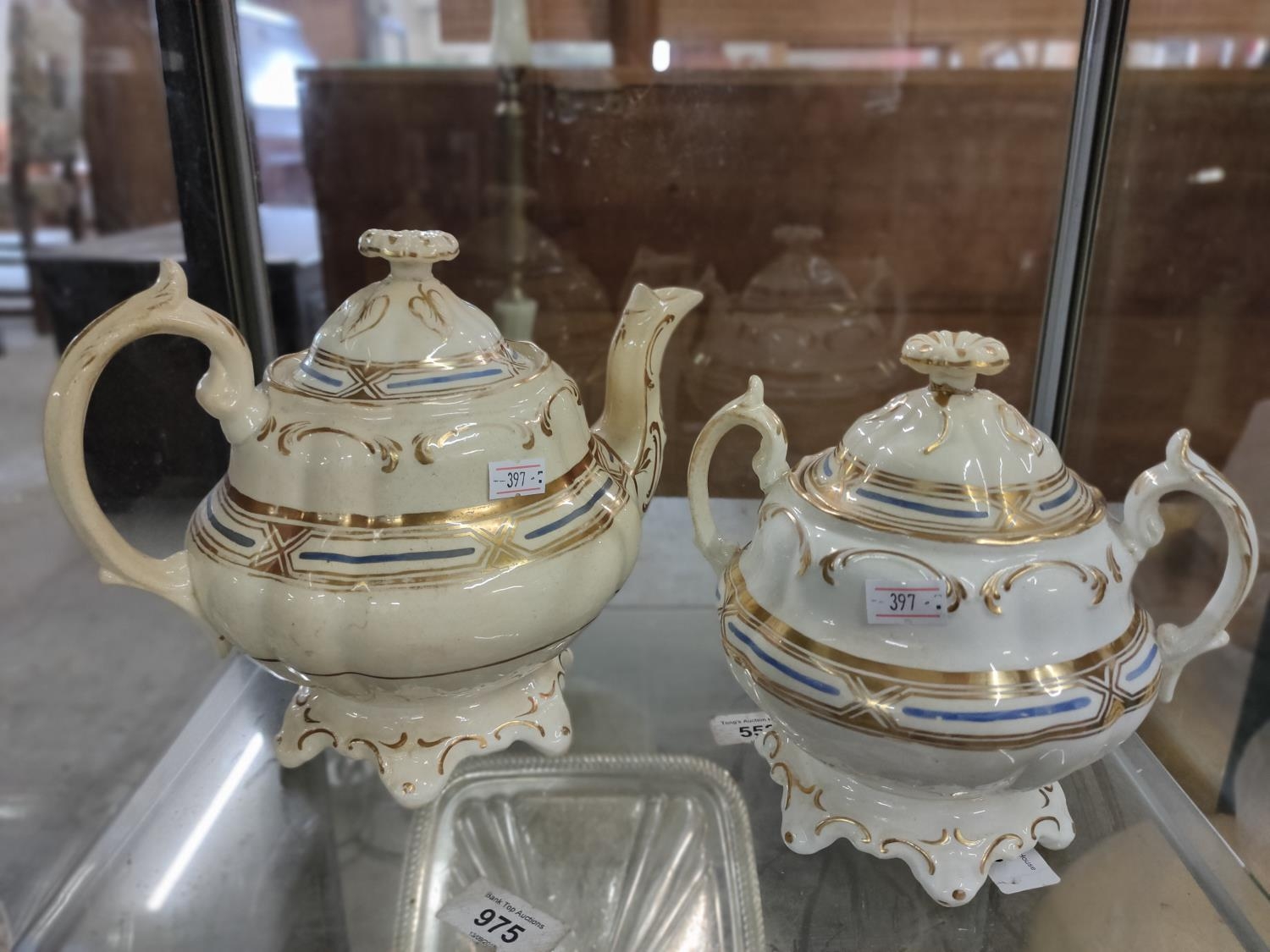 Large intricately designed ceramic teapot and twin handled sugar pot.
