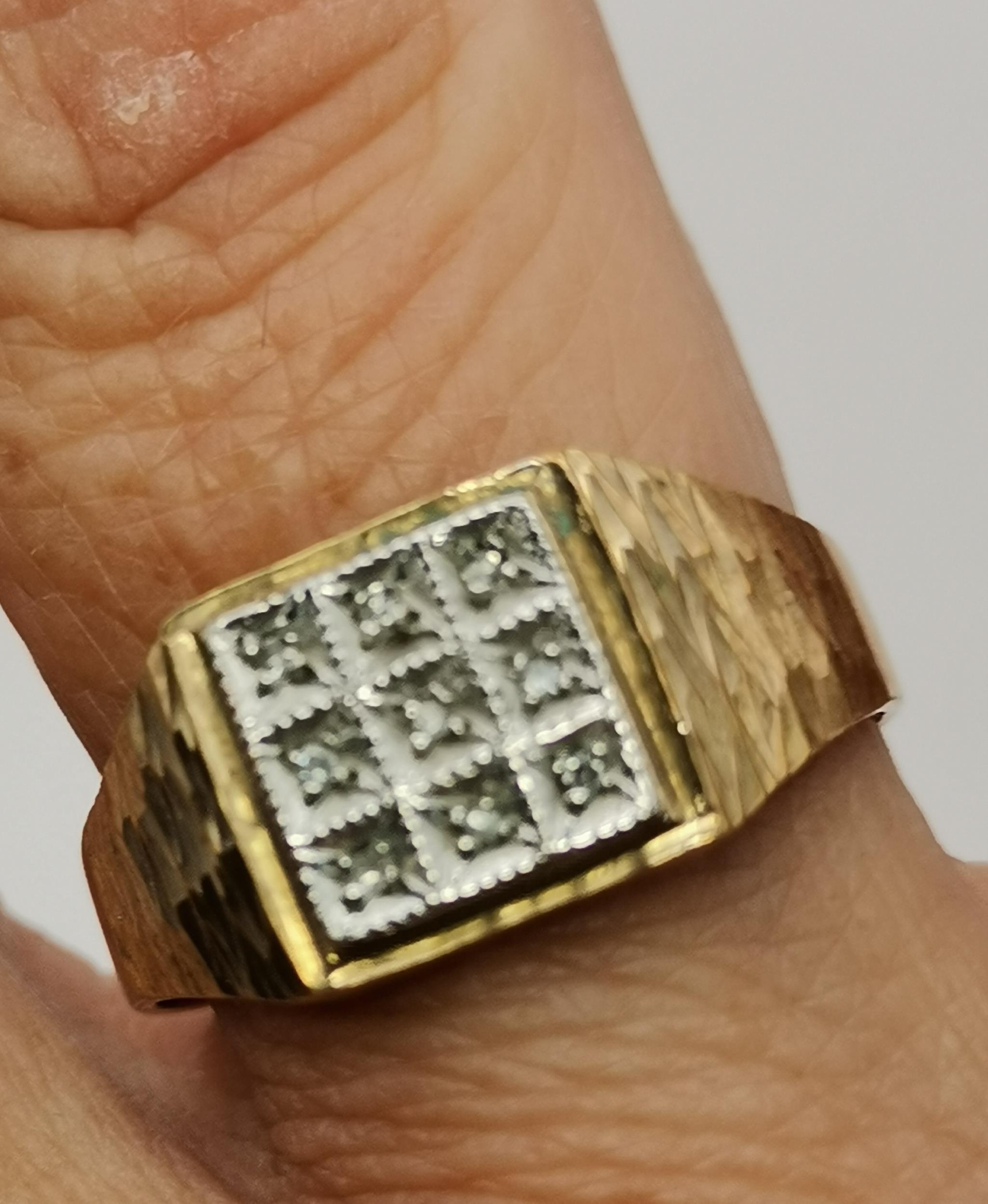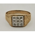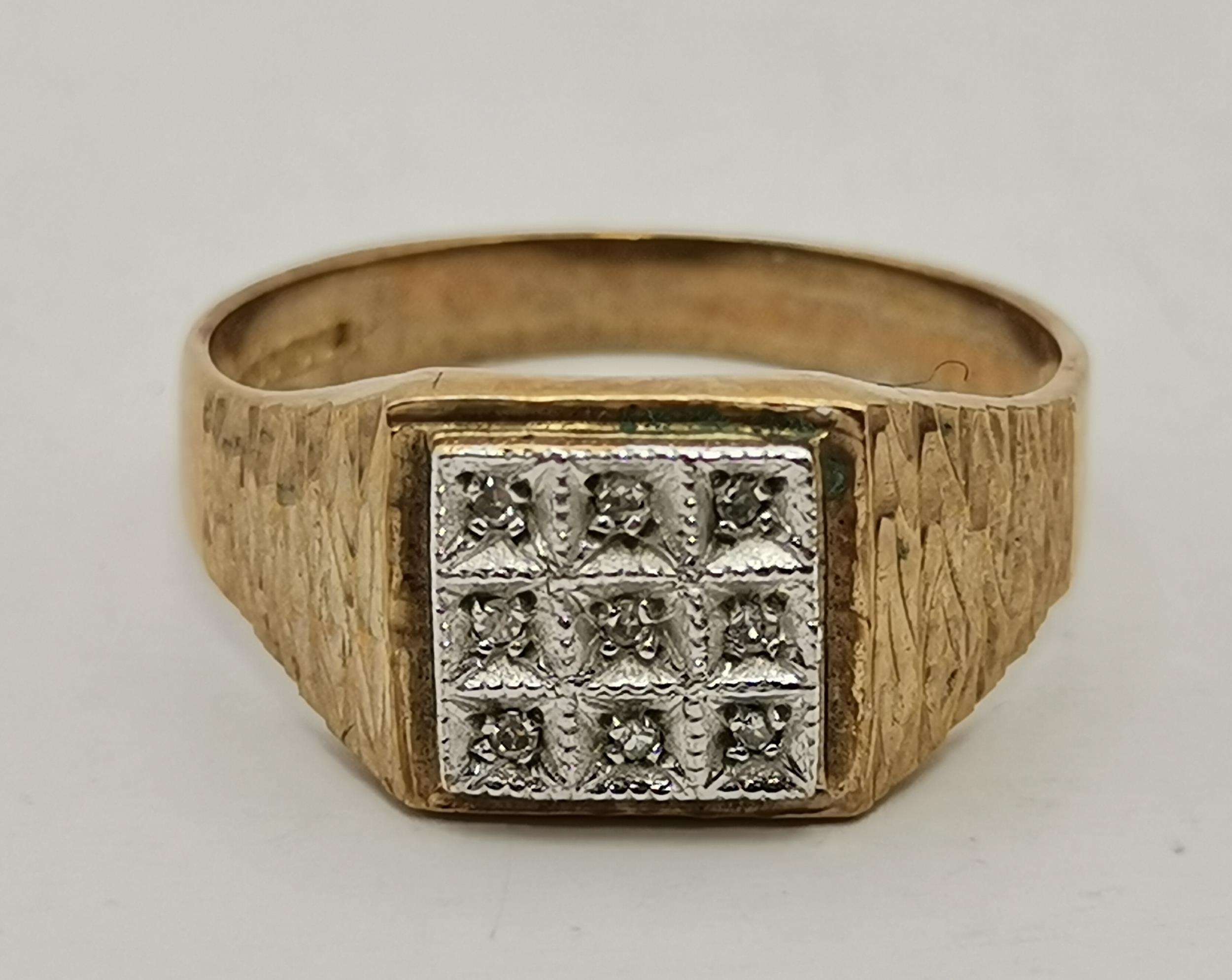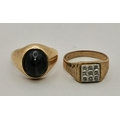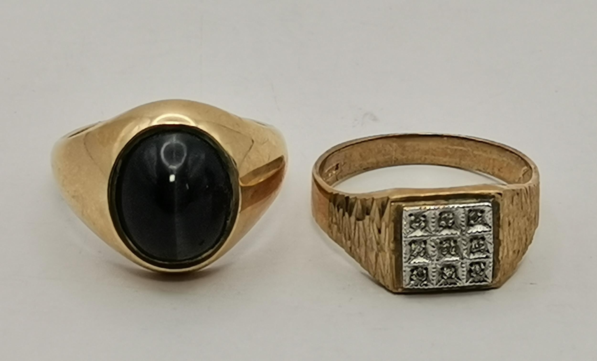 A gent's 9 carat gold banded hardstone cabochon signet ring, hallmarked 375, ring size S; together with a gent's 9 carat gold square-set white stone cluster ring, with nine round stone chips illusion-set to a white-metal mount, with textured and tapering shoulders, hallmarked 375, ring size T. (2) 10.3g gross