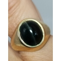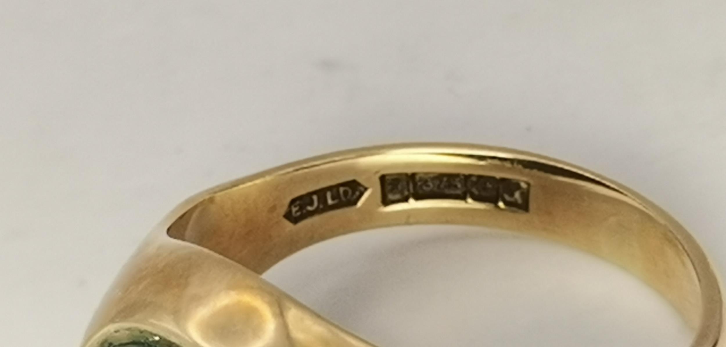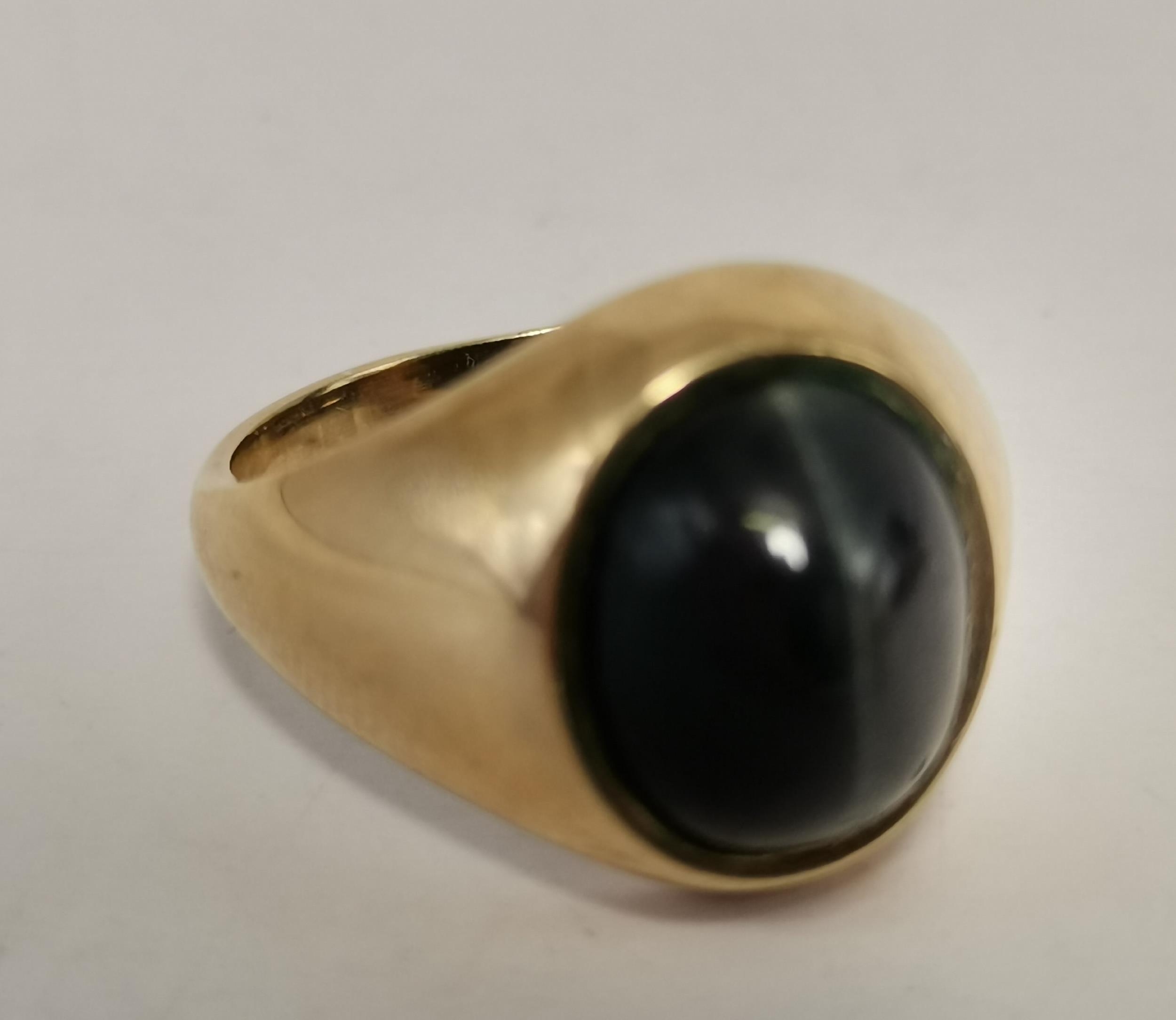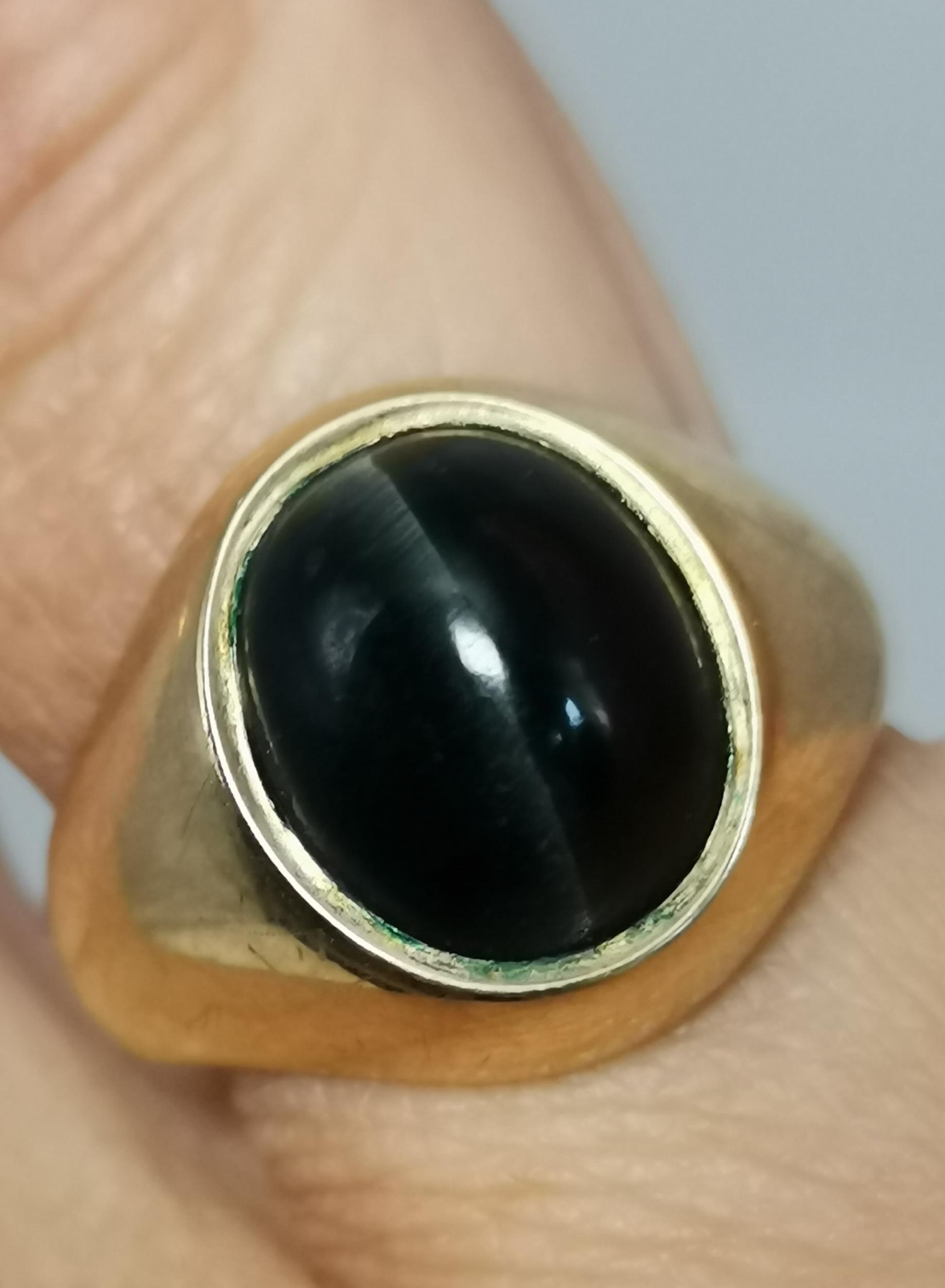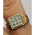 A gent's 9 carat gold banded hardstone cabochon signet ring, hallmarked 375, ring size S; together with a gent's 9 carat gold square-set white stone cluster ring, with nine round stone chips illusion-set to a white-metal mount, with textured and tapering shoulders, hallmarked 375, ring size T. (2) 10.3g gross