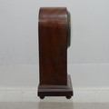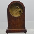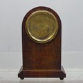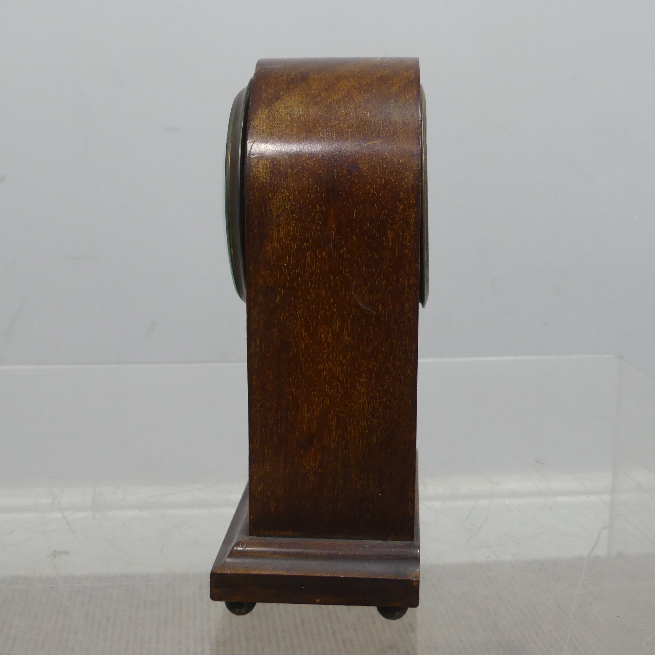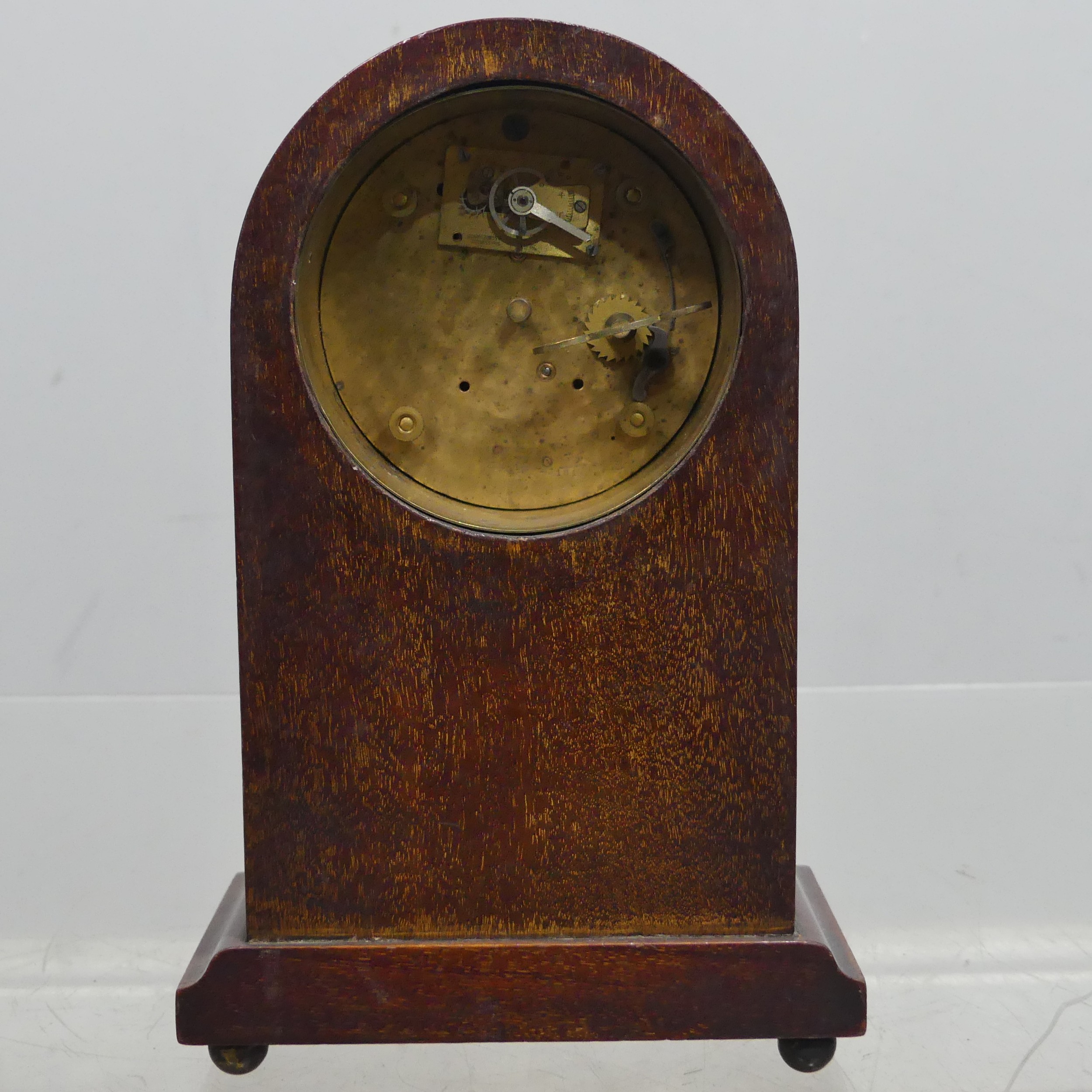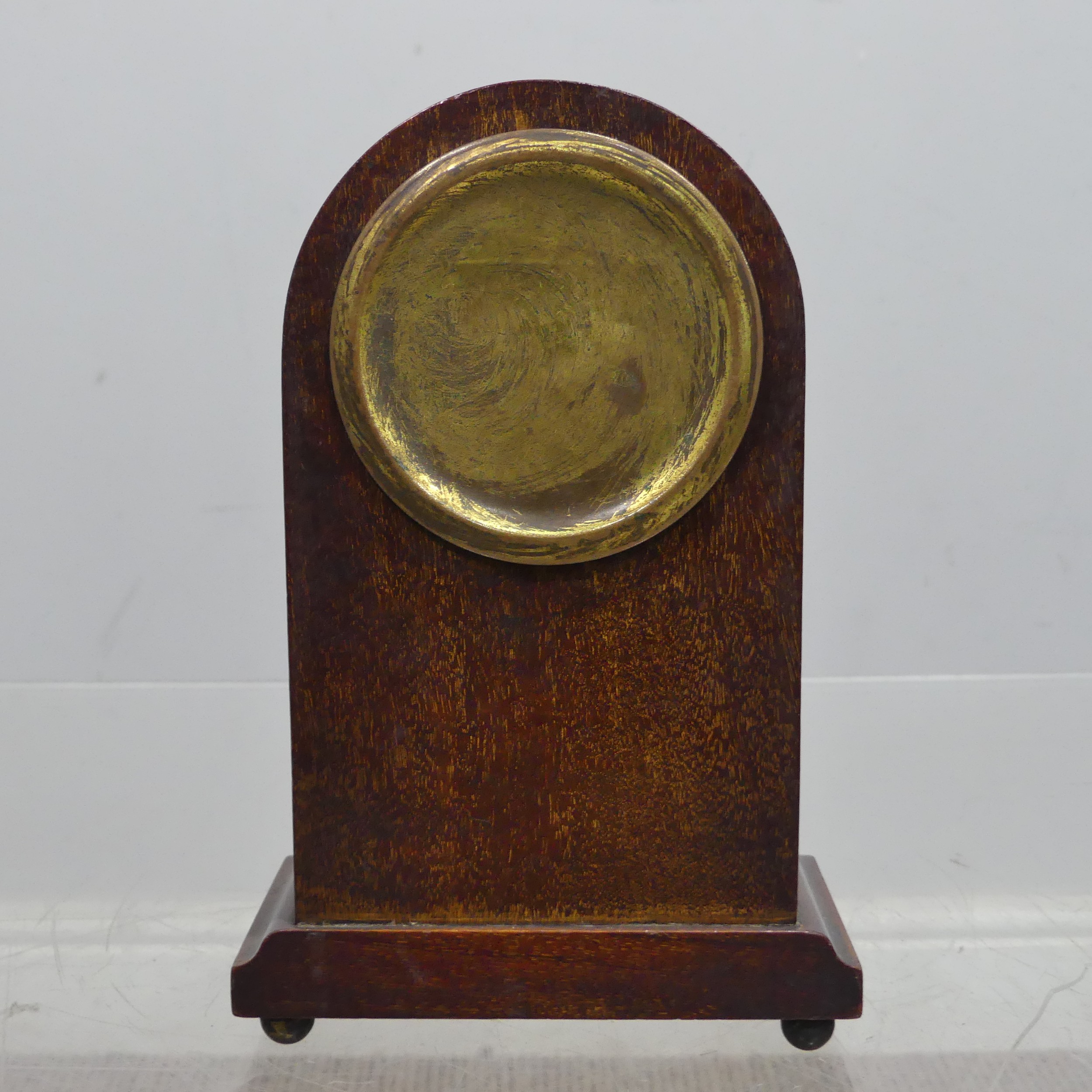 A small early 20th century mahogany Zenith eight-day mantel Clock, the arched case decorated with string banding and shell inlay, the dial applied with Roman numeral house and stamped Zenith and 'Mortimer, Paignton', raised on brass bun feet, H 23 cm.