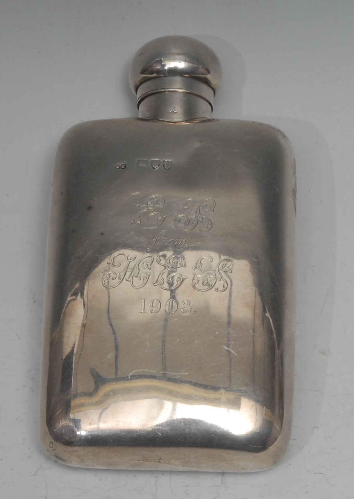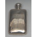 A Victorian silver rounded recytangular hip flask, hinged domed bayonet cap, 14.5cm long, W & G Neal, London 1895, 5oz