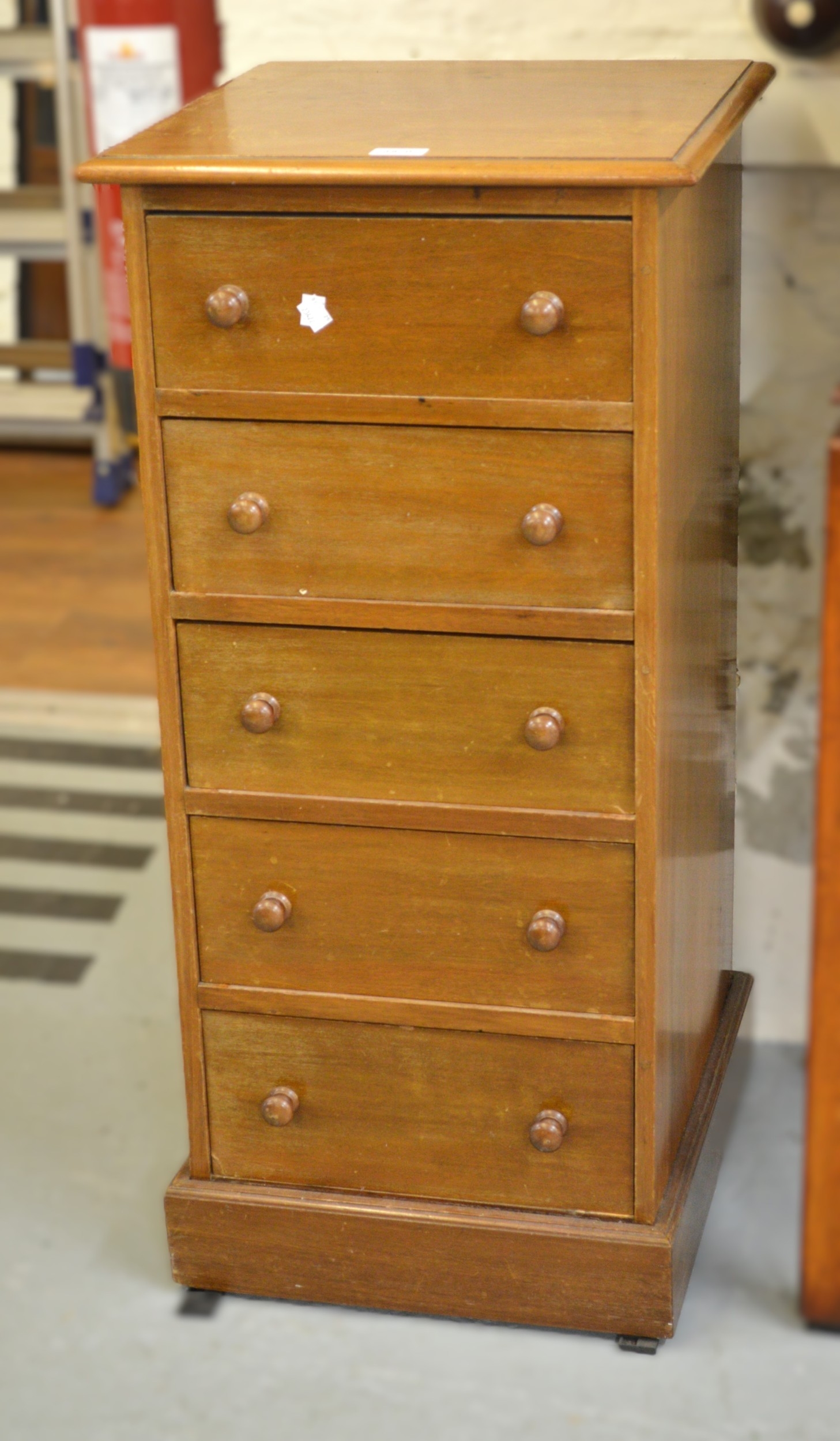 20th Century mahogany pillar chest having five drawers with knob handles on plinth base, 43 x 45 x 91cm