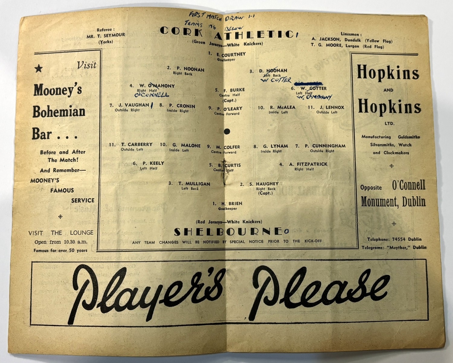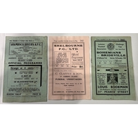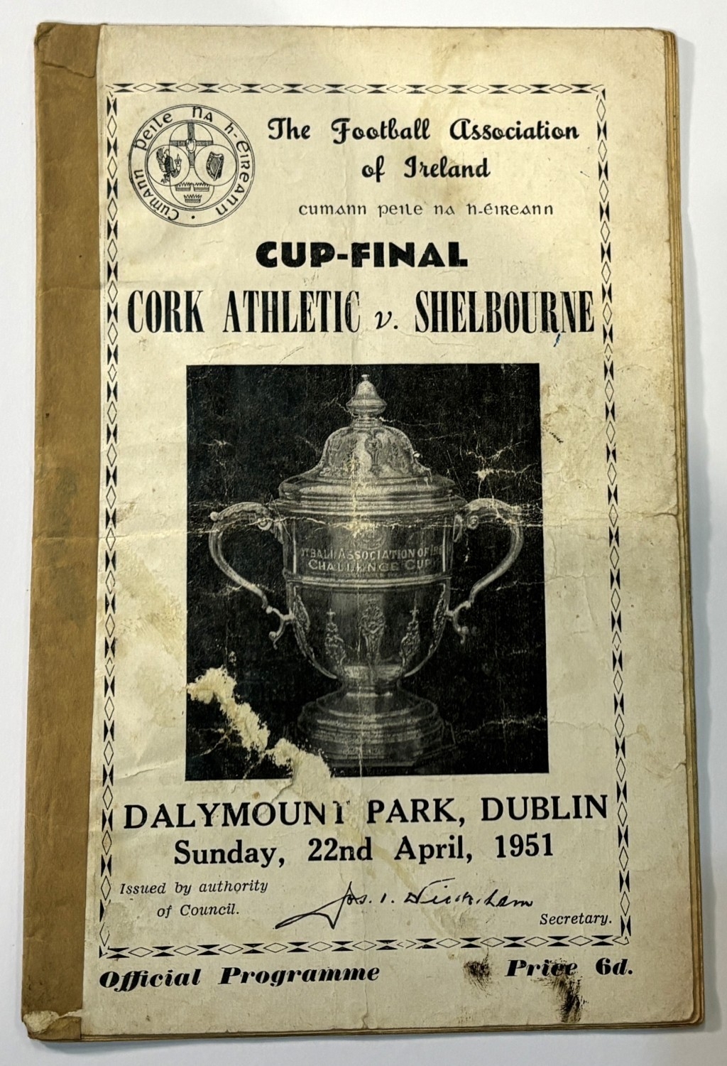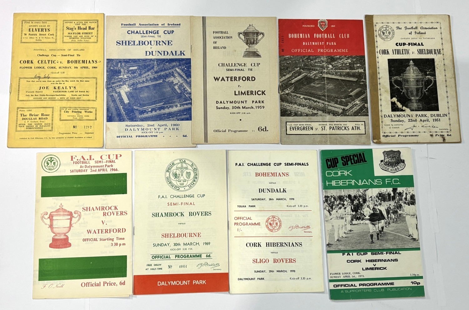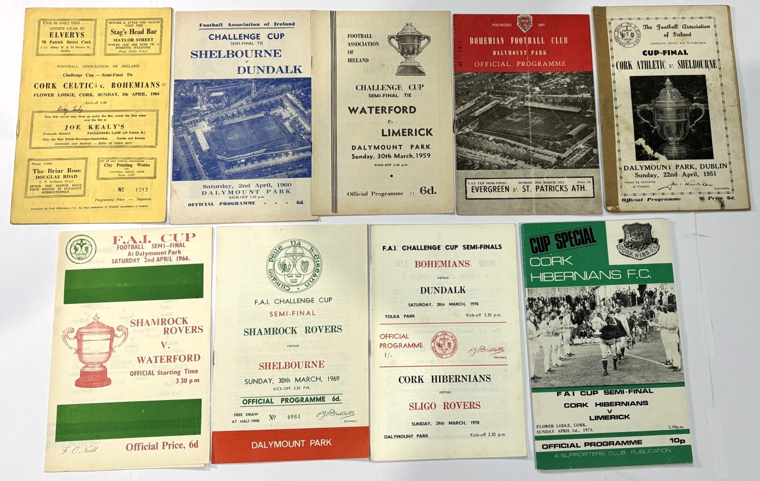 Collection of programmes 1951 FAI Cup Final Cork Athletic v Shelbourne (heavy tape to cover), 1953 FAI semi-final Evergreen v St. Patrick’s Athletic, 1959 FAI semi-final Waterford v Limerick, 1960 FAI semi-final Shelbourne v Dundalk, 1964 FAI semi-final Cork Celtic v Bohemians, 1966 FAI semi-final Shamrock Rovers v Waterford etc.