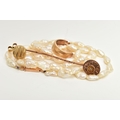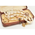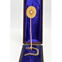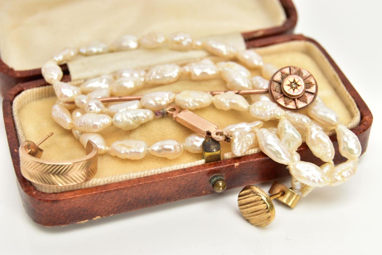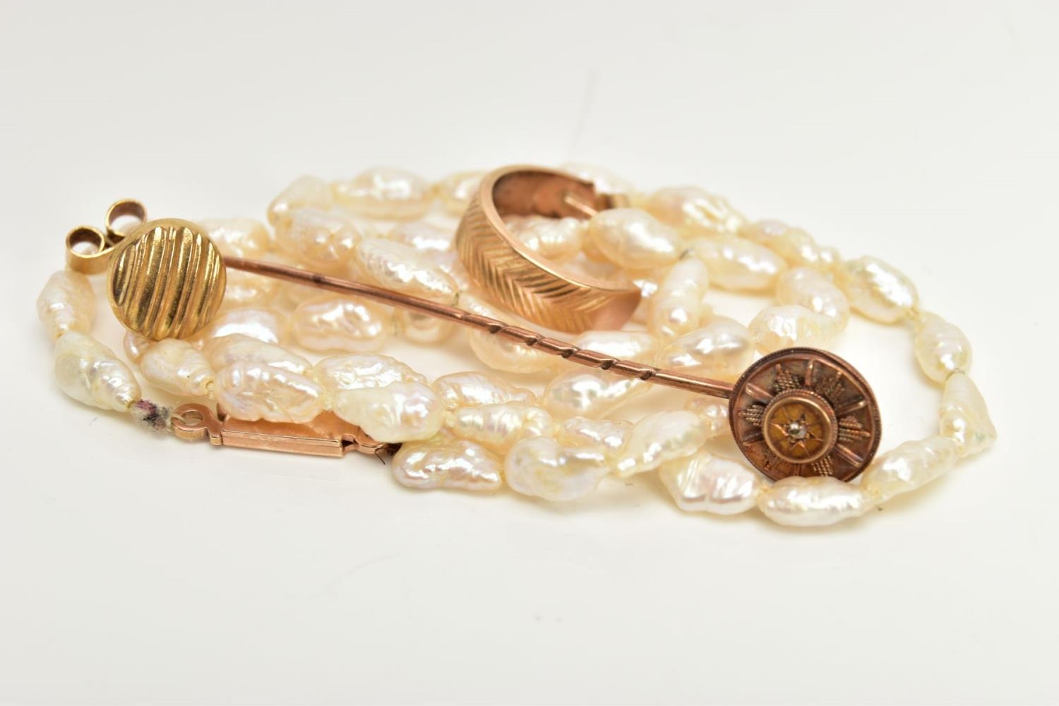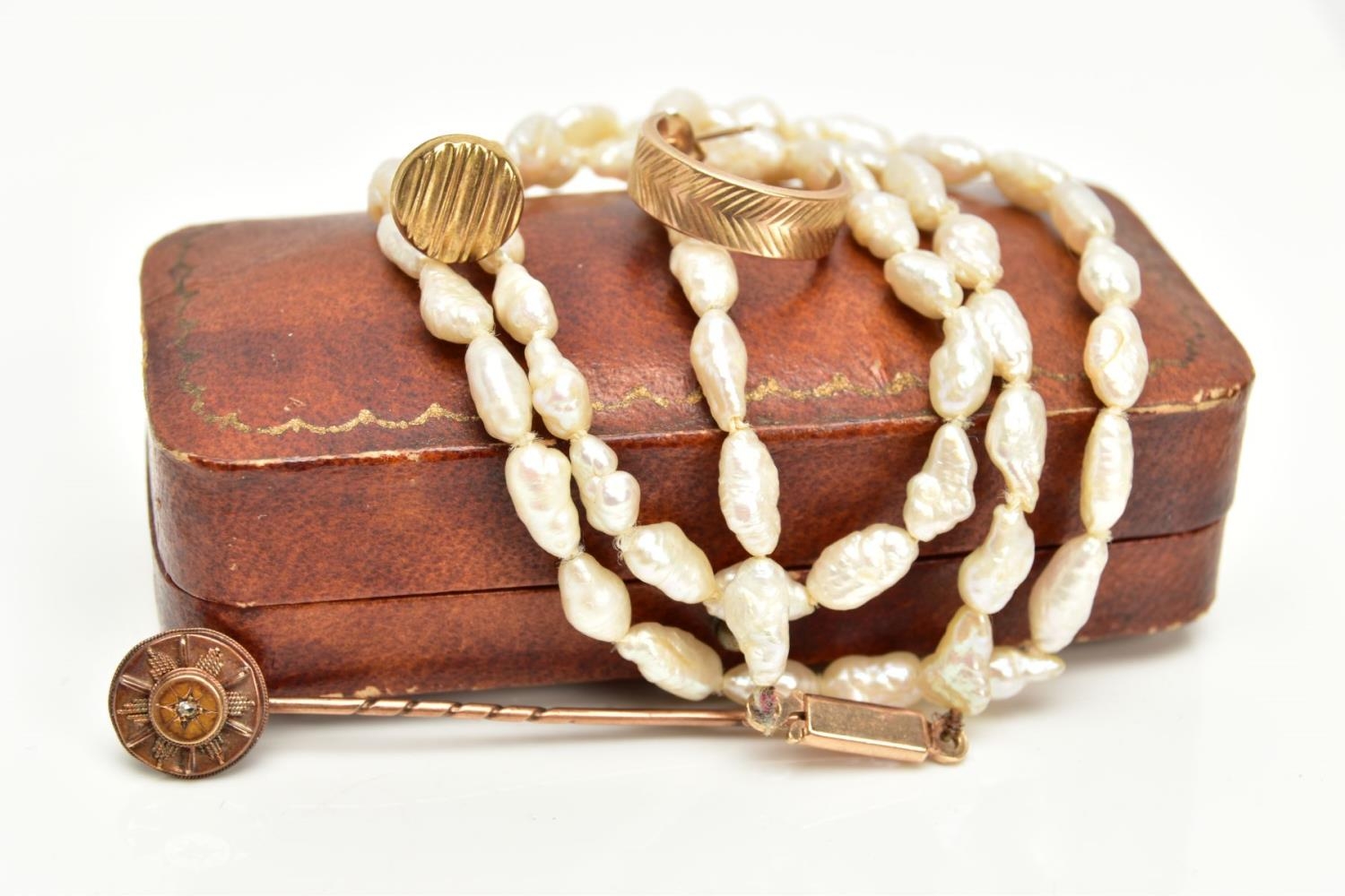 A 9CT GOLD EARRING, YELLOW METAL STICK PIN AND OTHER JEWELLERY ITEMS, a circular stud earring fitted with a post and scroll fitting, hallmarked 9ct Birmingham 1976, approximate gross weight 0.5 grams, a round stick pin set with a small rose cut diamond, stamped 15ct, approximate gross weight 1 gram, a cultured fresh water baroque pearl necklace, fitted with a yellow metal clasp, unmarked, a yellow metal hoop earring, unmarked, approximate gross weight 0.3 grams,