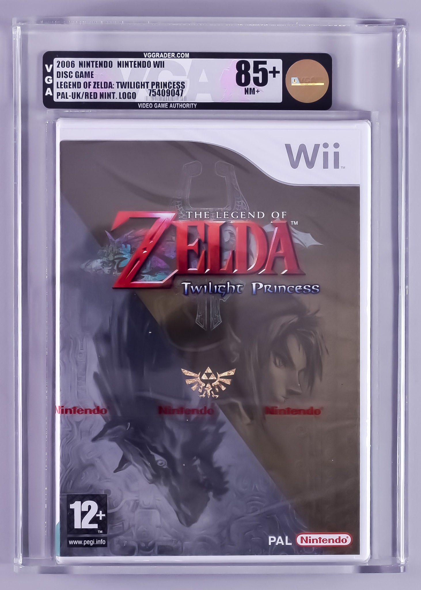 2006 Nintendo Wii – The Legend of Zelda Twilight Princess – PAL/UK Version White Nintendo Logo Game VGA 85+/NM+, with red Nintendo strip seal and in rigid Perspex case supplied by VGA at the time of grading