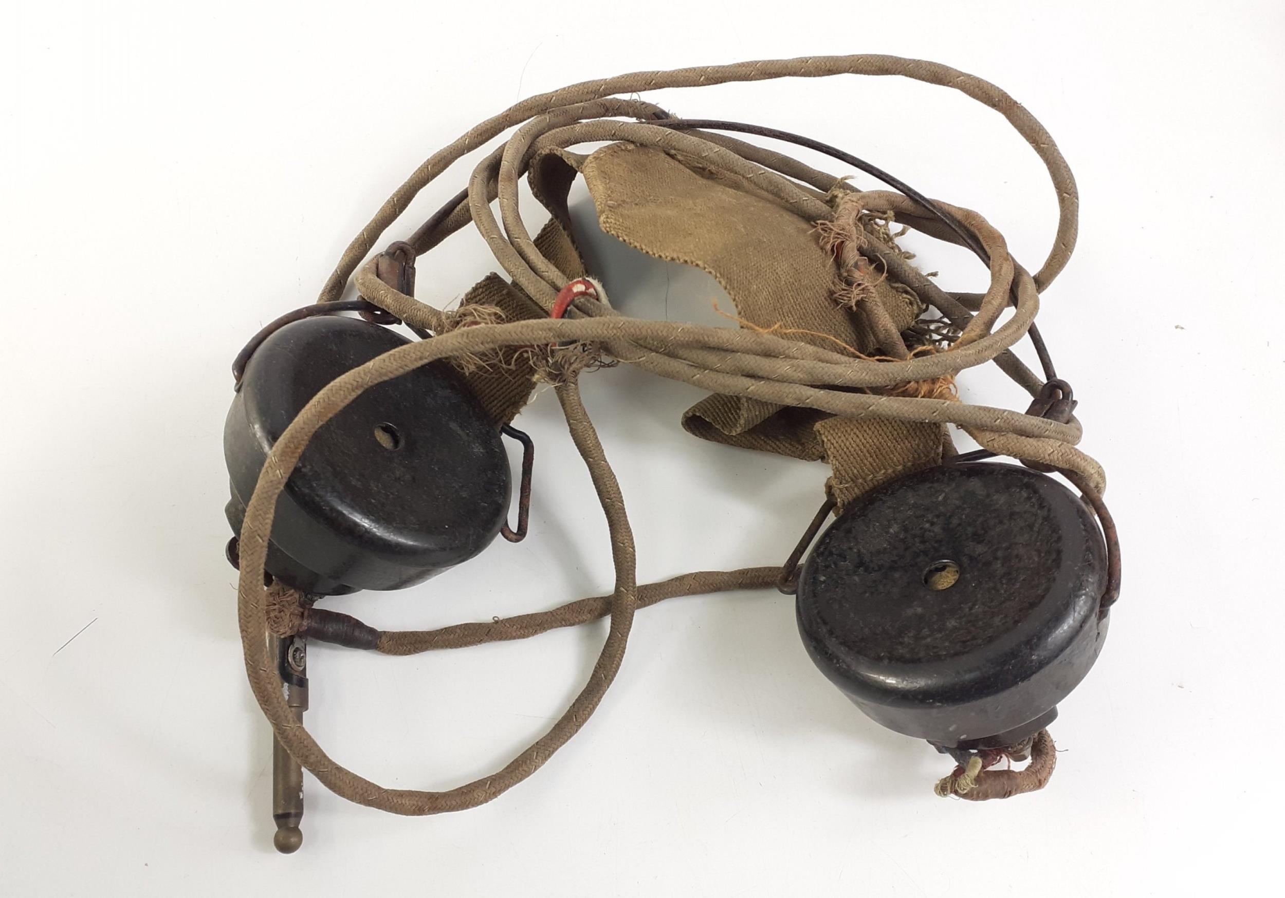 A pair of VINTAGE earphones - possibly of military origin.