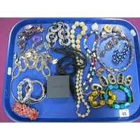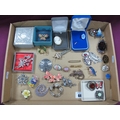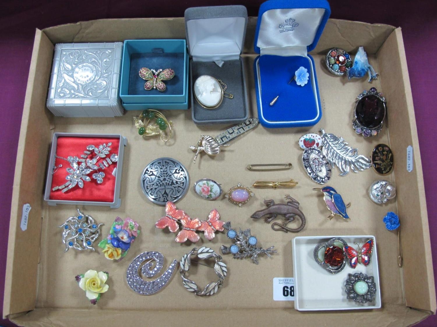 Assorted Costume Brooches, including oval shell carved cameo brooch, depicting female profile, 'Miracle', St.Justin pewter, Jewelcraft, vintage H.Samuel plastic box etc.
