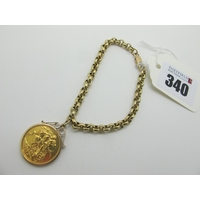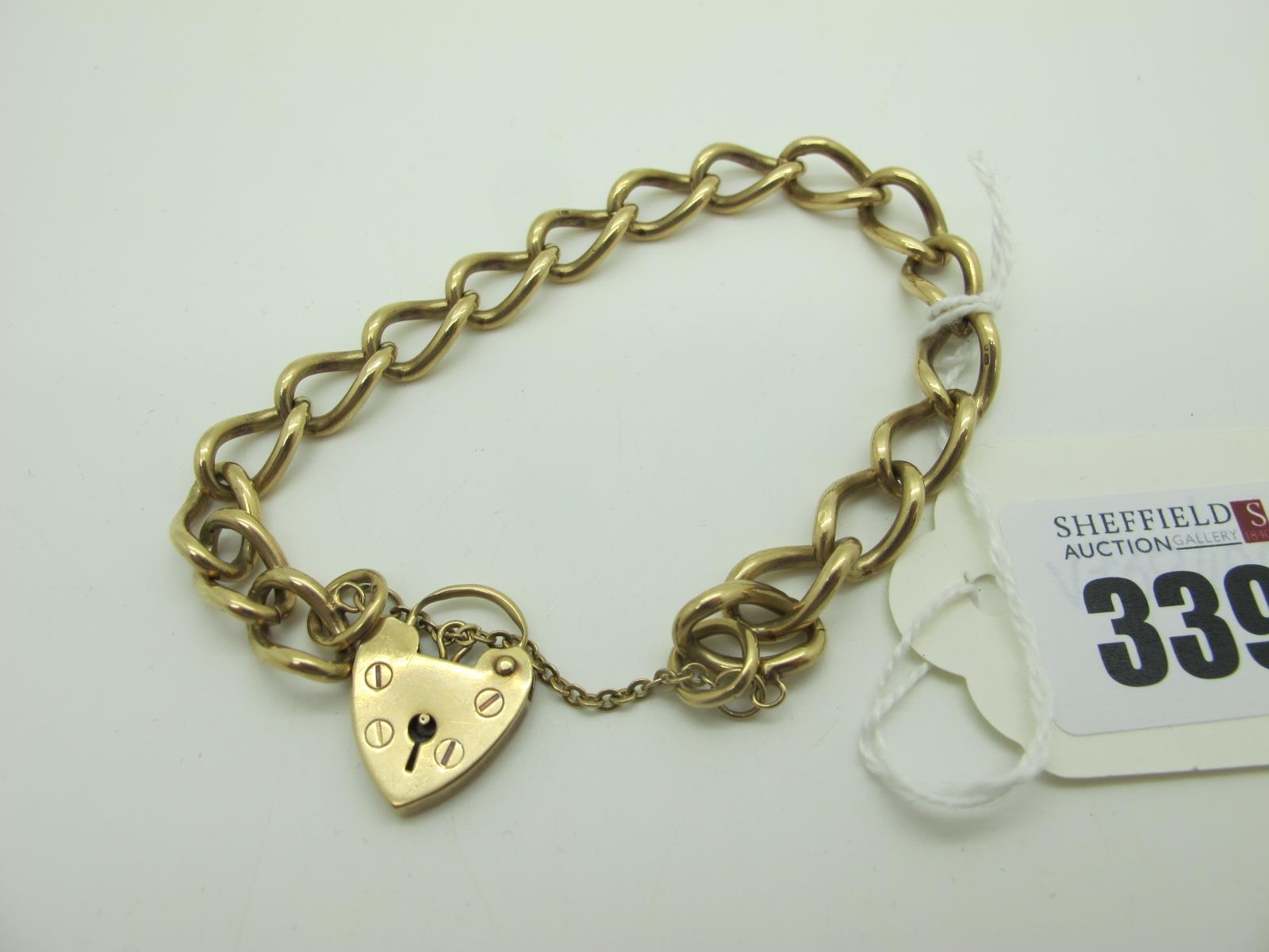 A Curb Link Charm Style Bracelet, stamped "375", to 9ct gold heart shape padlock clasp (20grams).