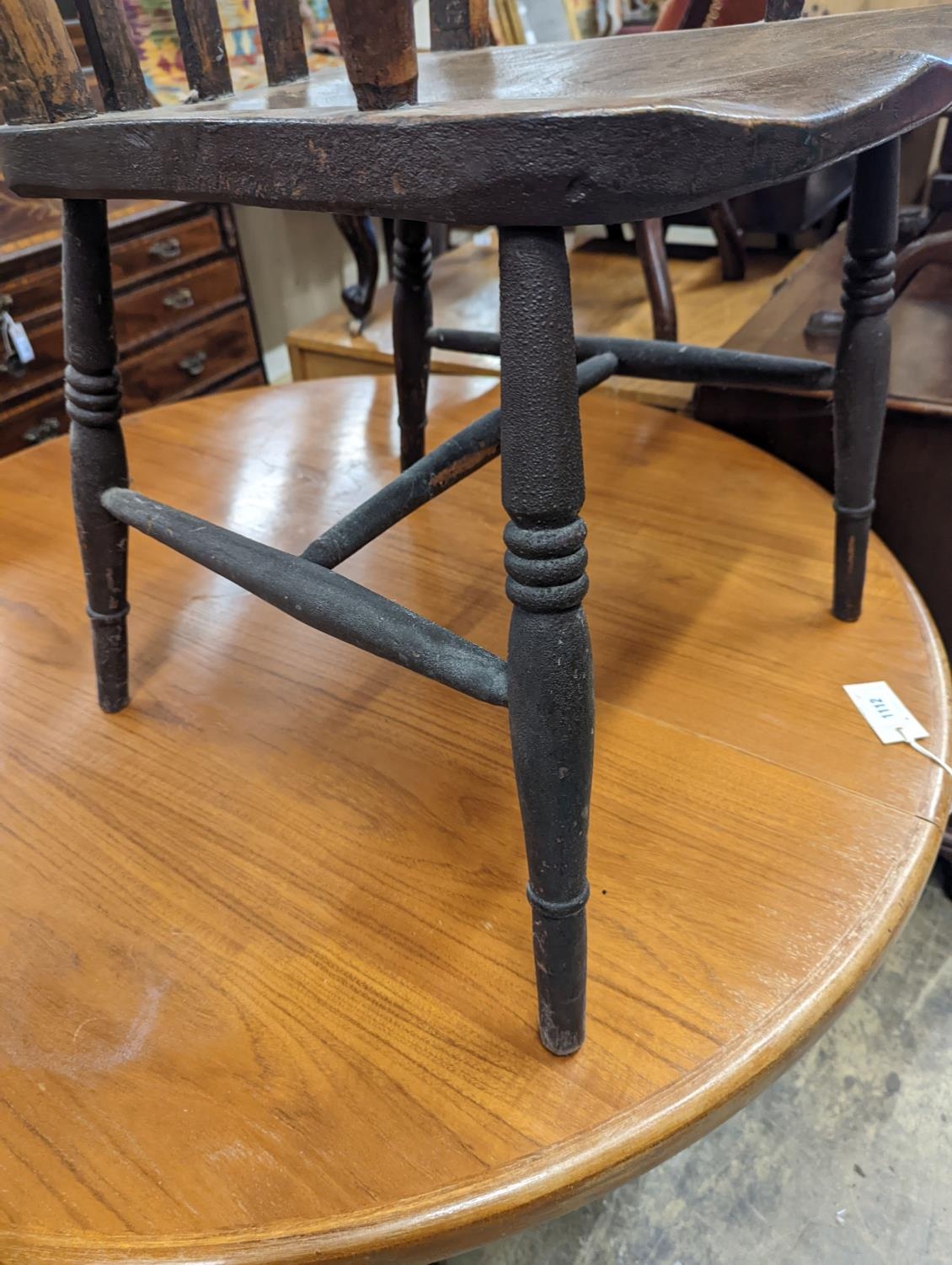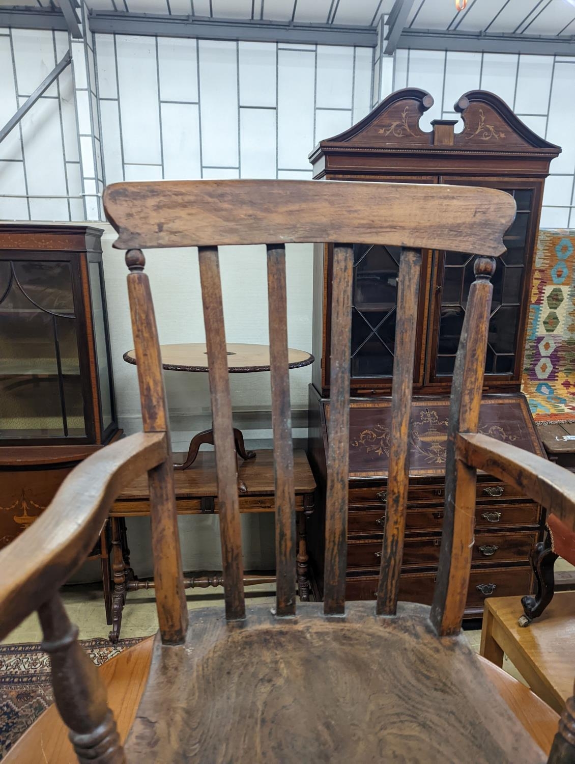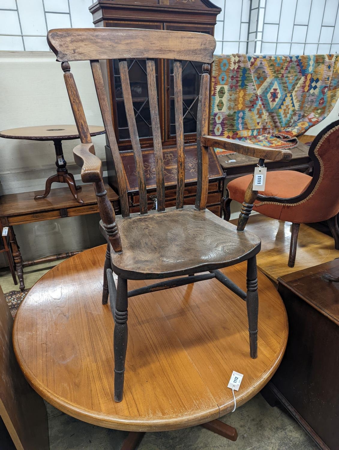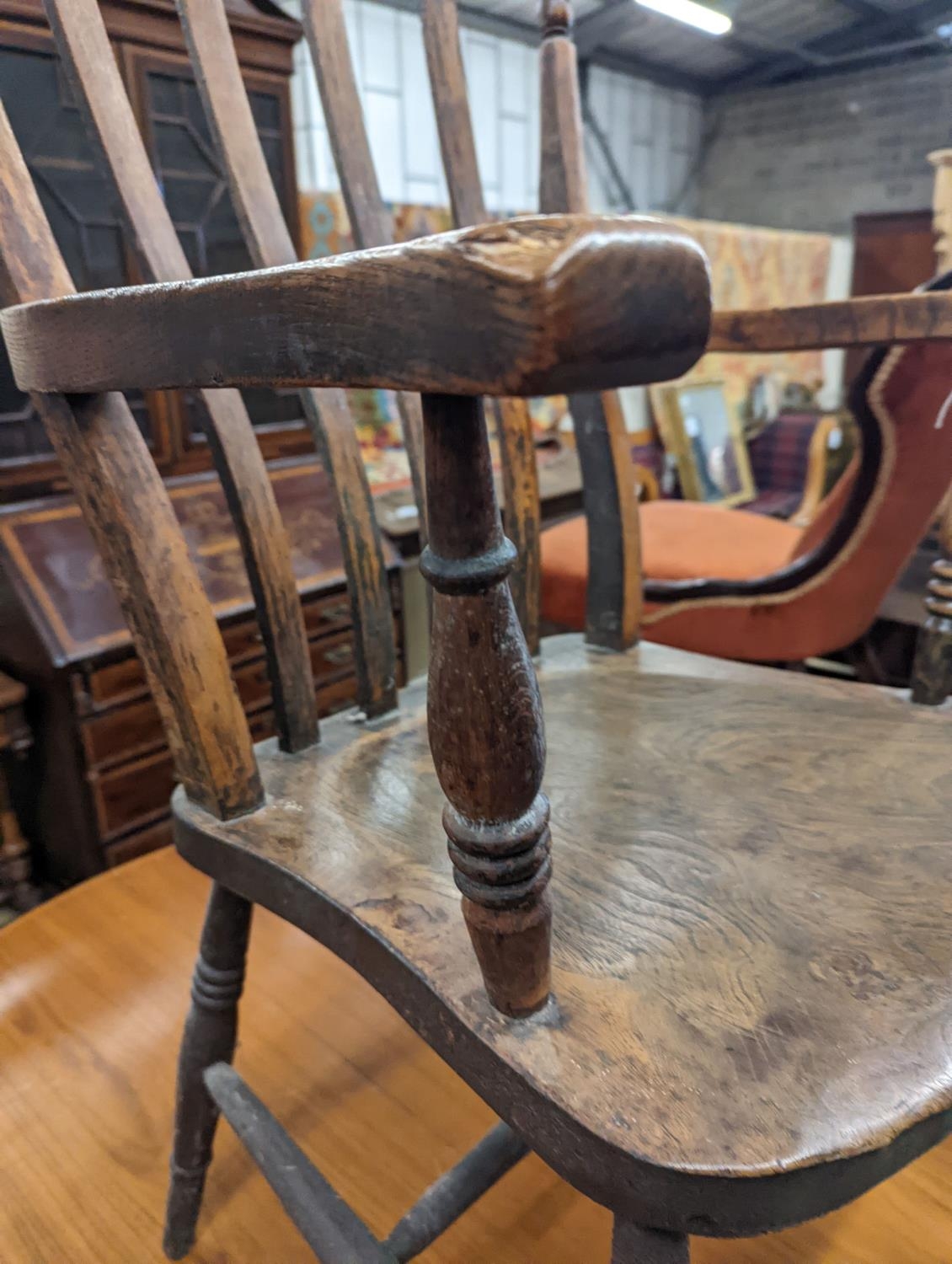 A Victorian elm and beech Windsor lathe back elbow chair, width 58cm, depth 47cm, height 109cm