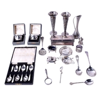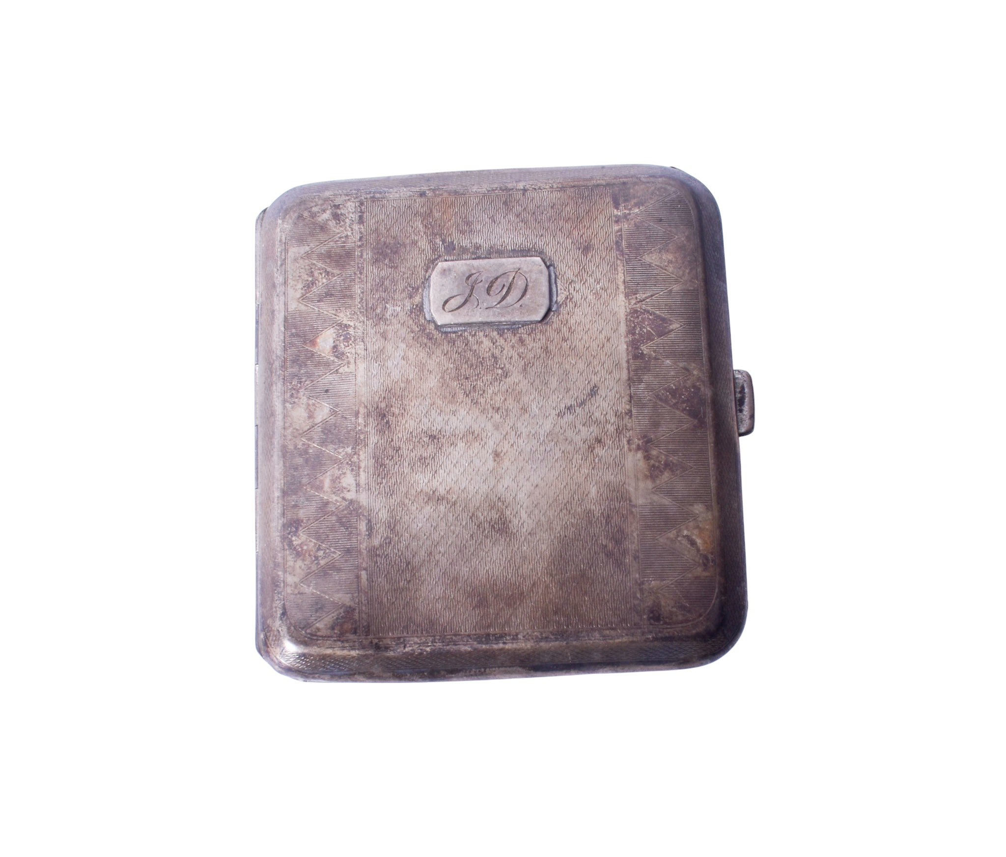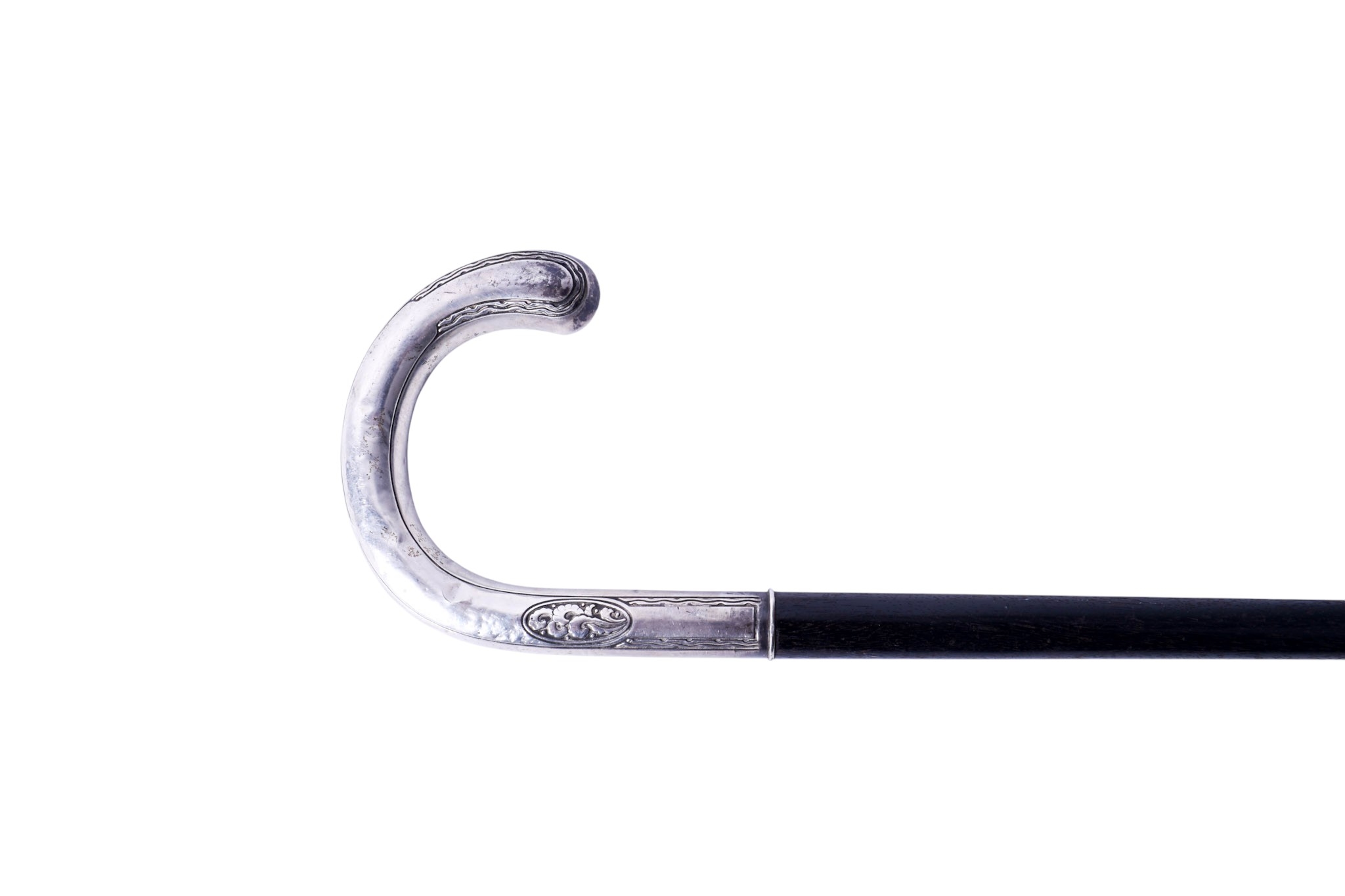 Two white metal handled walking canes and a cigarette case. One handle decorated, the cigarette case with machine engraved decoration and raised monogram plaque, all unmarked.