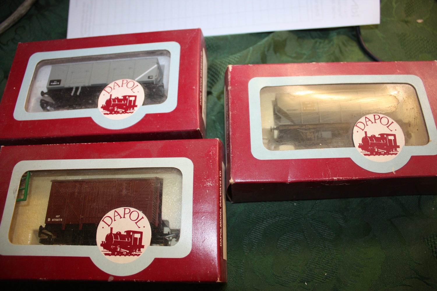 Three Boxed Dapol OO Scale Freight Wagons: 20 Ton Steel Mineral Wagon in BR Grey, One 21 Ton Hopper in BR Grey and 1 Ten Ton Meat Van in BR Brown