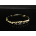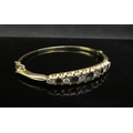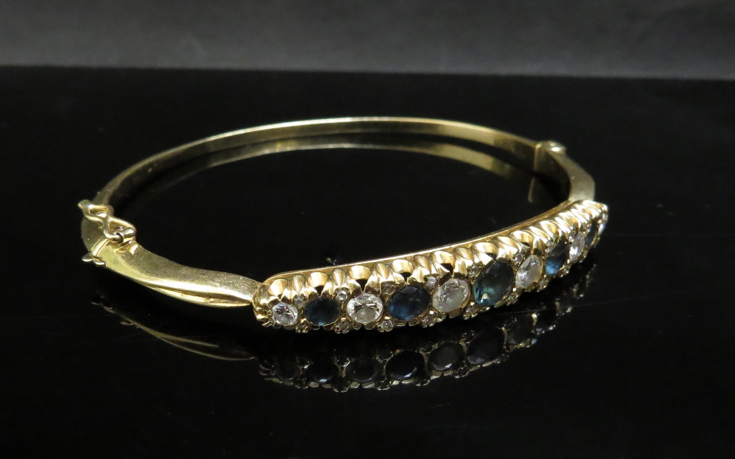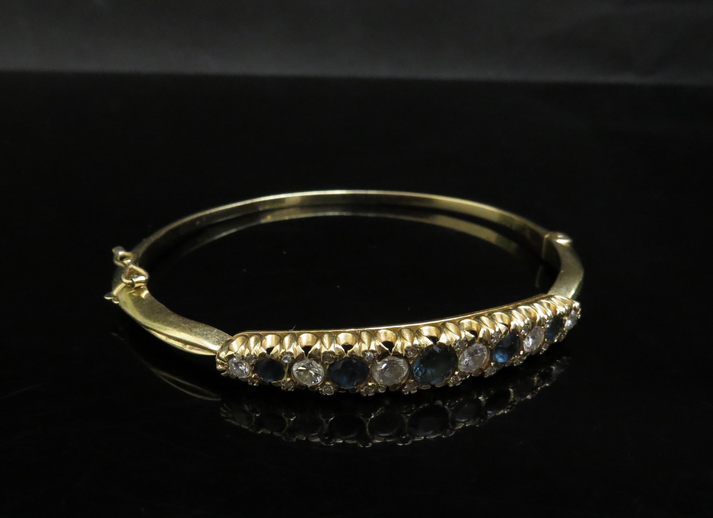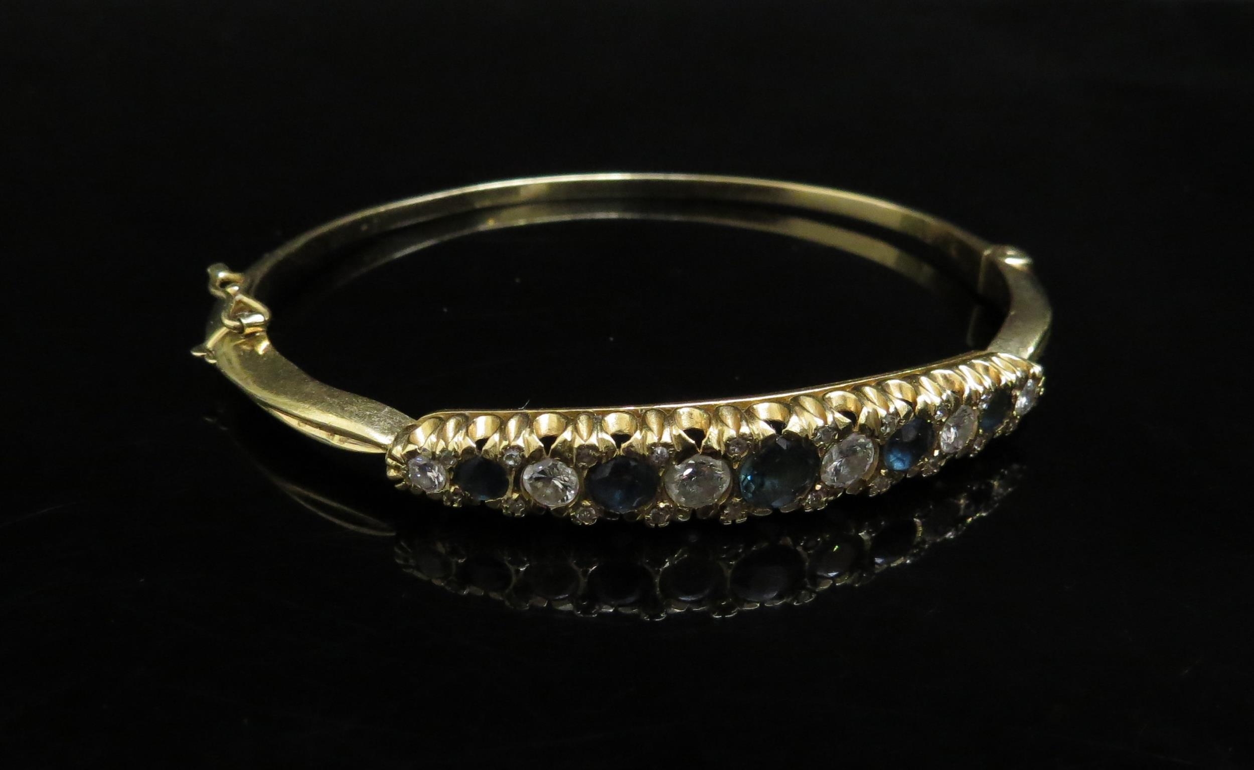 A gold stiff hinge bangle set with alternate sapphires and diamonds, 1ct approx diamond total, unmarked 21.2g, with insurance receipt 1989