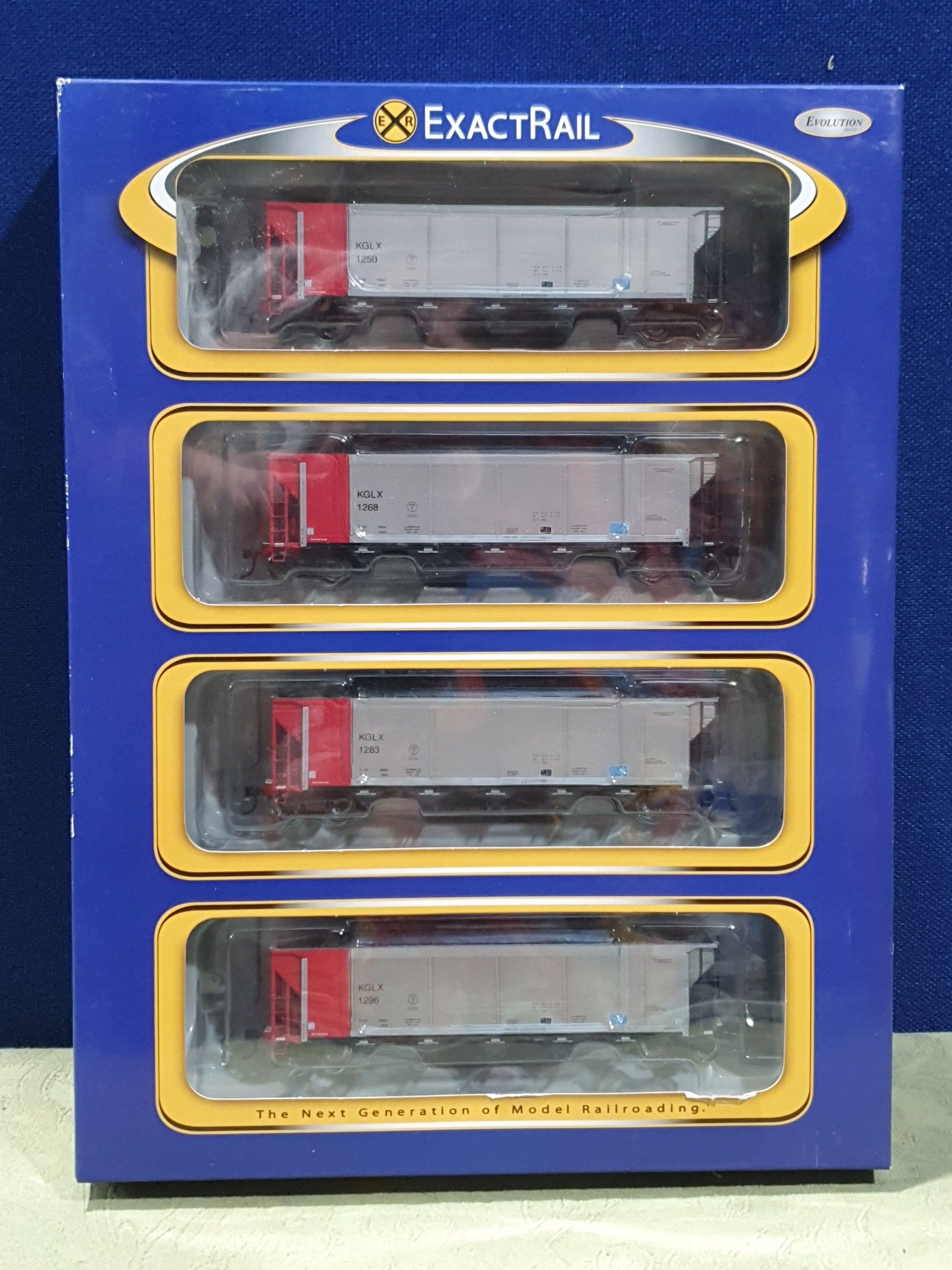 A boxed ExactRail H0 scale Set of four KGLX Johnstown Autoflood II Coal Hopper Wagons, unopened from new