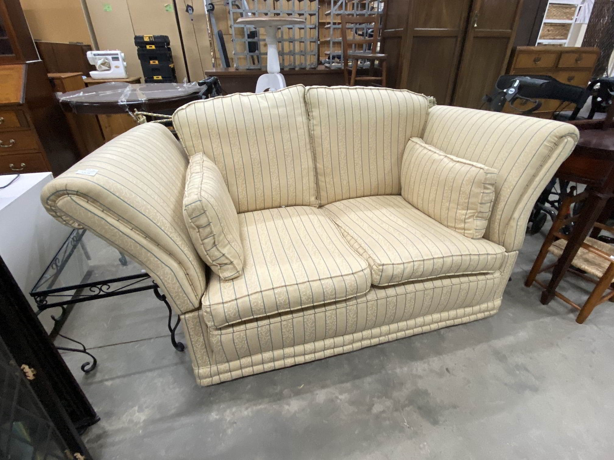 Knoll inspired settee, upholstered in gold/green 93H 163W 88D