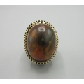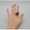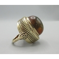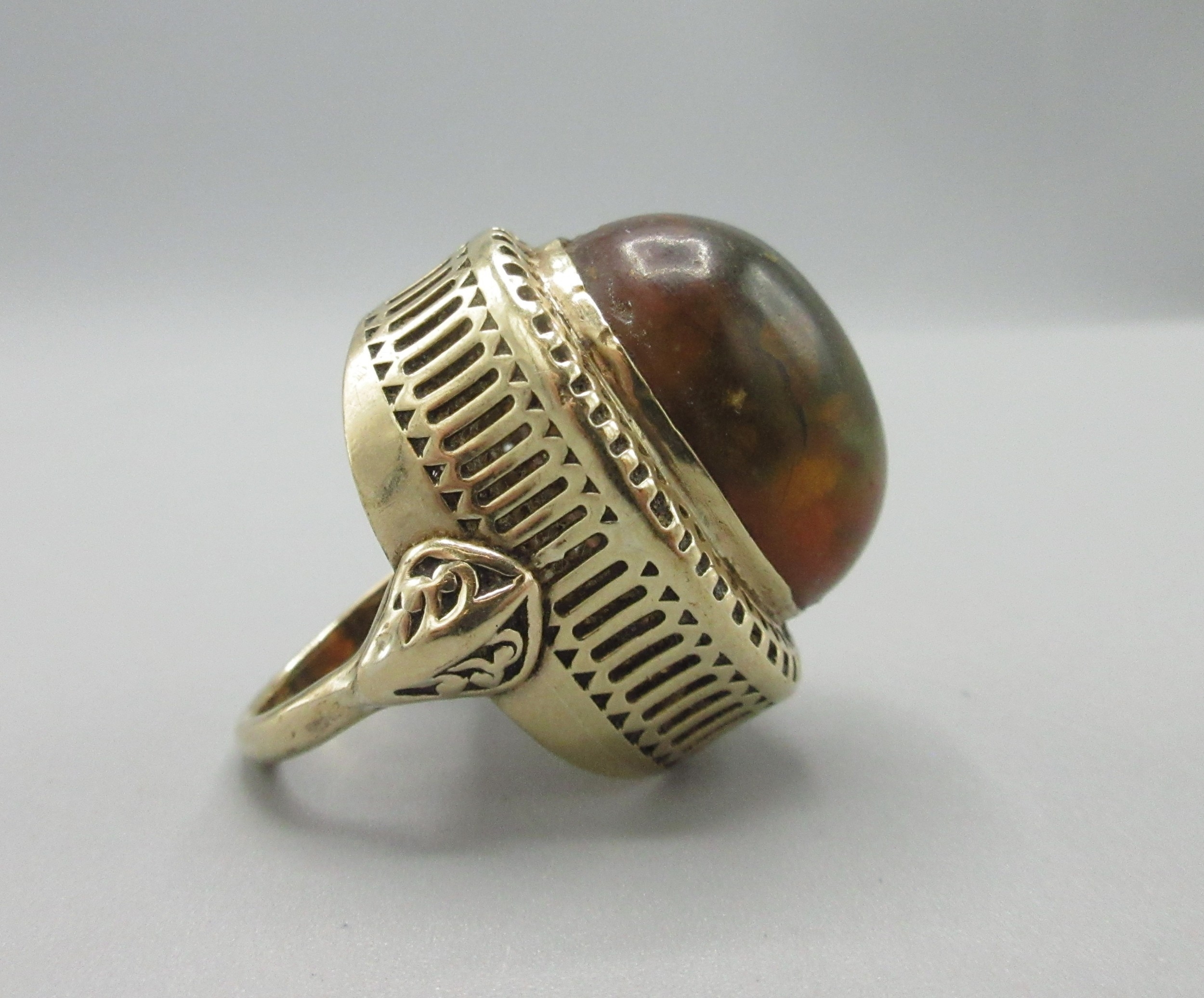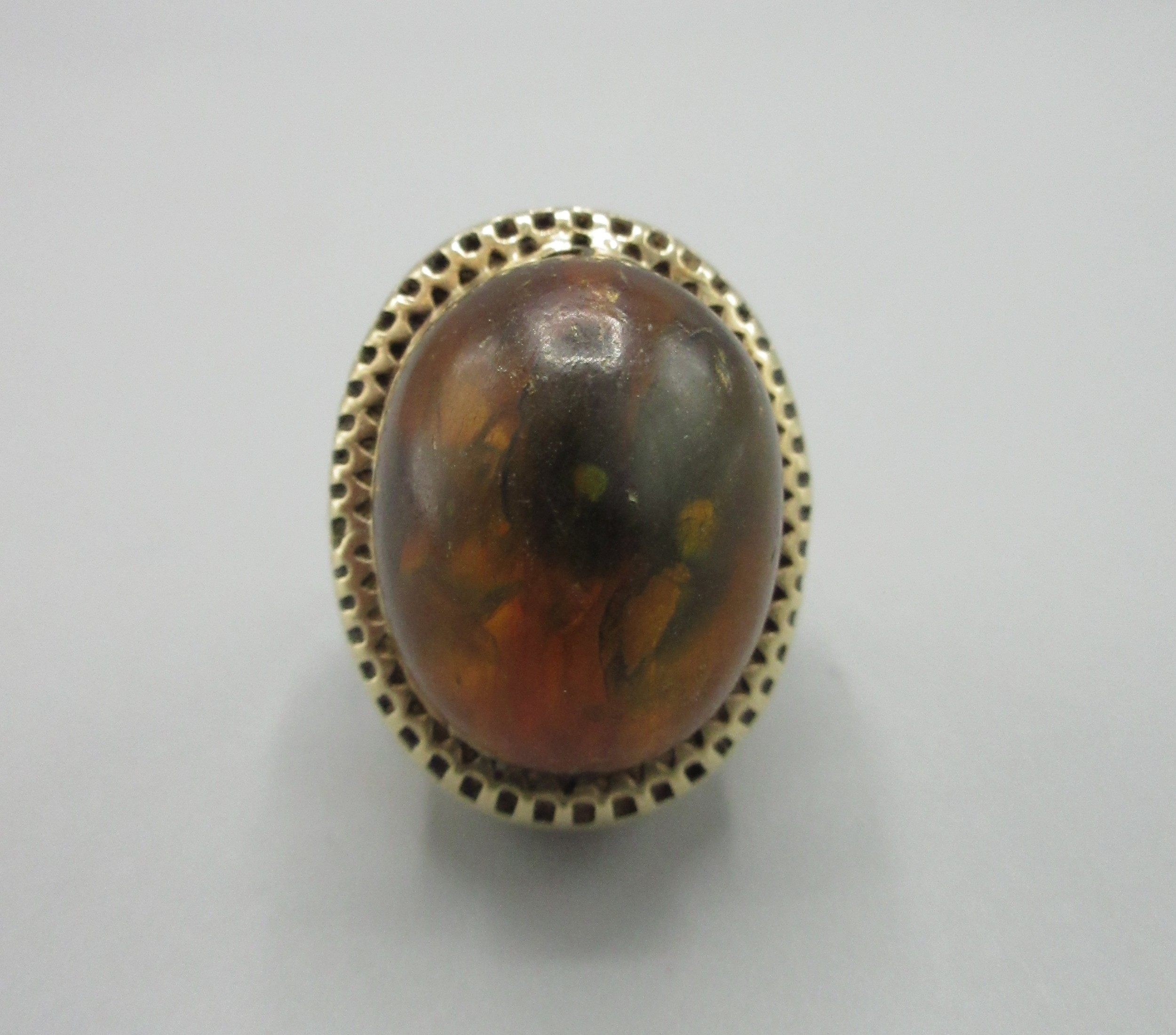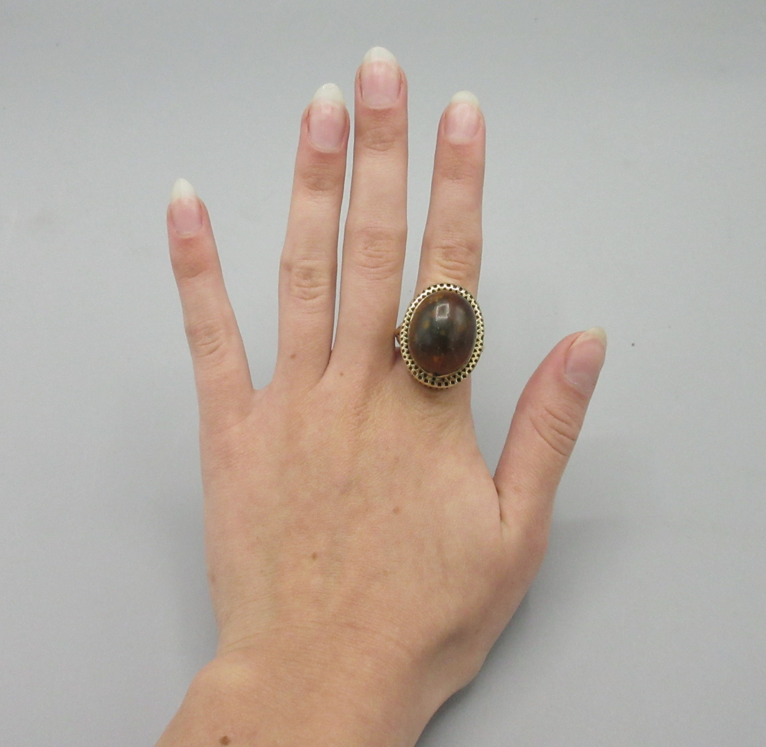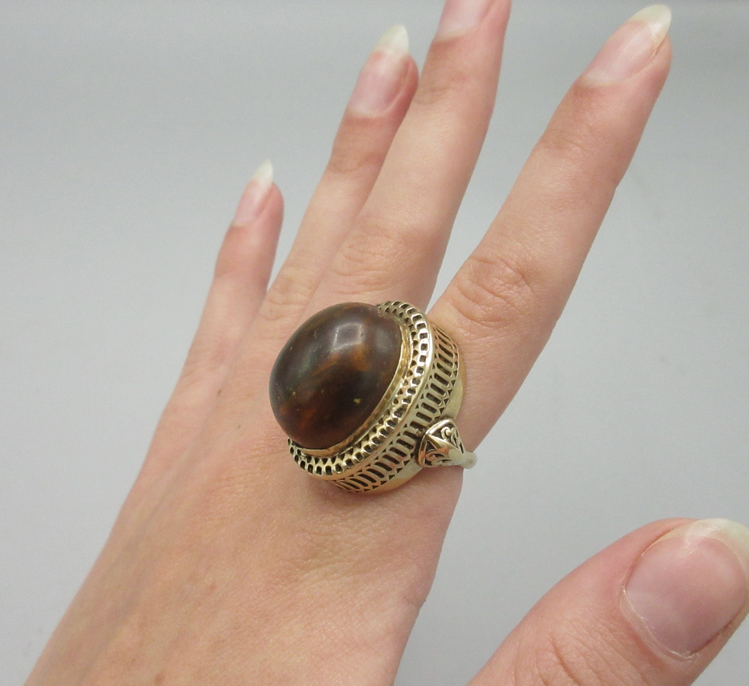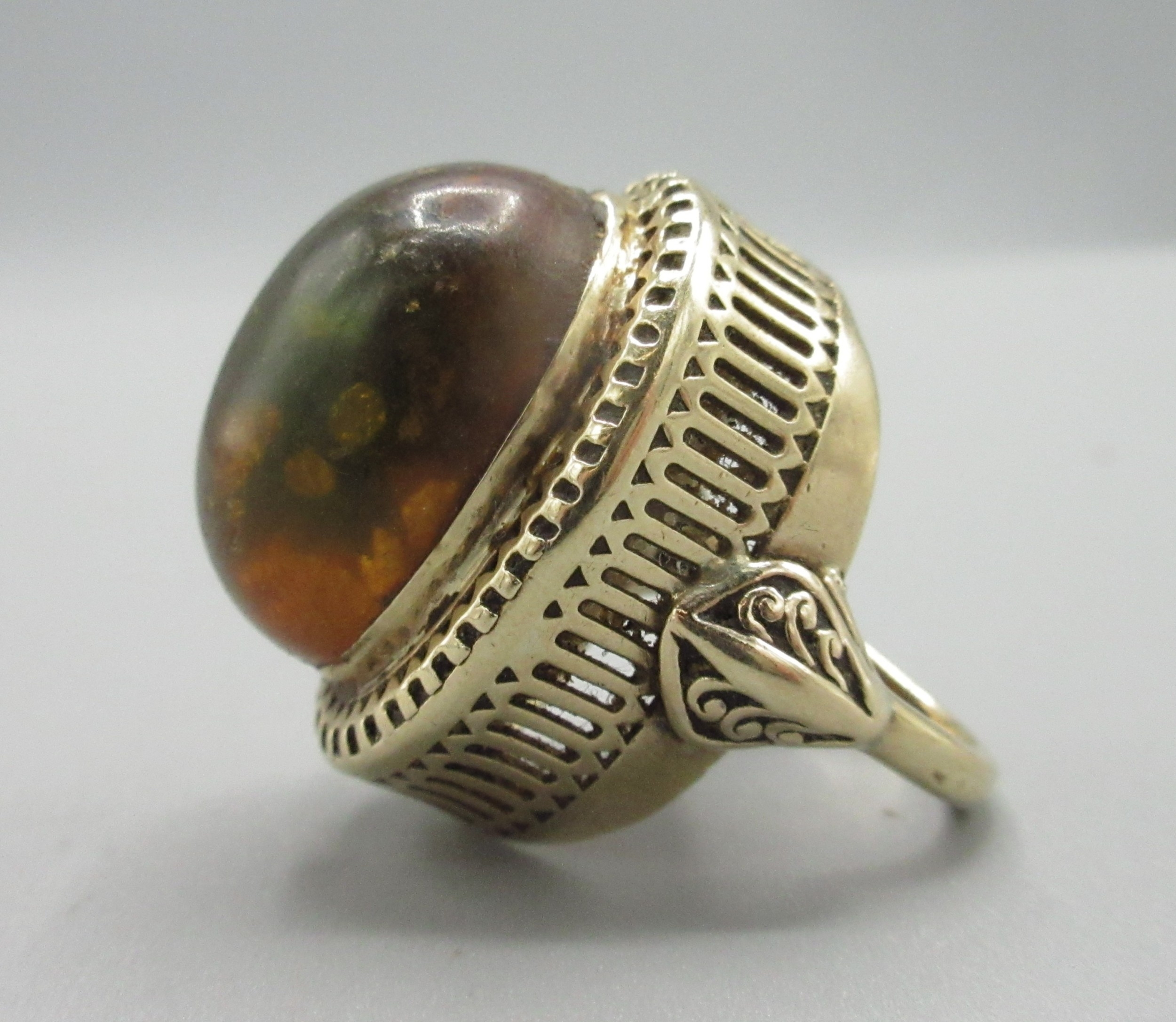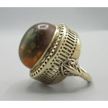 9ct yellow gold cocktail ring set with large amber stone, stamped 750, size L, 10.7g