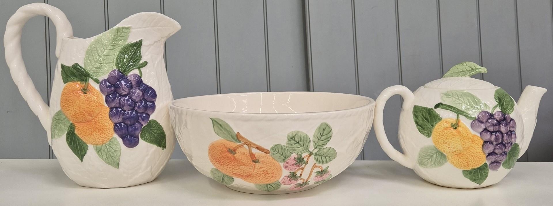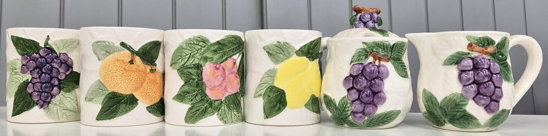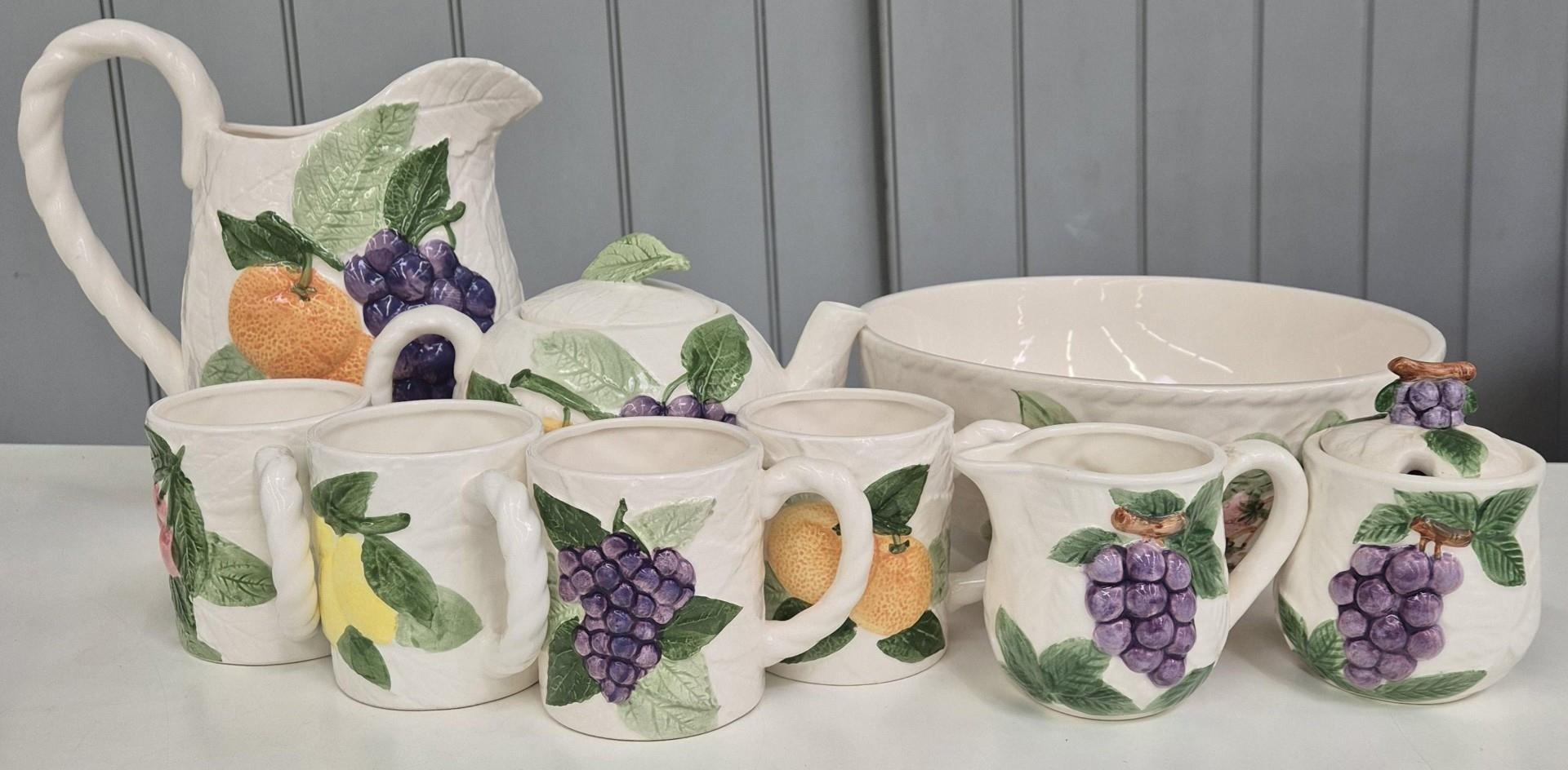 A nine-piece, Fruit du Jour style tableware set. Tallest 23cm.