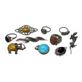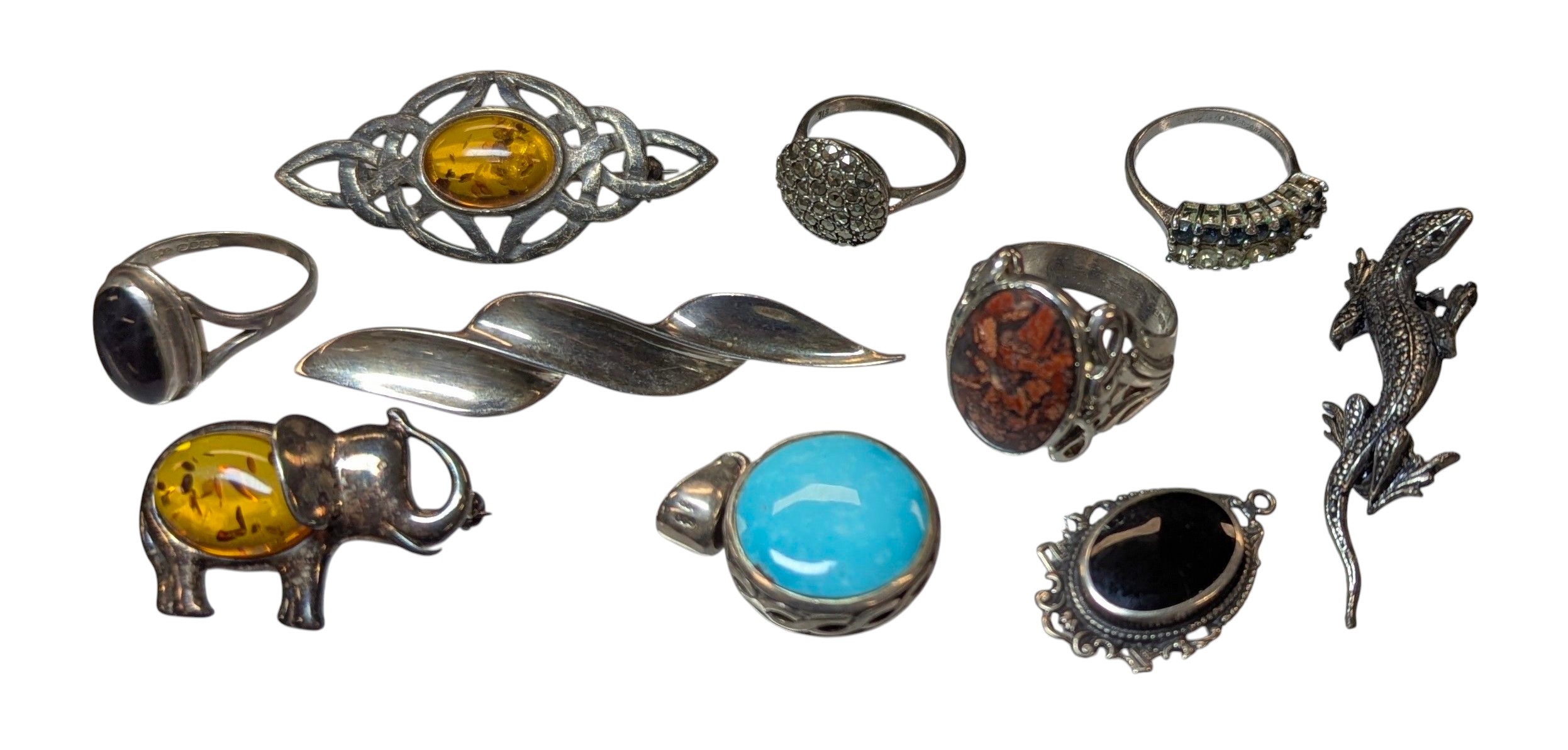 the silver jewellery includes four silver rings; including labradorite, marcasite, red jasper? and a blue and white paste stone set, a mother of pearl and turquoise set pendant, a black onyx set pendant (missing bale) and three silver brooches including two cabcohon amber set brooches, total gross weight of the silver jewellery is approx. 54g, a/f