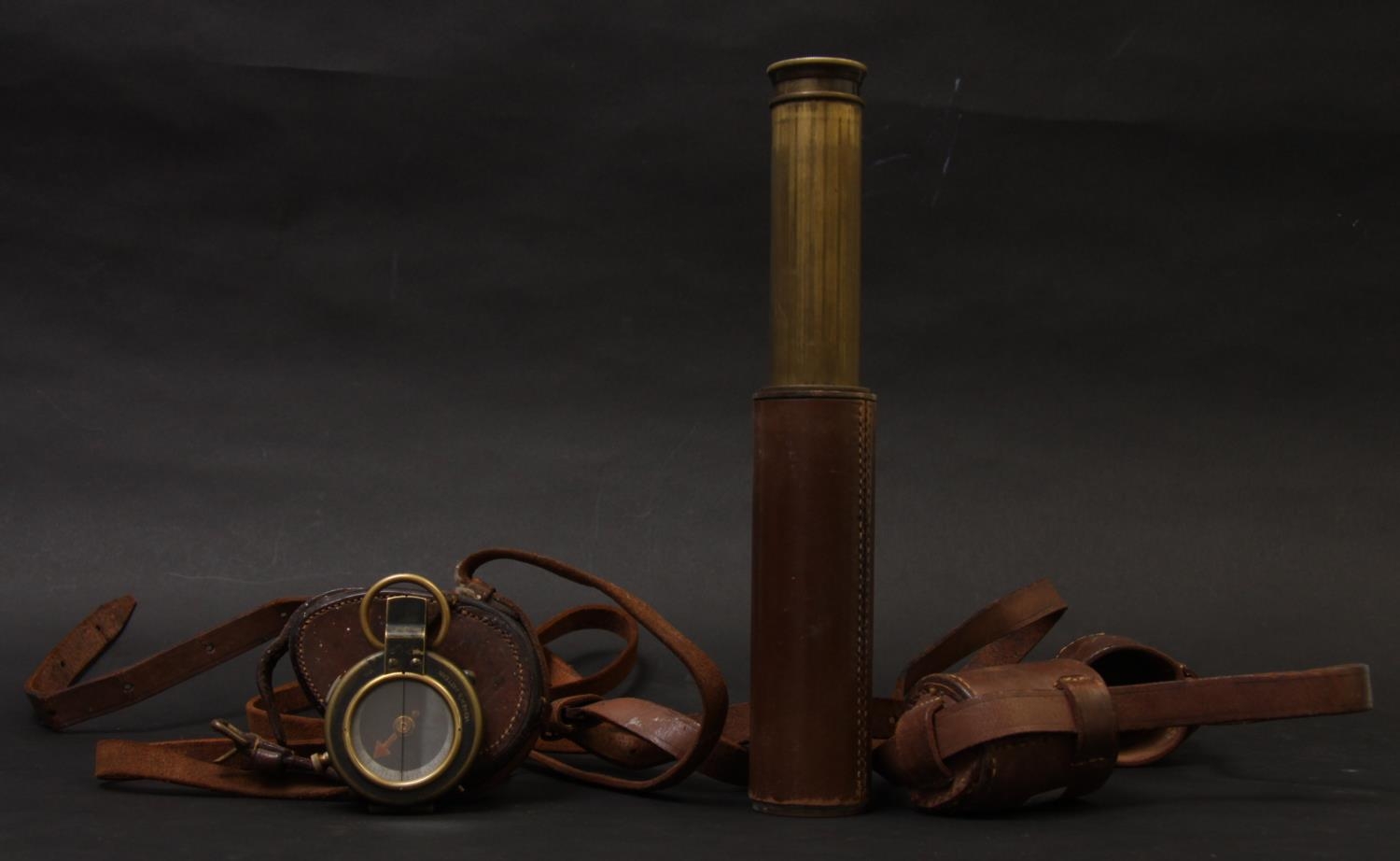 Militaria, World War One, 1918 Verner's Pattern brass compass, Britannic Brass telescope, in leather fittings [2]