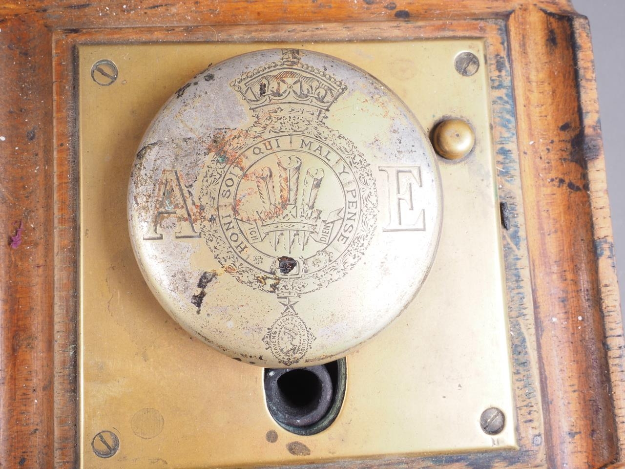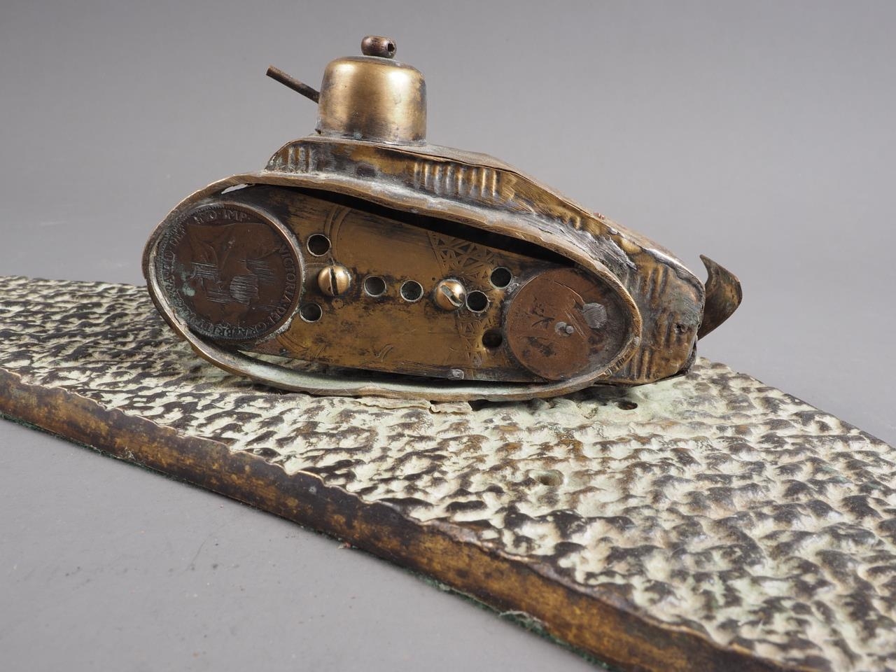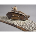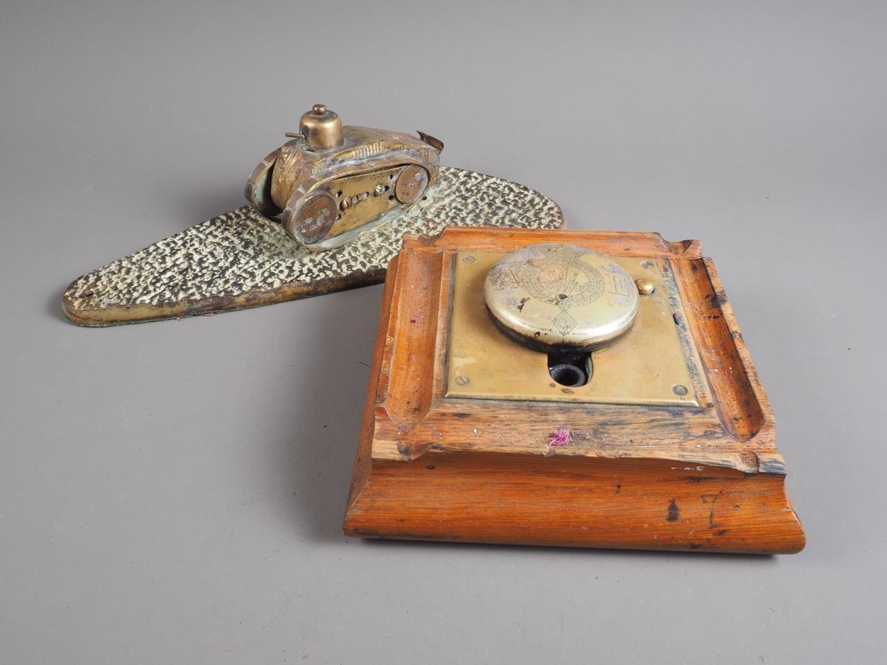 A trench art model Renault FT 17 tank and an oak and brass mounted inkstand, 6 3/4" high