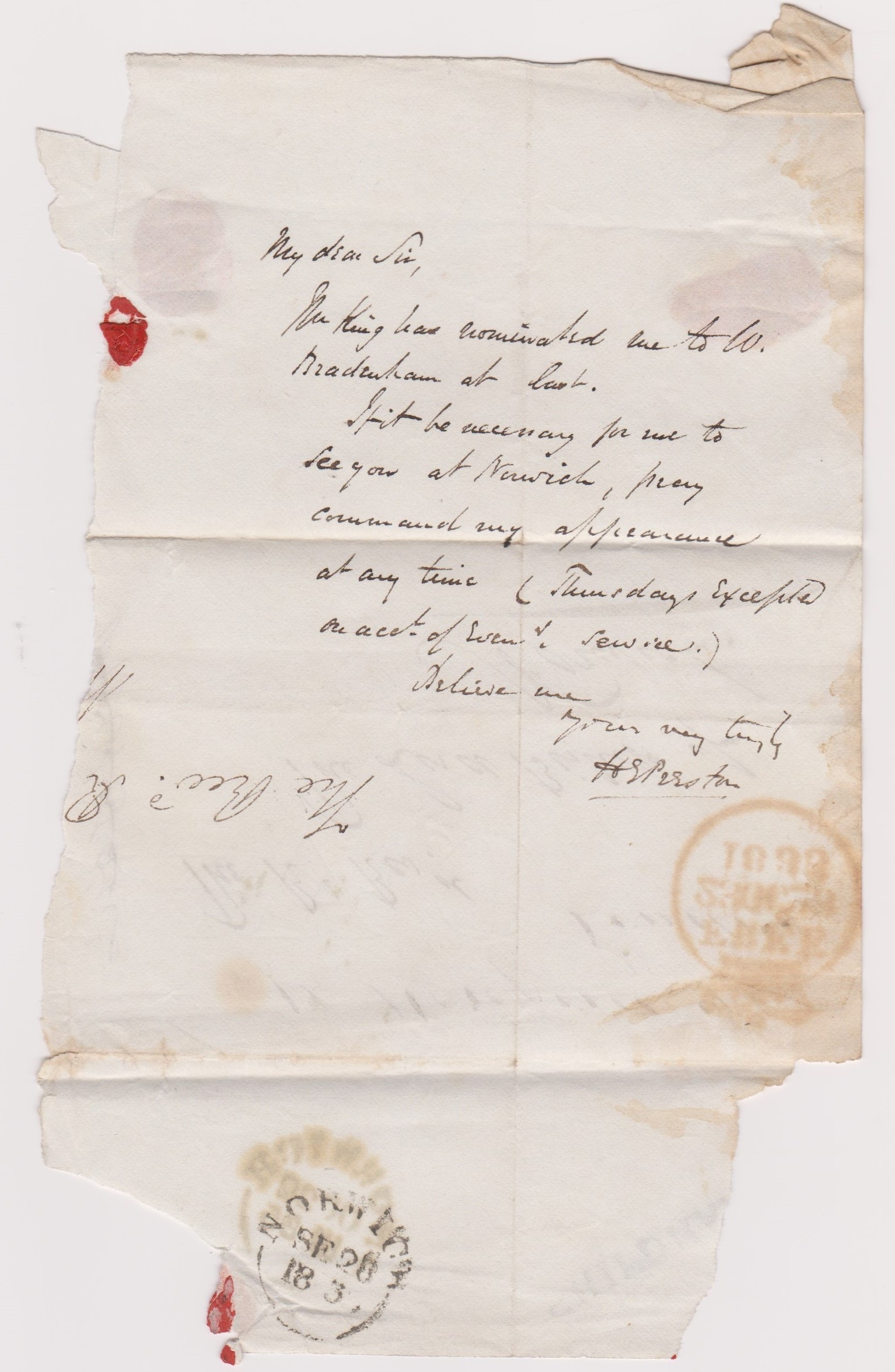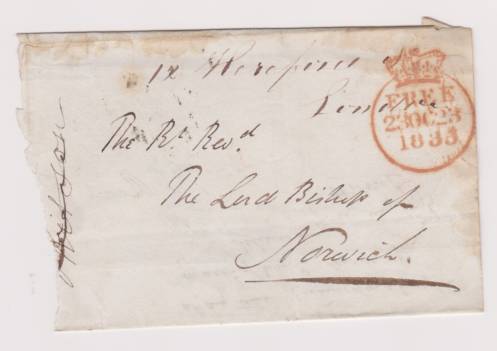 Great Britain 1835-damaged EL posted London to the Lord Bishop of Norwich with a Royal instruction referred to cancelled OC23/1835 with red crown Free cancel-black Norwich cancel and single line Shipdham cancel