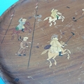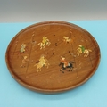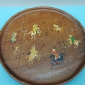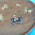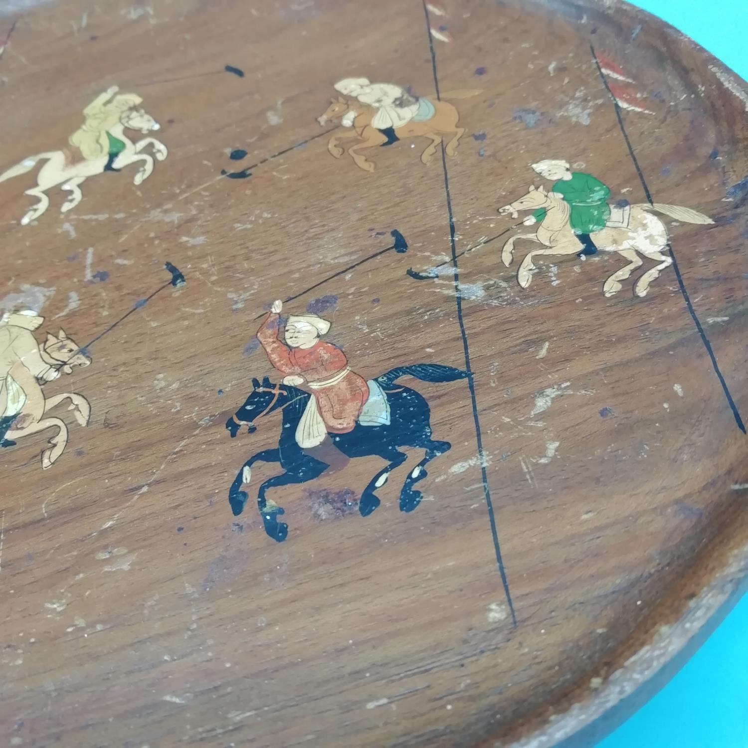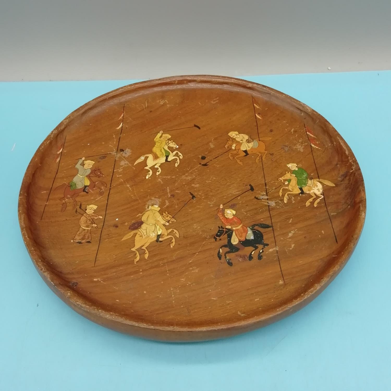Late 19th/Early 20th Century Persian Wooden Footed Tray. Hand Painted with Polo Players. 22cm Diameter.