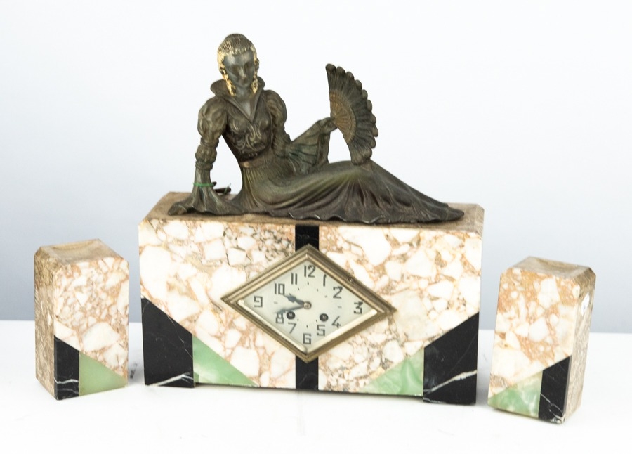 FRENCH ART DECO MARBLE AND SPELTER THREE PIECE FIGURAL CLOCK GARNITURE, the clock of oblong form with diamond shaped Arabic dial and surmounted by a reclining female figure holding an open fan, 16” (40.6cm) high, together with a MATCHING PAIR OF SIDE PIECES with dished tops, 6 ¼” (15.9cm) high, (3), lacks two feet to the underside of the clock and one of the side pieces, the other lacking one, repairs to the marble on the front of the clock and only traces of white to the figures hair, otherwise spelter is dull