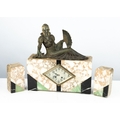 FRENCH ART DECO MARBLE AND SPELTER THREE PIECE FIGURAL CLOCK...