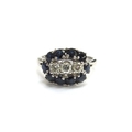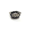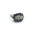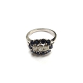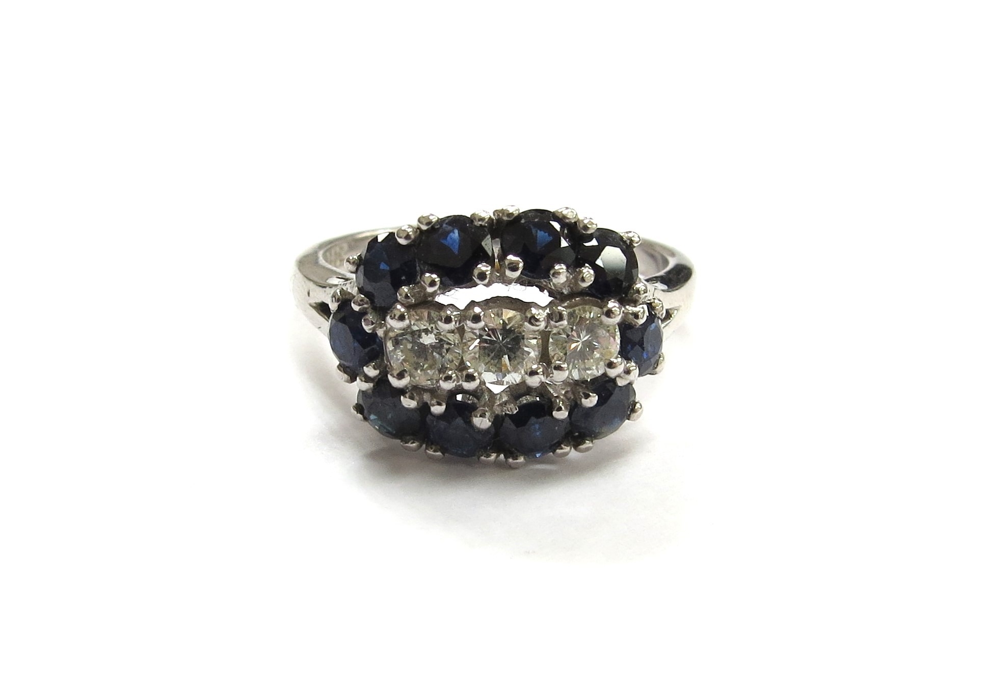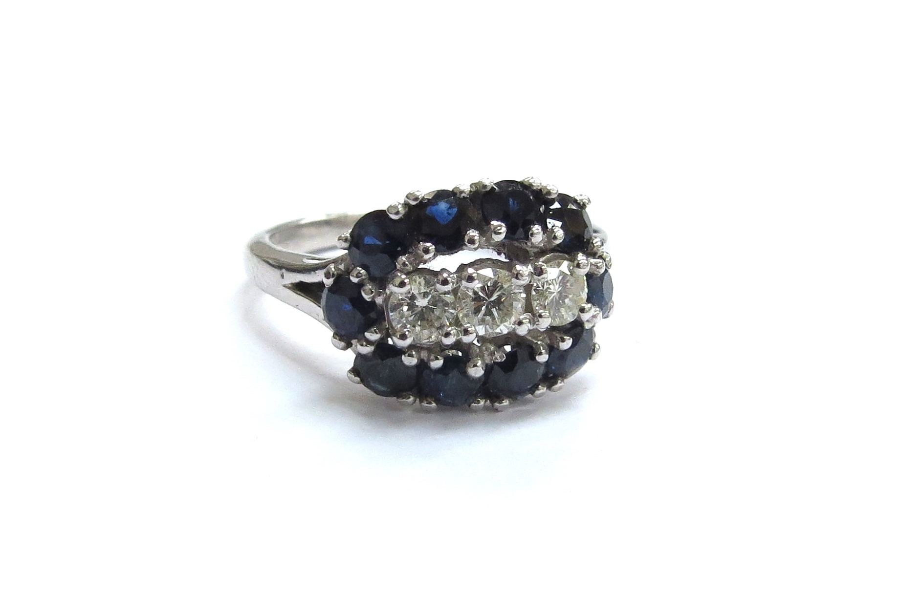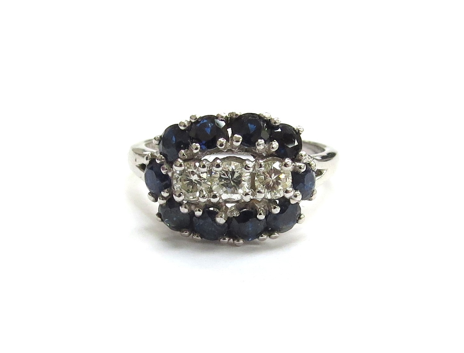 A white gold cluster ring, three diamonds to centre in an open frame of sapphires, stamped 18ct. Size O, 5.5g