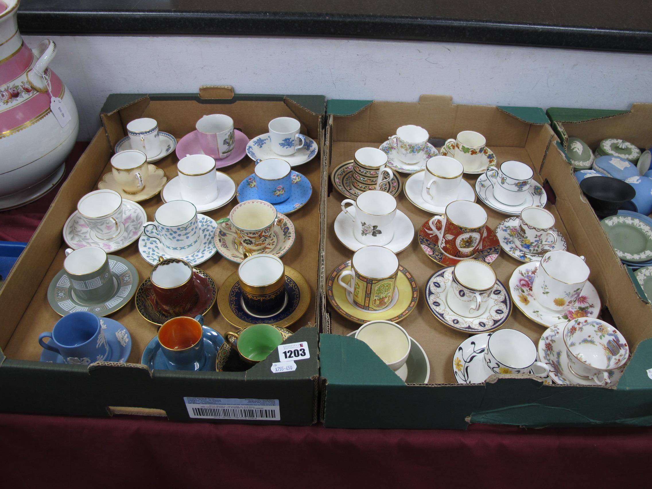 Large Collection of Coffee Cans and Tea Cups, all with matching saucer, to include jasper ware, Paragon, Royal Worcester, Mintons, Aynsley and Wedgwood etc (twenty nine pairs):- Two Boxes.